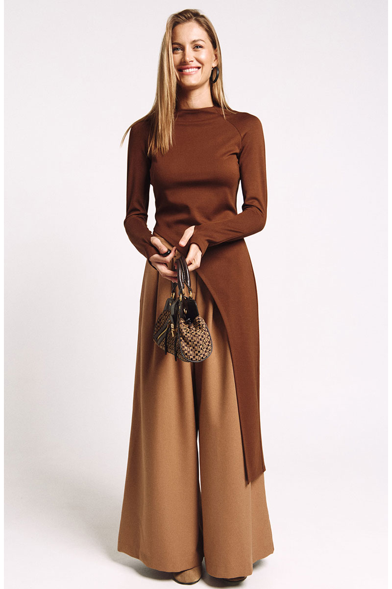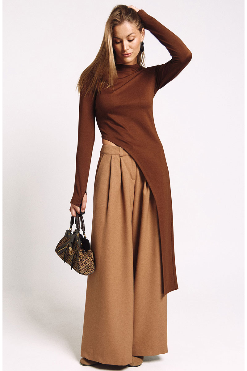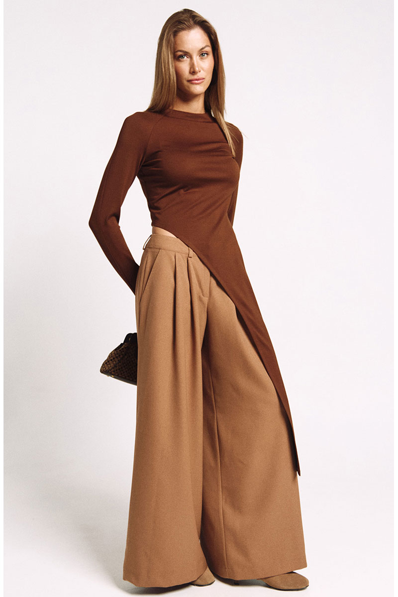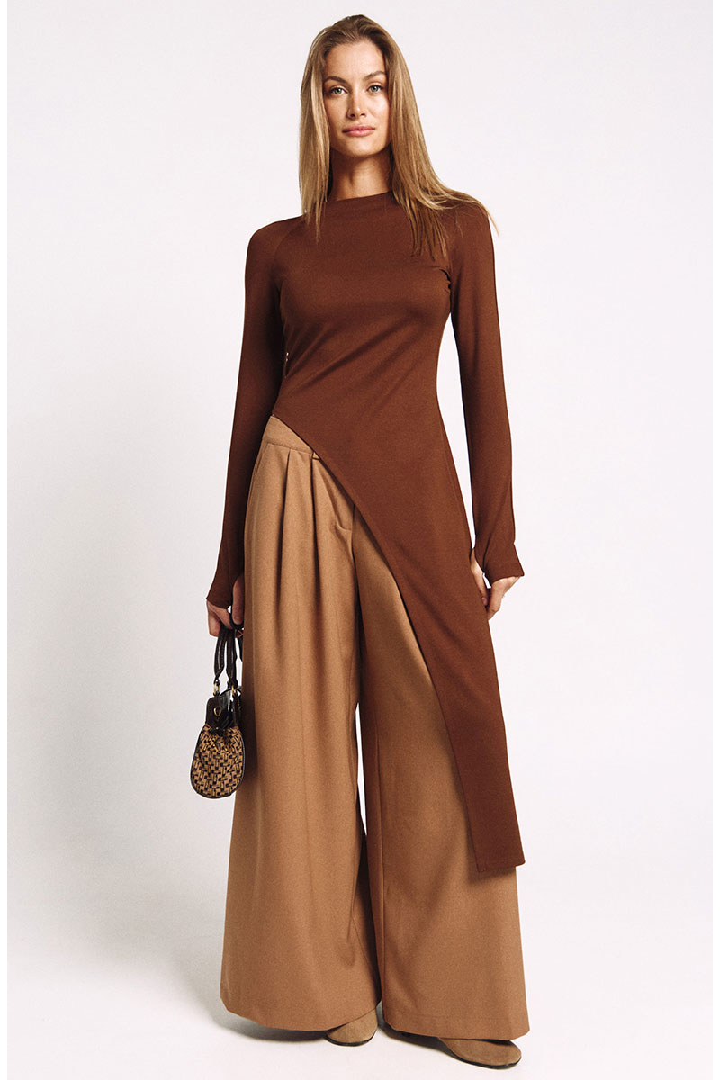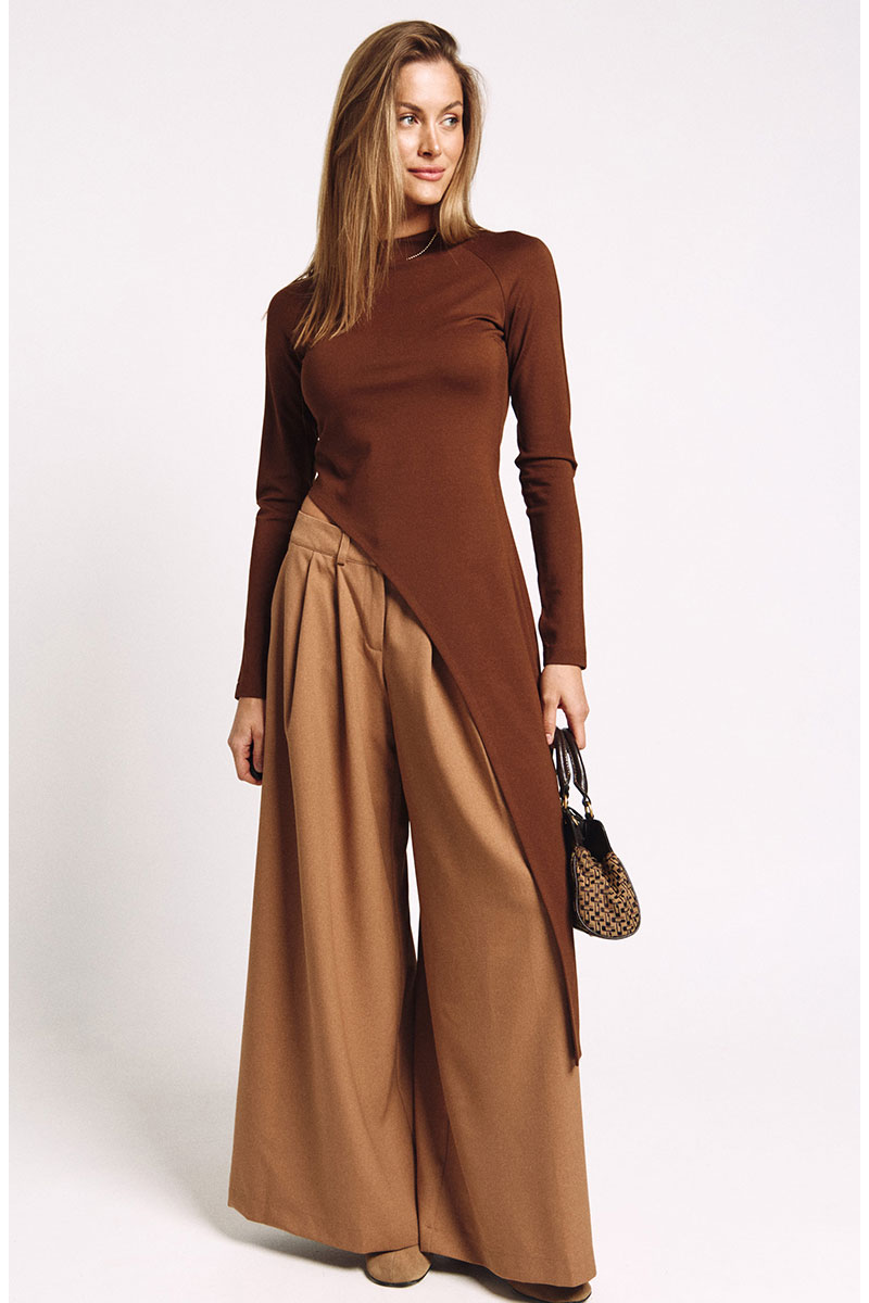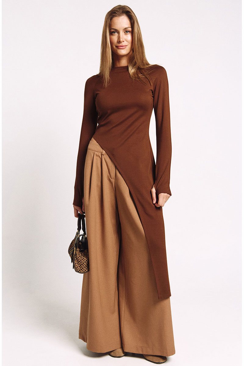 Лонгслив асимметричный, с удлиненной левой стороной. Рукав удлиненный с разрезом для большого пальца.Прилегающий силуэт, сзади - потайная молния в цвет изделия.