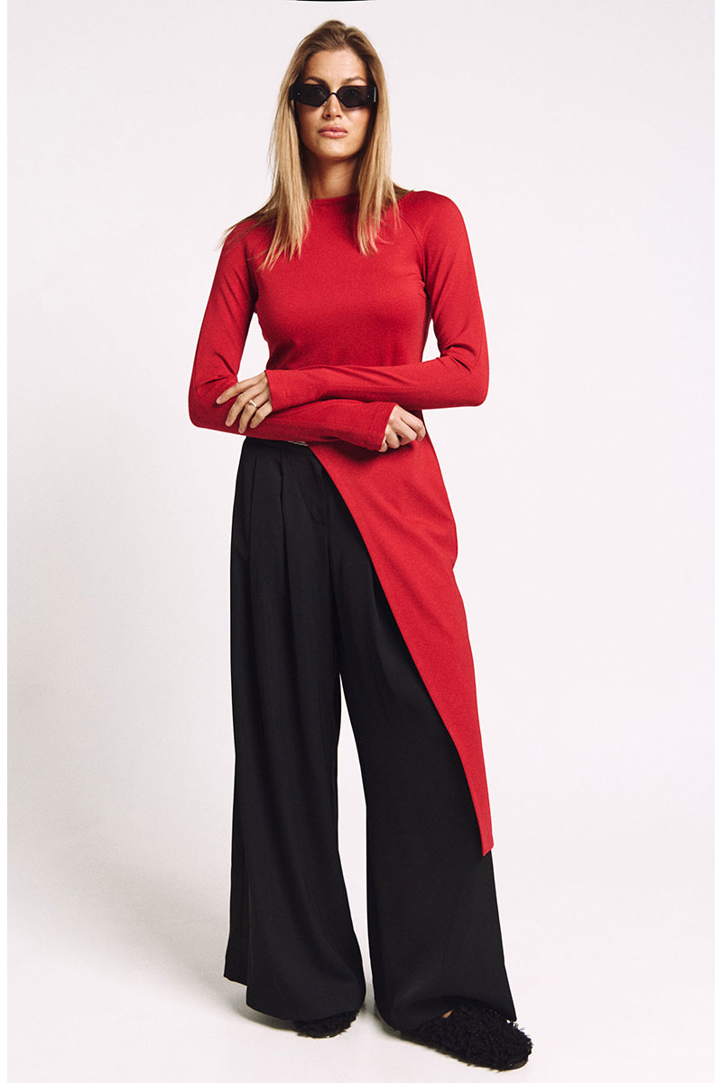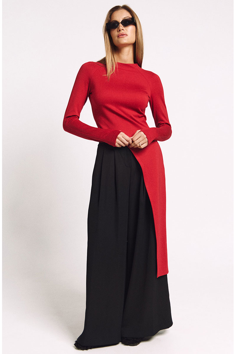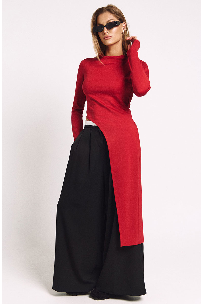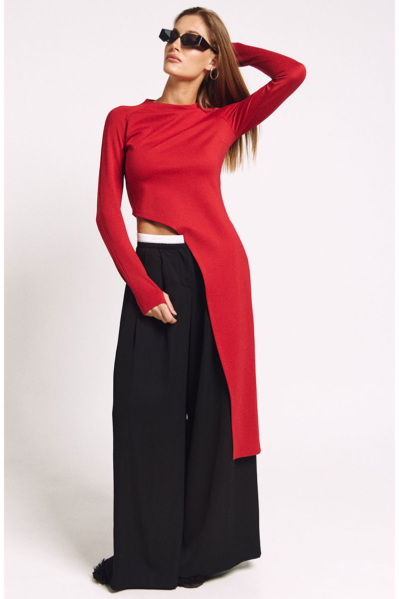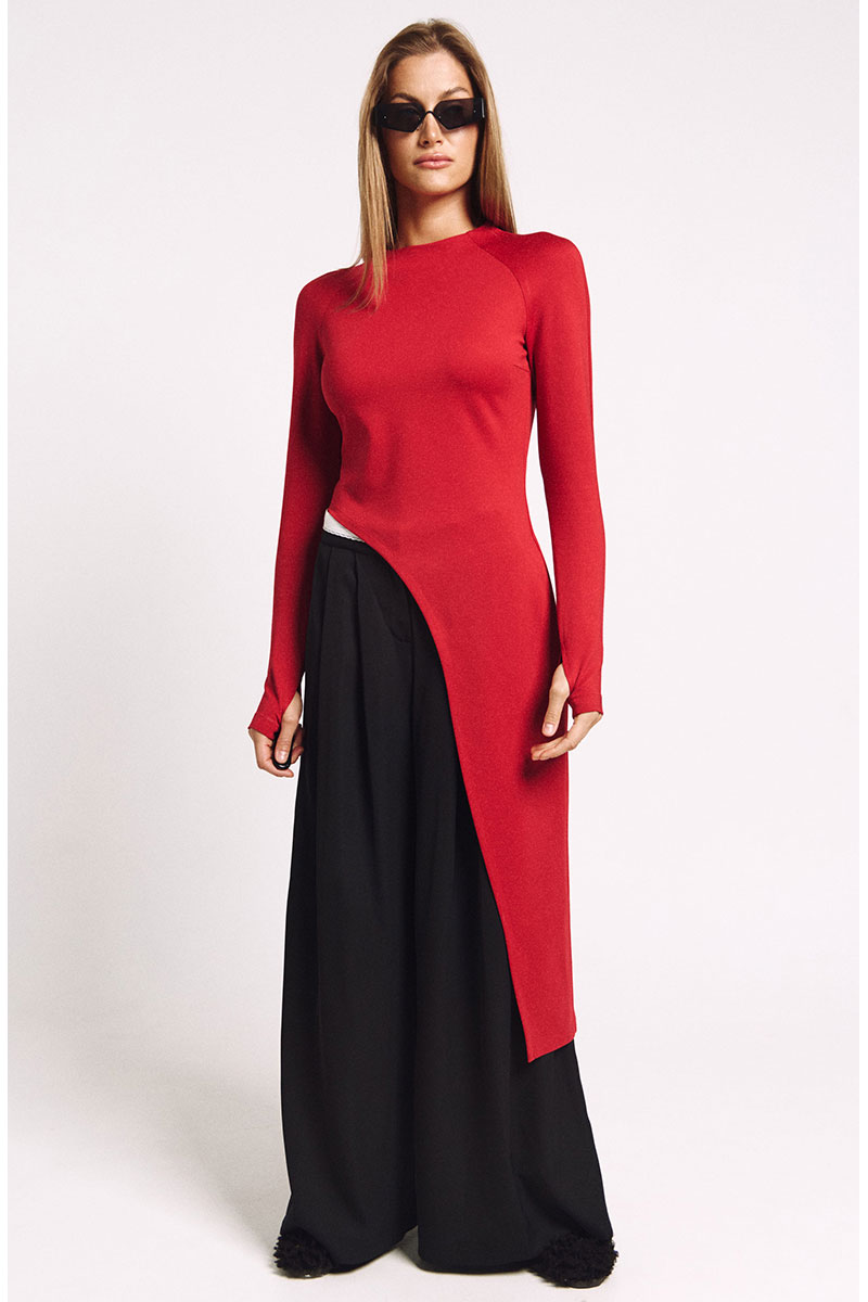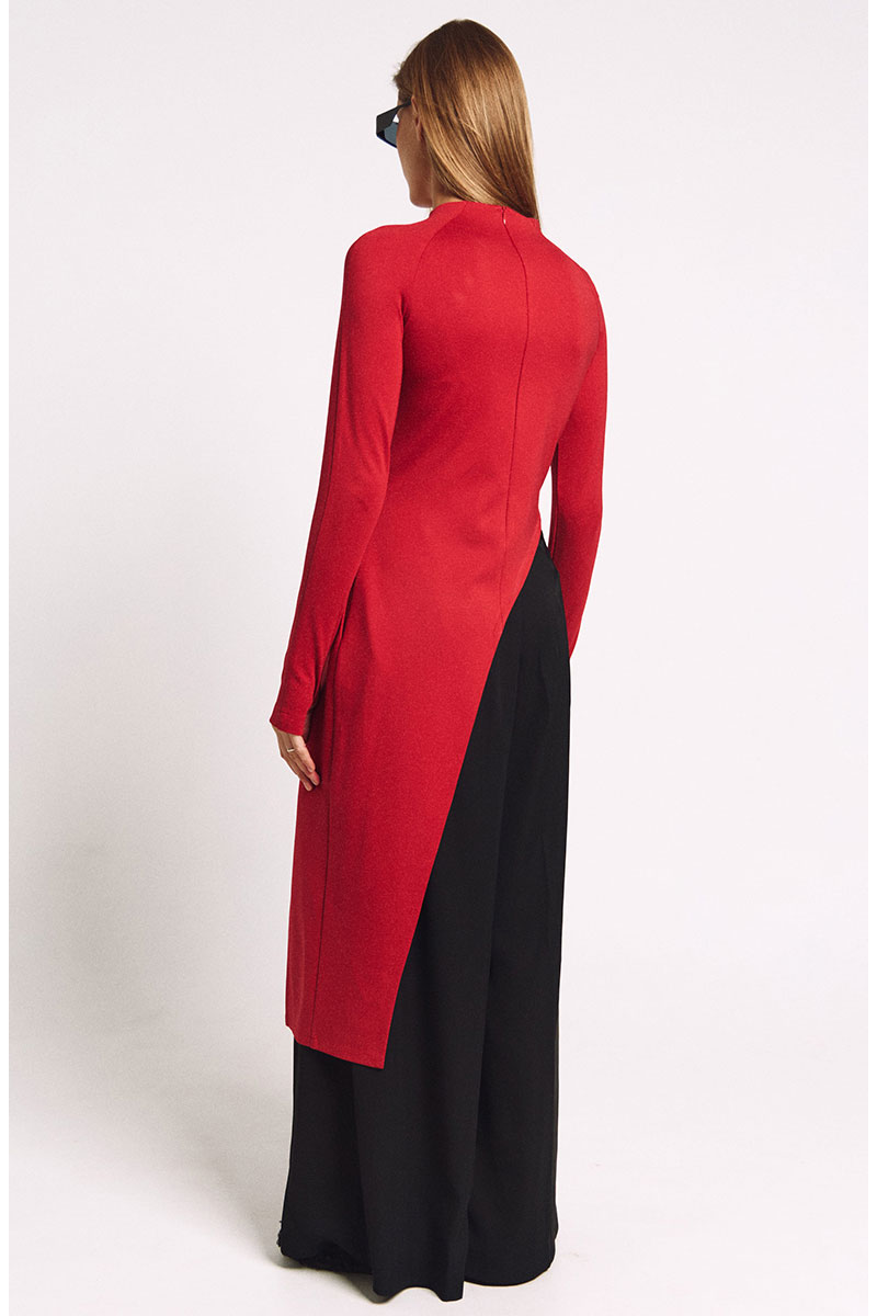 Лонгслив асимметричный, с удлиненной левой стороной. Рукав удлиненный с разрезом для большого пальца. Прилегающий силуэт, сзади - потайная молния в цвет изделия.