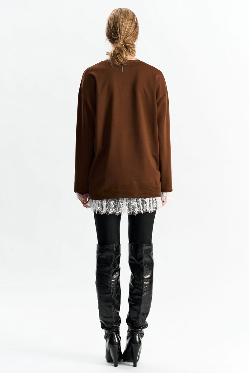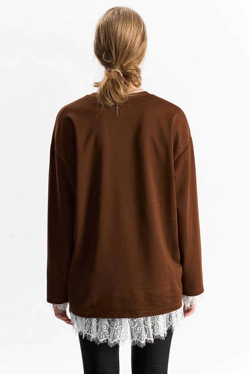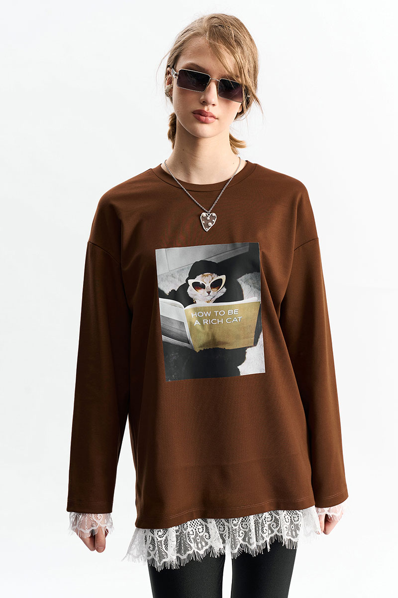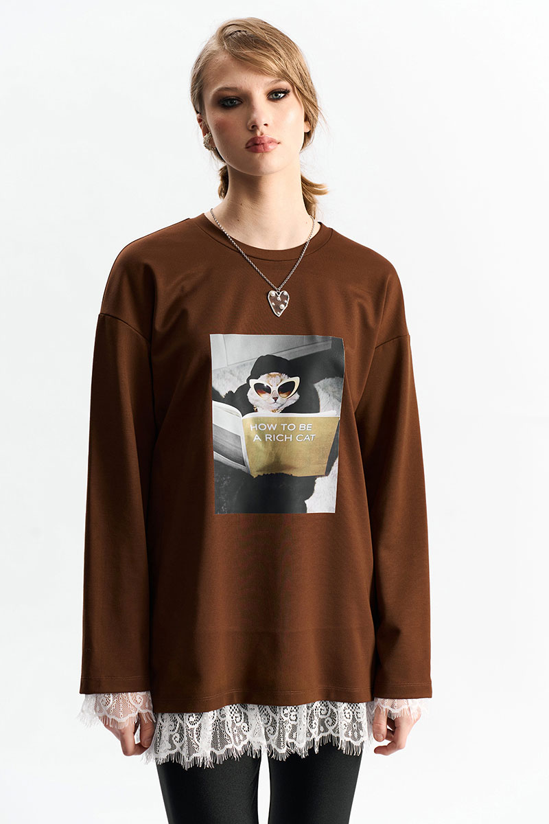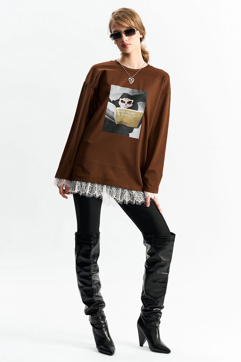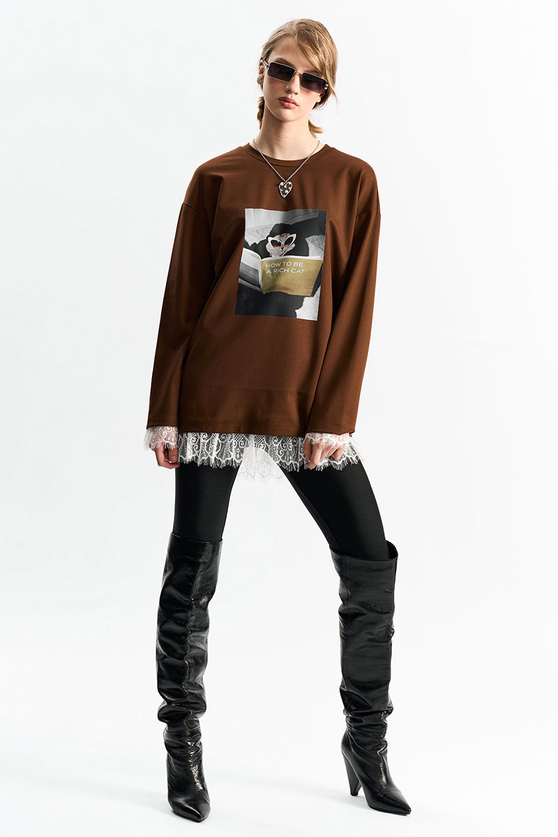 Лонгслив из плотного трикотажа цвета корица с печатью. Свободный крой. Рукава без кружева.