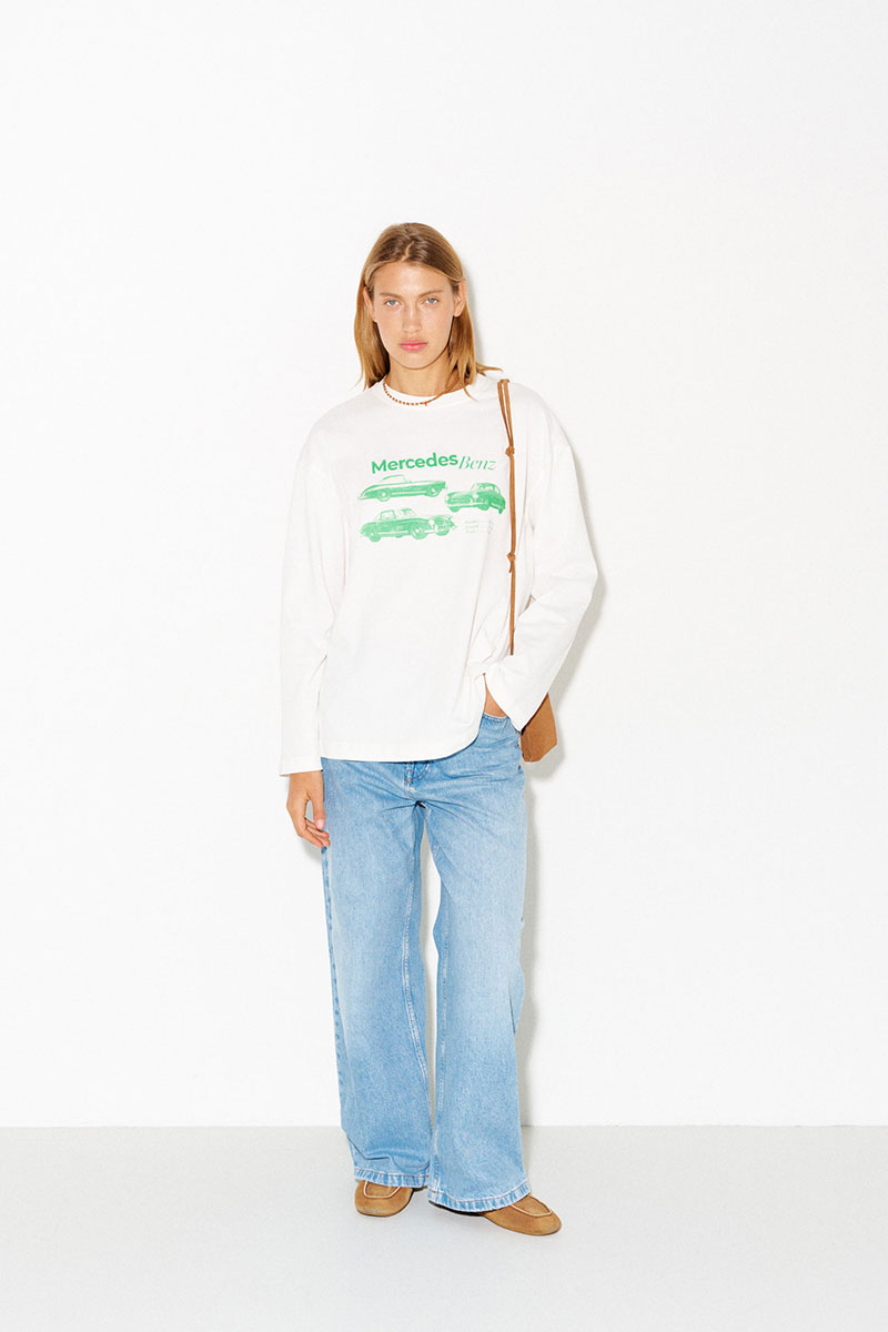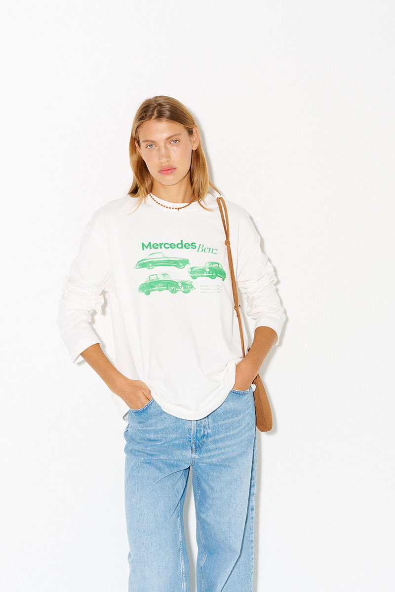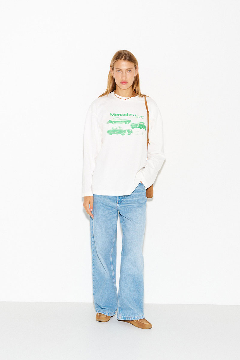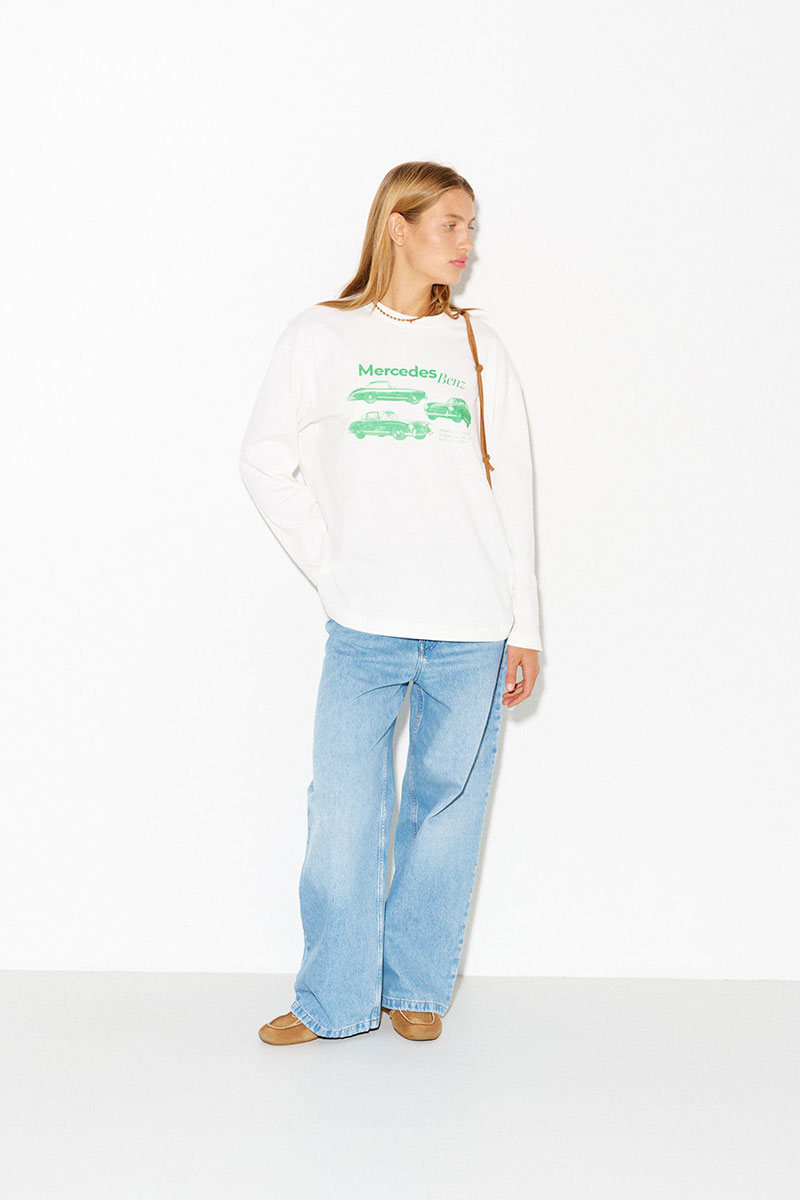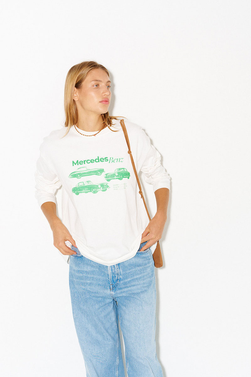 Лонгслив из хлопкового трикотажа в молочном цвете с ретроавто Mercedes-Benz.