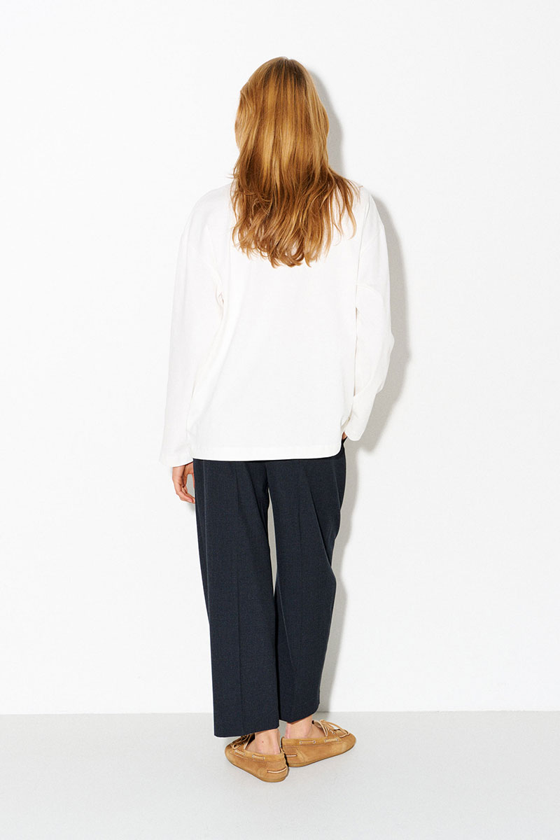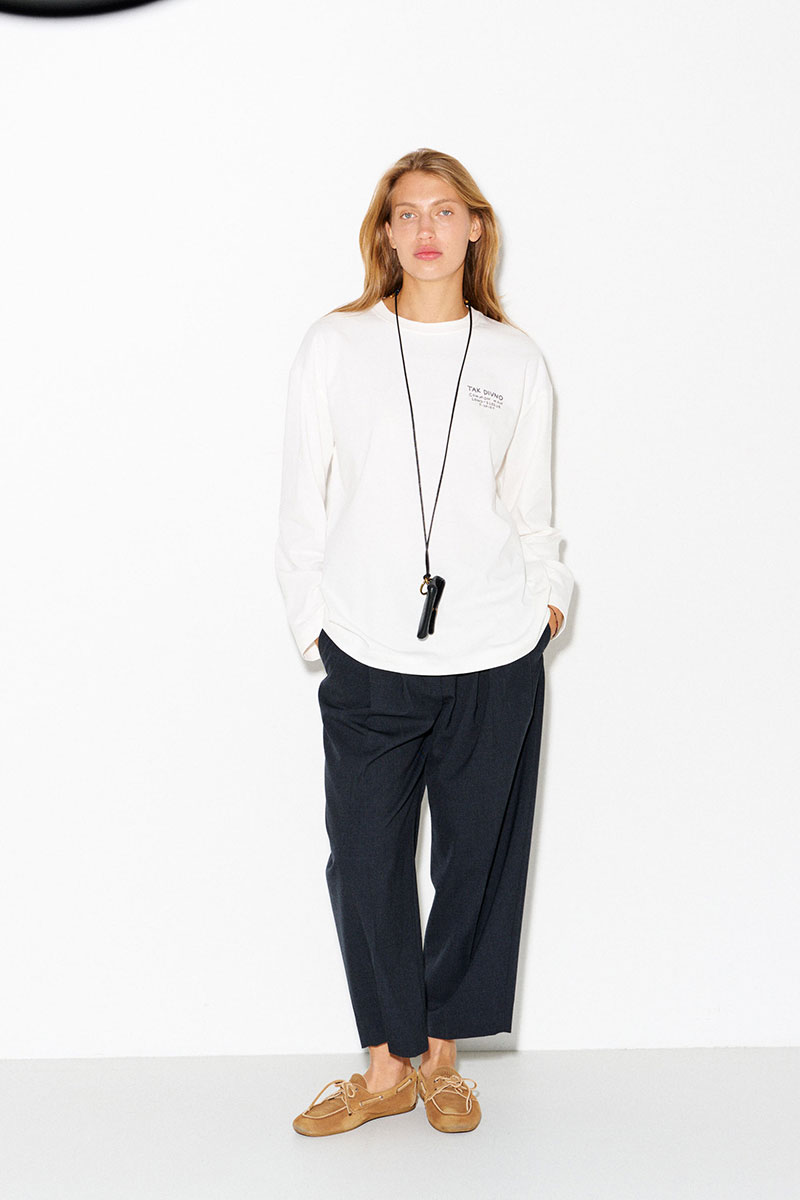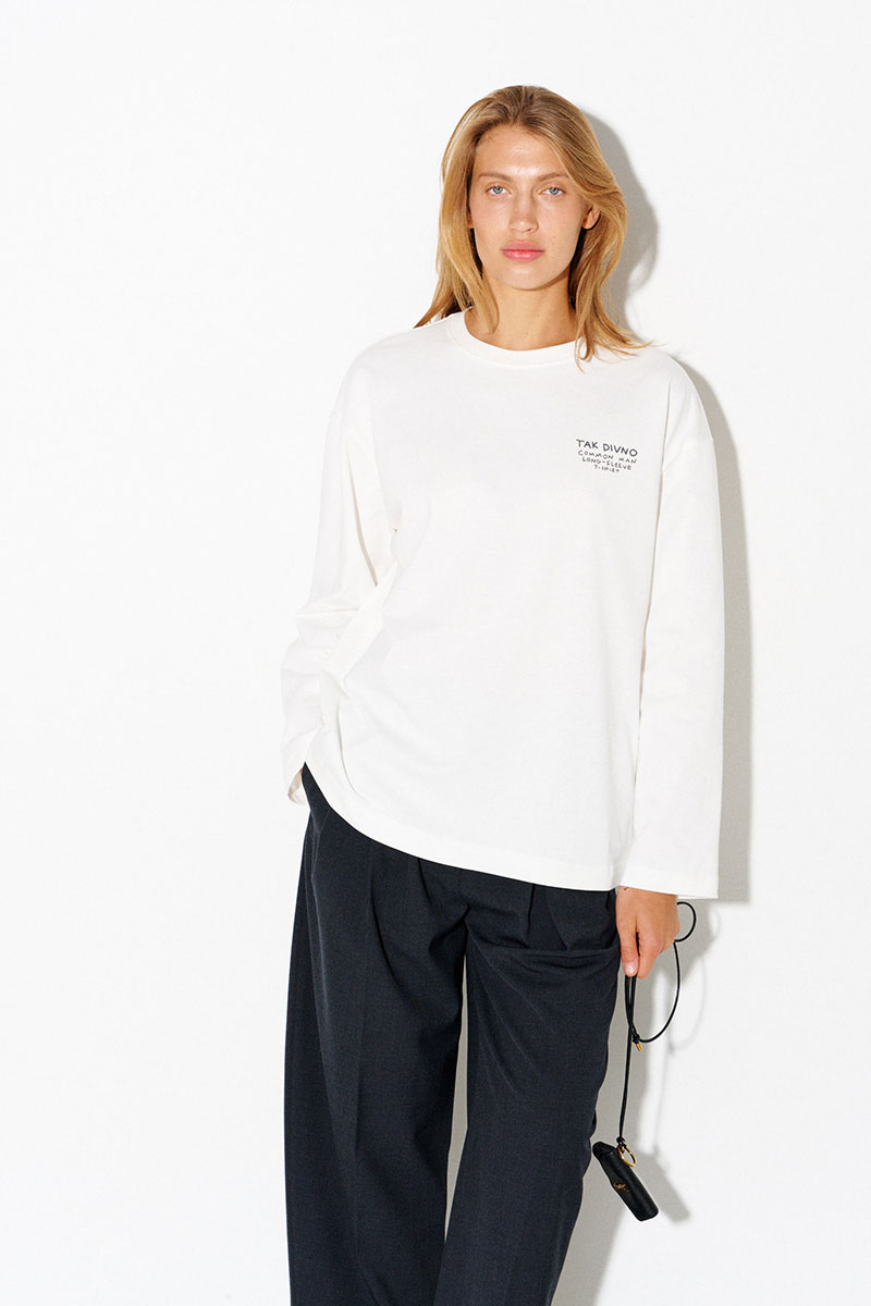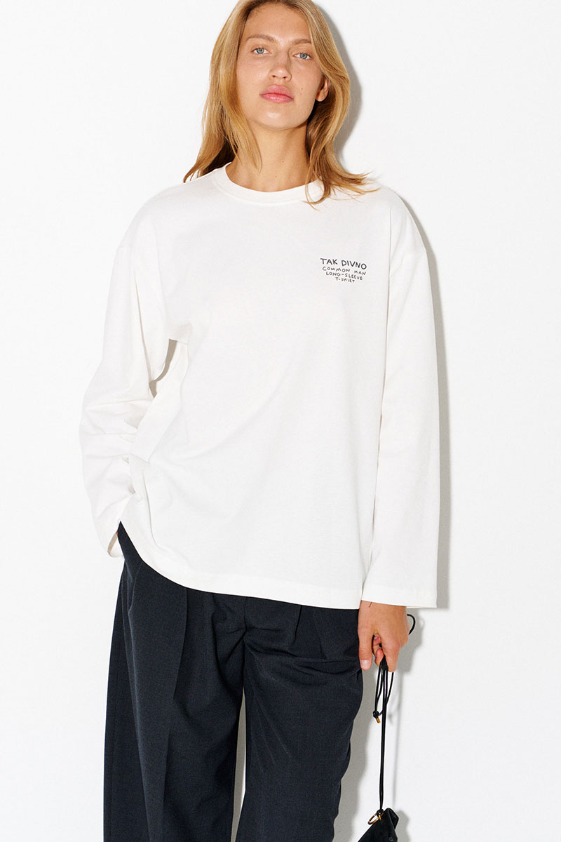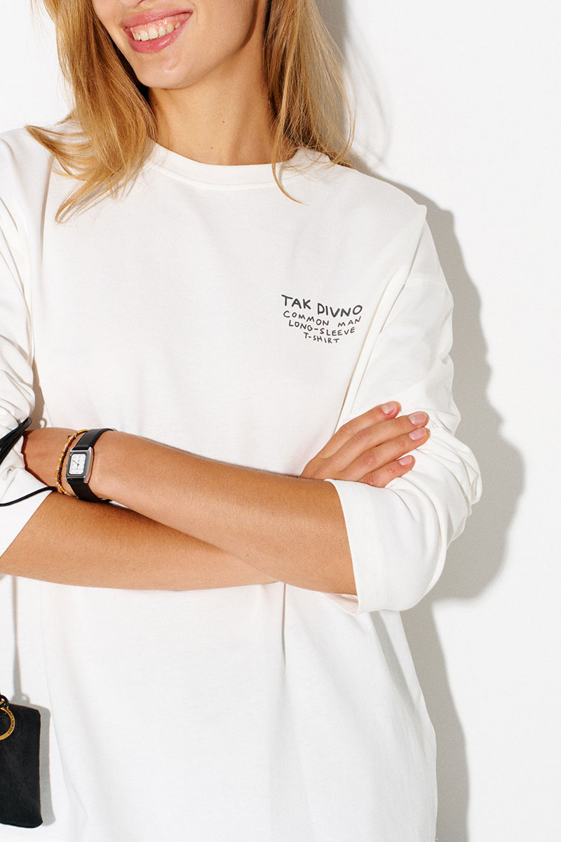 Молочный базовый лонгслив из 100% хлопка с надписью «Сommon man long-sleeve t-shirt» («Лонгслив простого человека»).