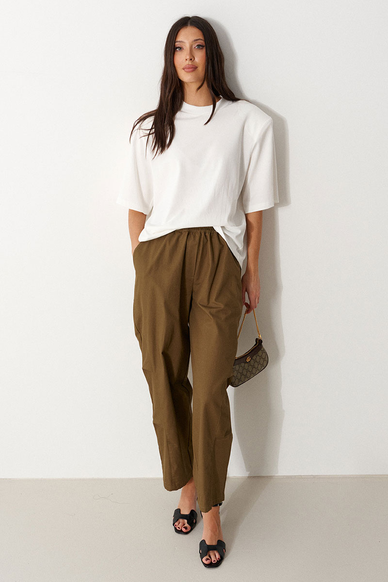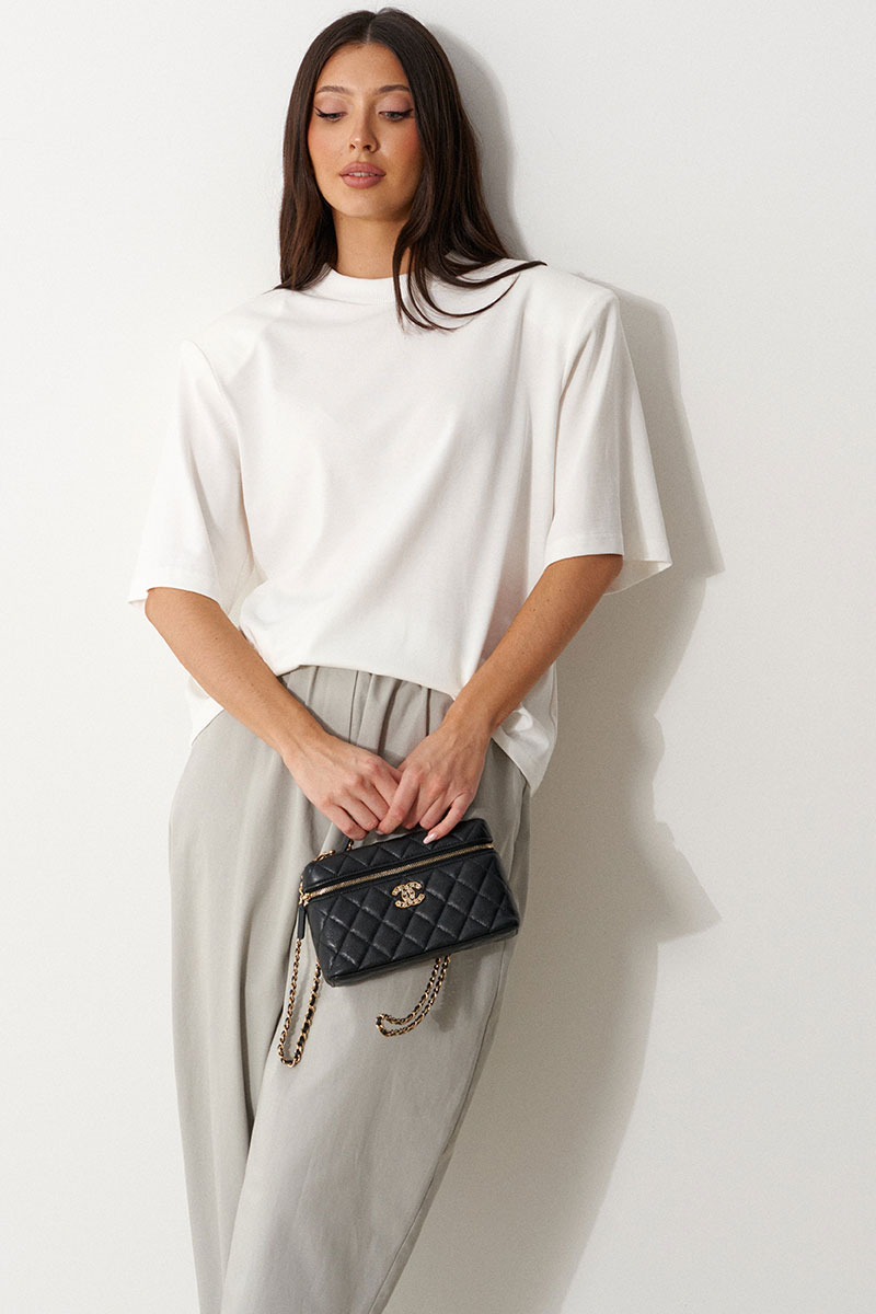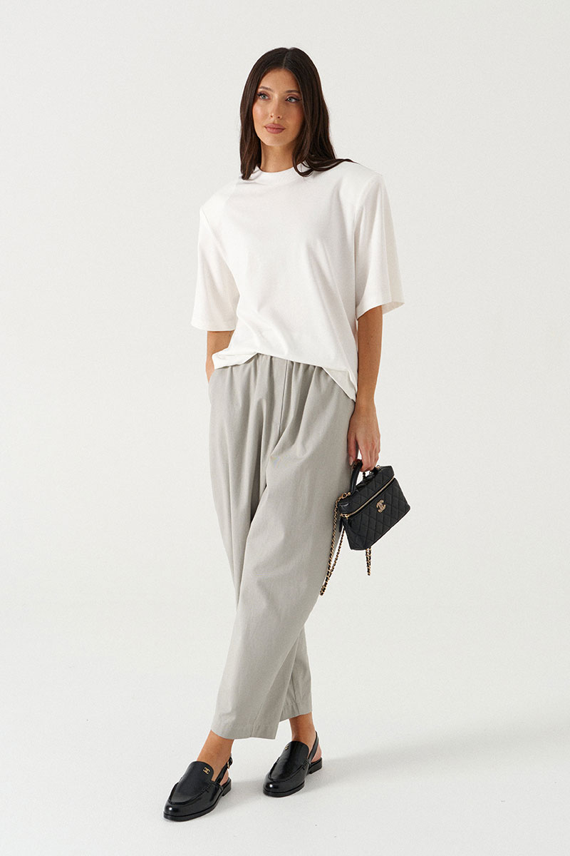 Футболка прямого силуэта. Выполнен из хлопкового полотна белого цвета. Характеристика: вырез горловины круглый с притачной планкой-резинкой. Рукав одношовный, втачной, короткий. Подплечники.