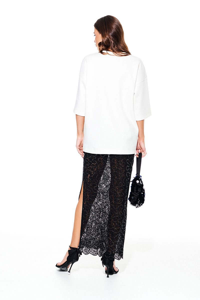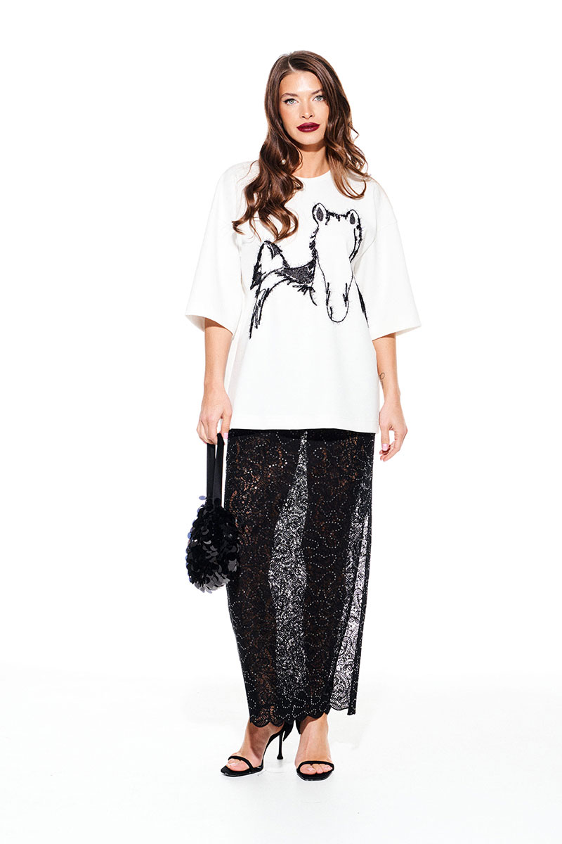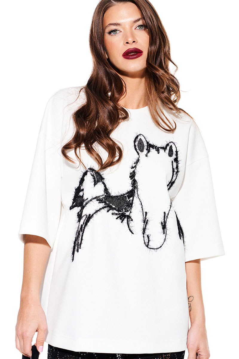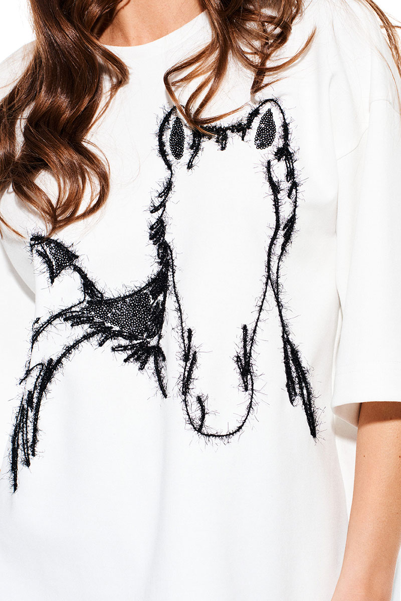 Джемпер из трикотажного полотна, прямого силуэта, свободный, с круглым вырезом горловины. Перед и спинка цельные. По переду выполнена вышивка "Лошадь".