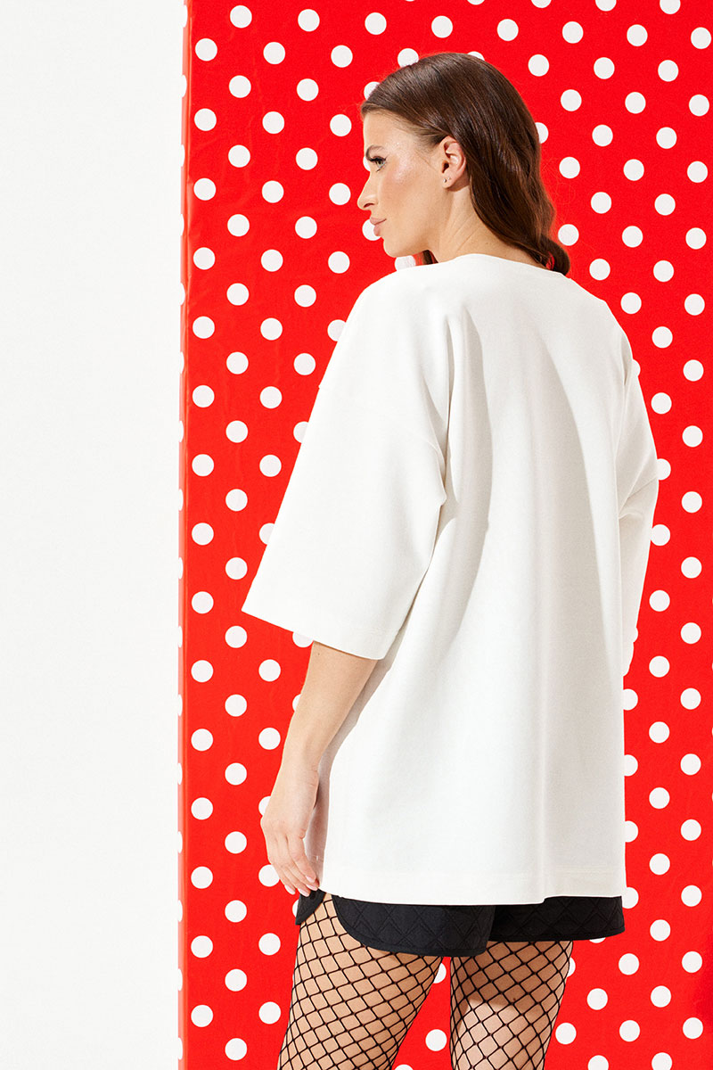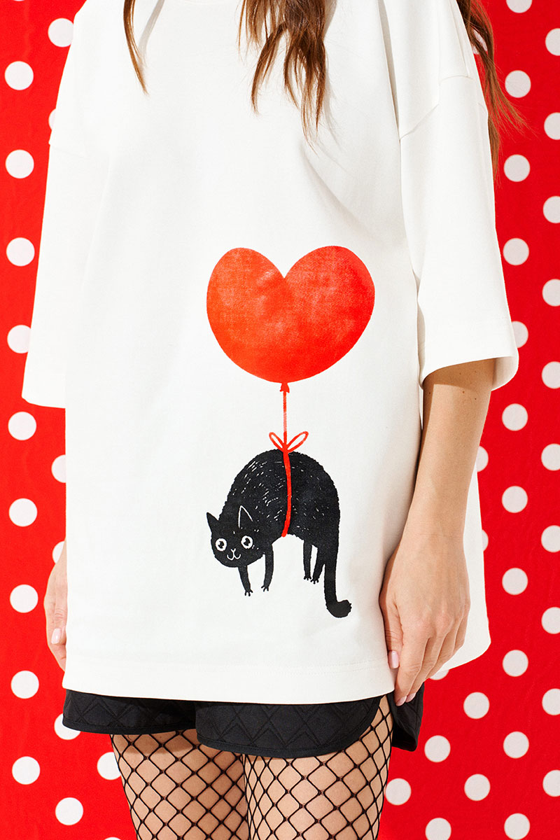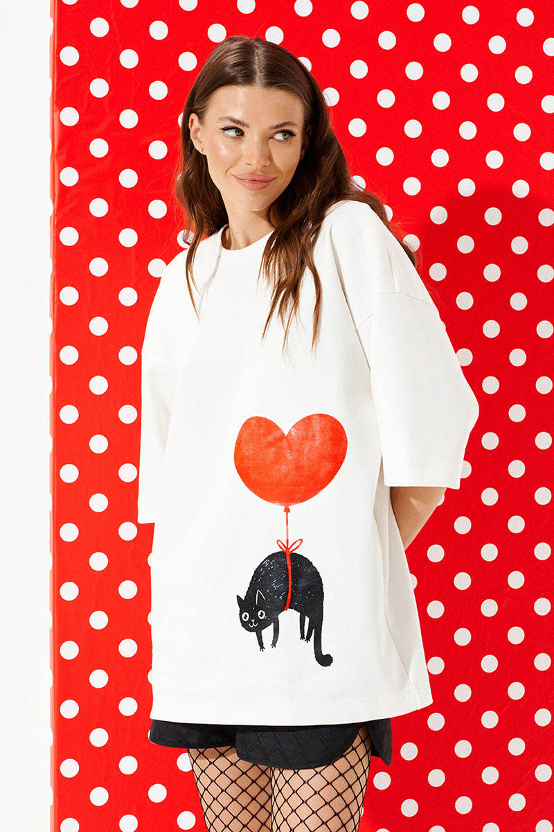 Джемпер из трикотажного полотна свободного объема, прямого силуэта, с круглым вырезом горловины. Перед и спинка цельные. По переду выполнена печать «Кот на воздушном шаре». Рукав втачной, одношовный, короткий.