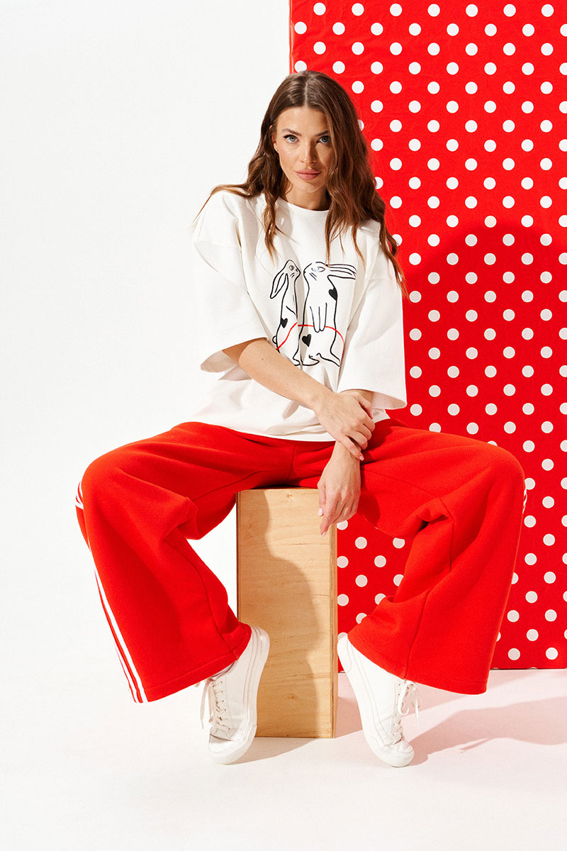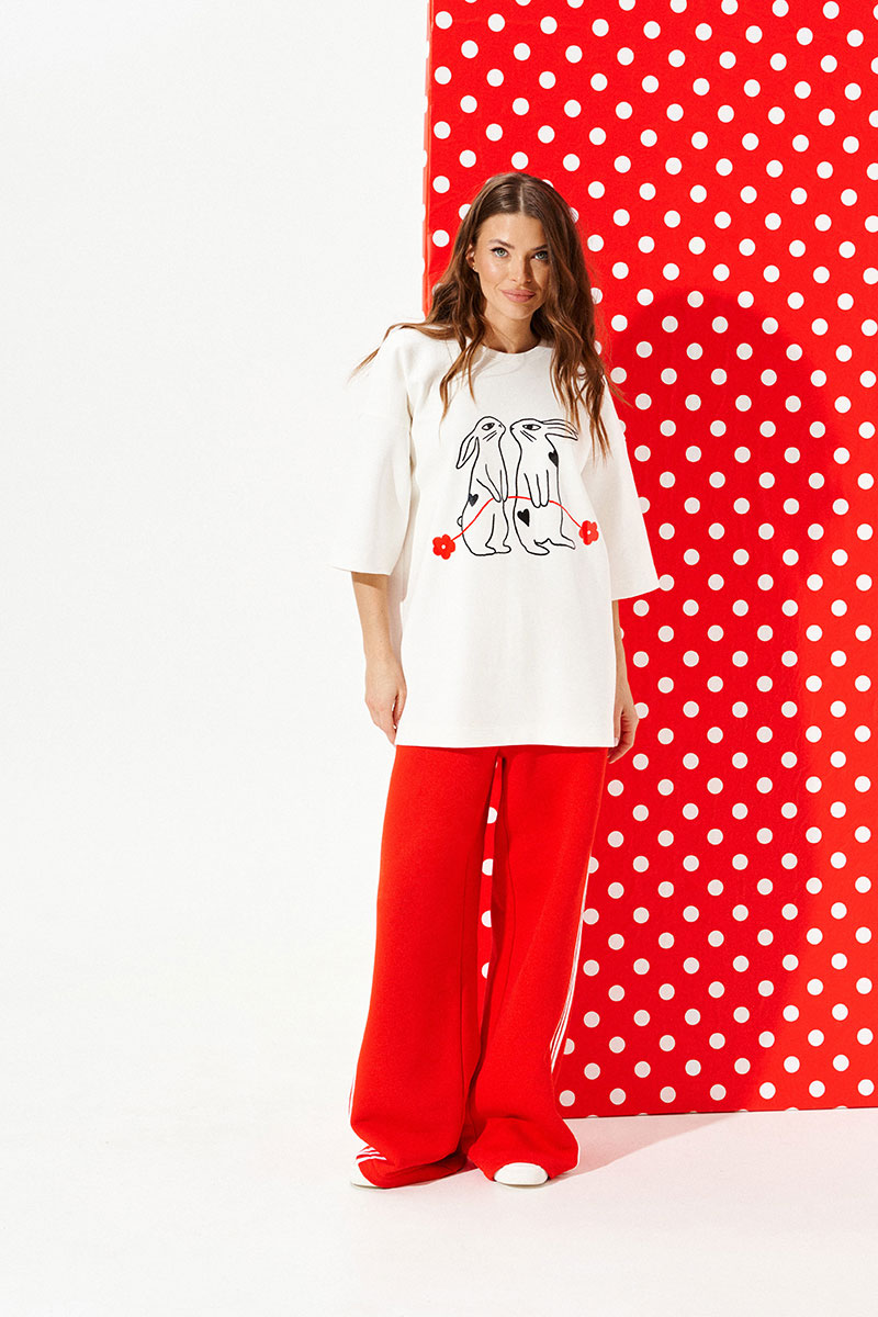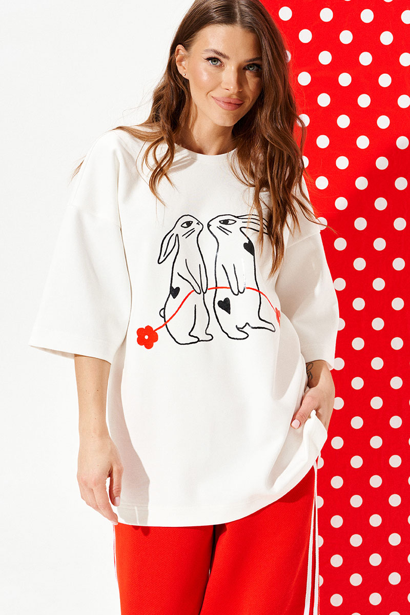 Джемпер из трикотажного полотна свободного объема, прямого силуэта, с круглым вырезом горловины.Перед и спинка цельные. По переду выполнена печать «Зайцы». Рукав втачной, одношовный, короткий.