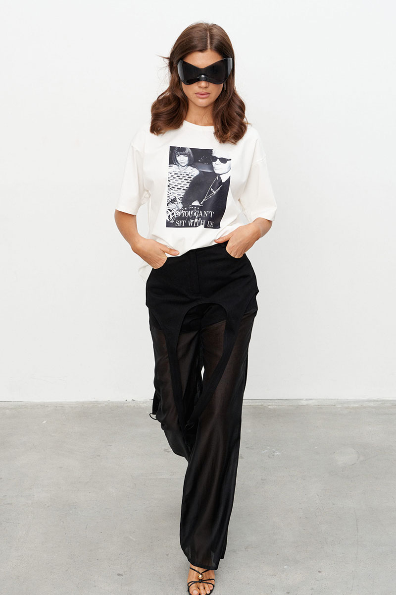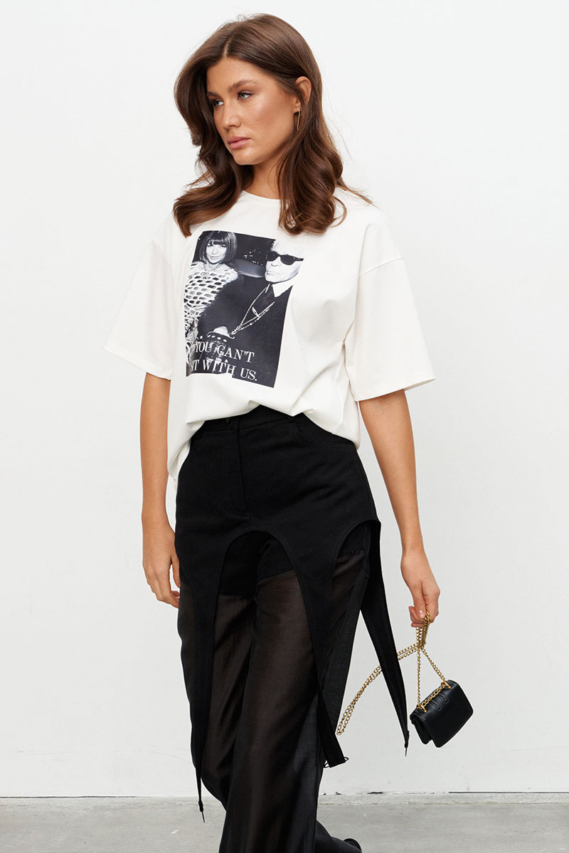 Оверсайз футболка из плотного трикотажа с контрастным принтом «Карл». Линия плеча спущена, горловина отделана эластичной бейкой.