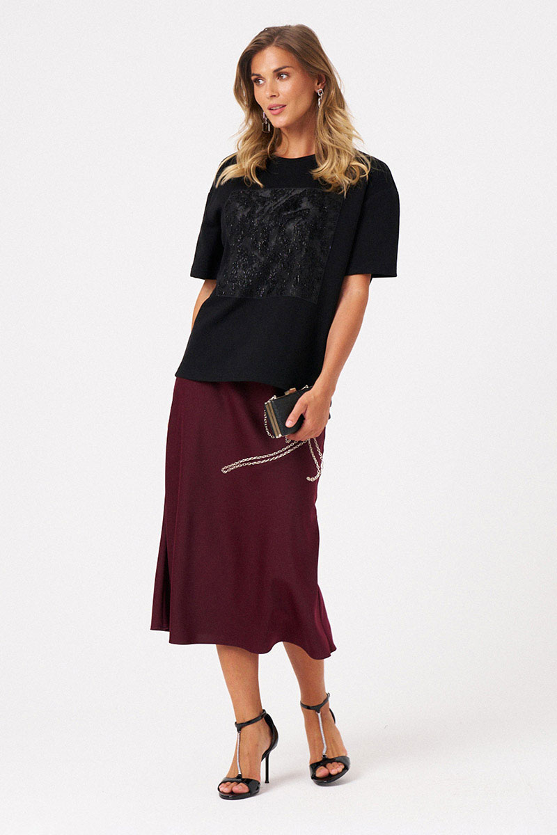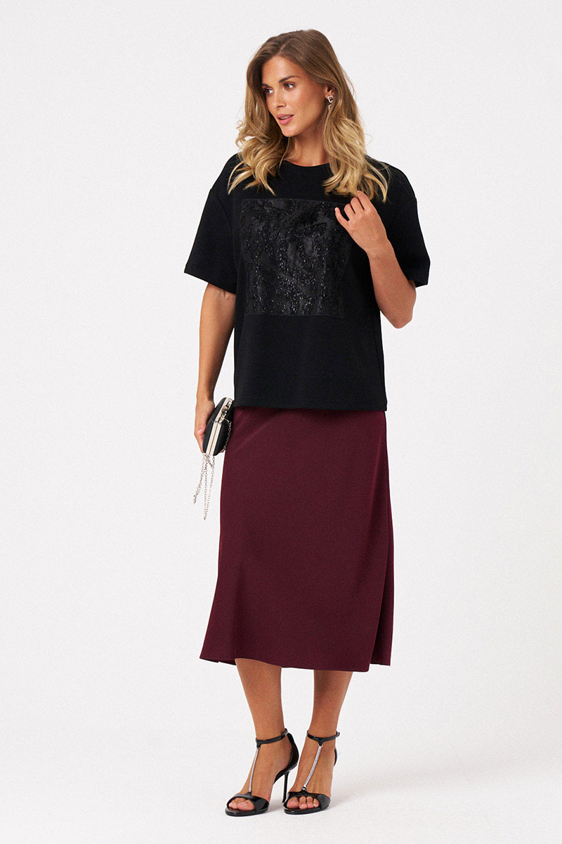 Женский джемпер из поливискозного трикотажного полотна, идеально подходящий для повседневной носки. Модель выполнена прямого силуэта, что обеспечивает свободу движений и комфорт. На передней части джемпера расположен декоративный элемент в виде квадрата, внутренняя часть которого выполнена из ткани с эффектом «травки», придавая изделию оригинальность и текстурность.