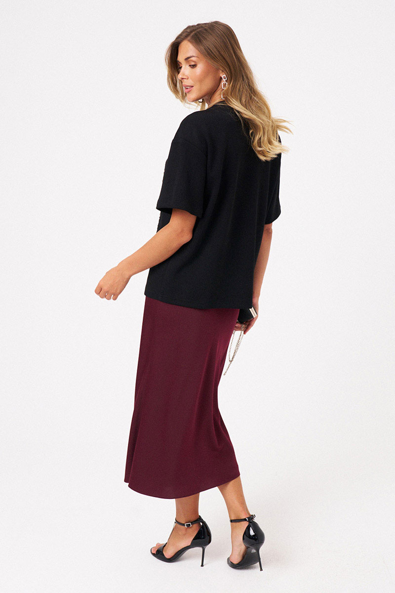 Горловина обработана притачной тесьмой, что гарантирует аккуратный и прочный финиш. Линия плеча спущена, создавая расслабленный и современный образ. Рукава втачные, расположены на уровне локтя, что добавляет стилю модную асимметрию и удобство в носке.
