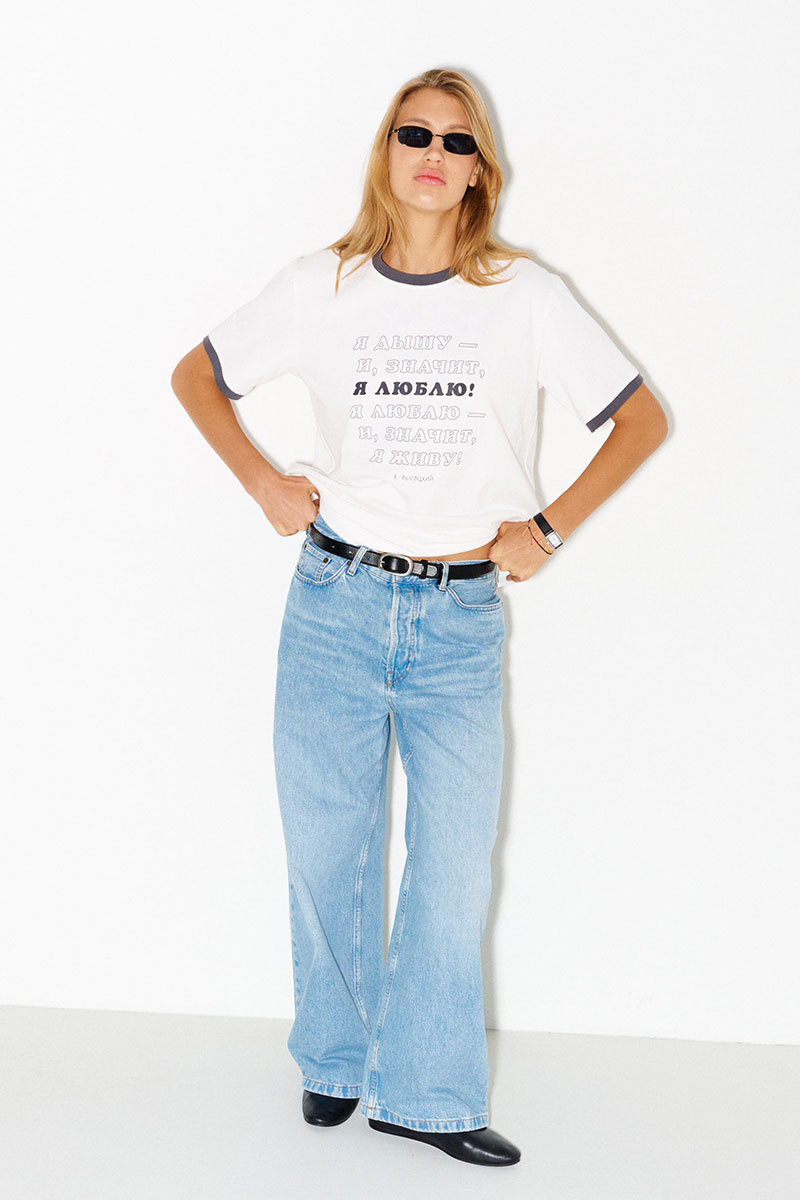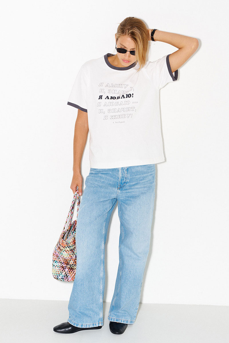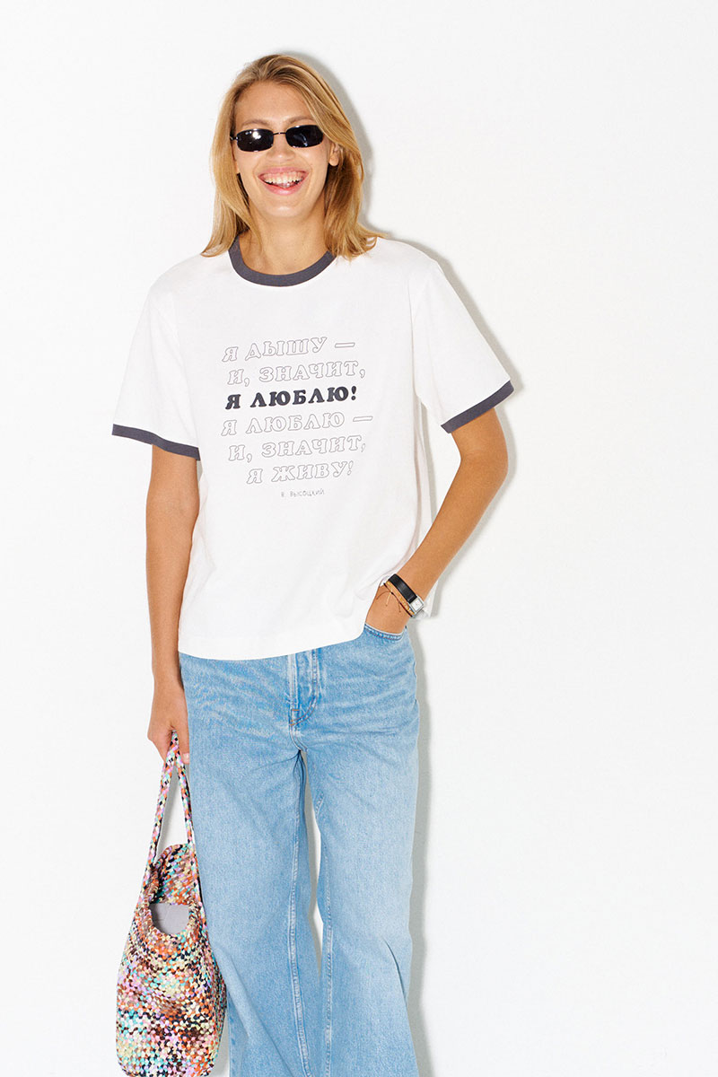 Белая хлопковая футболка с контрастными кантами. Принт с цитатой песни В.Высоцкого: "Я дышу – и, значит, я люблю! Я люблю – и, значит, я живу!"