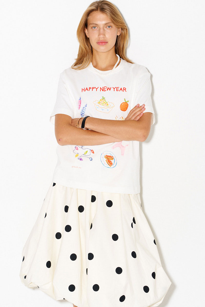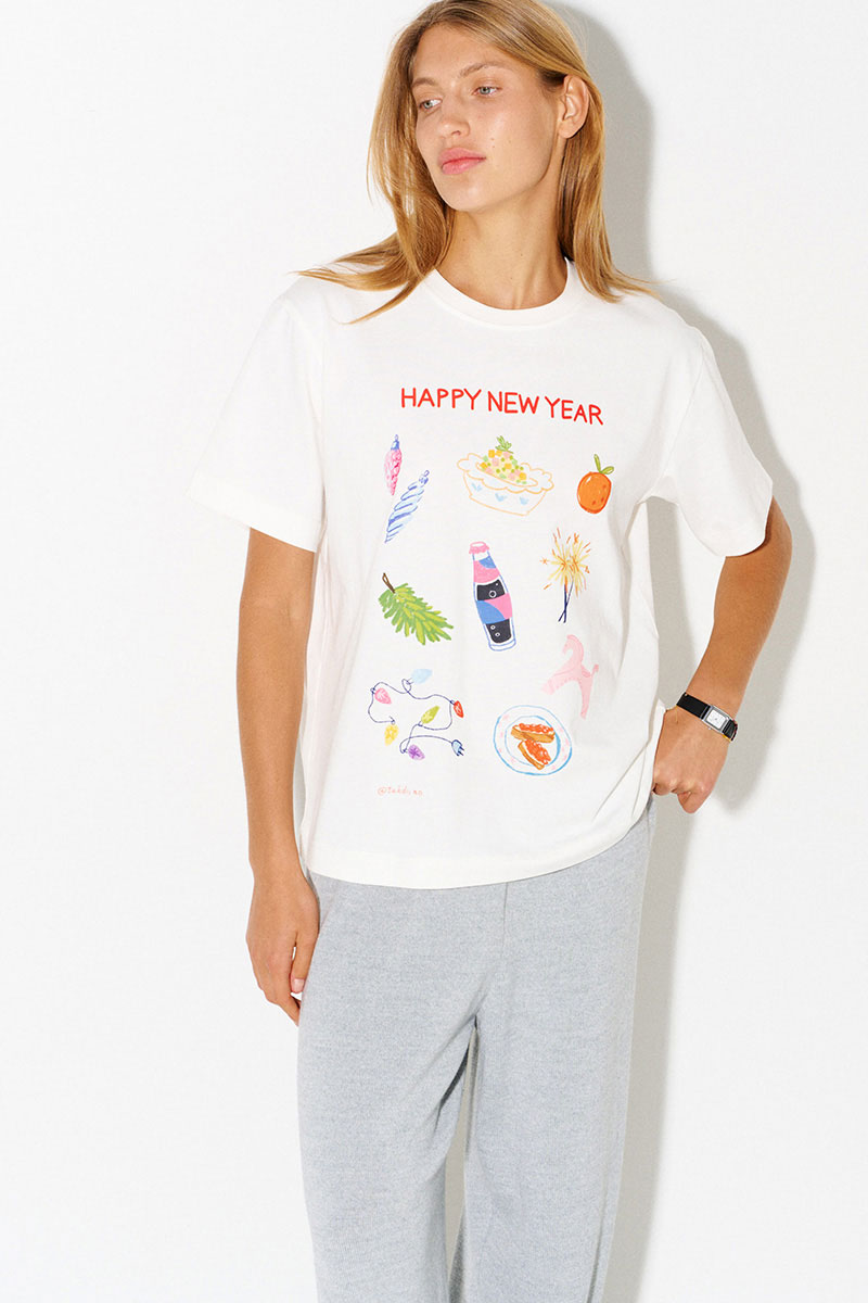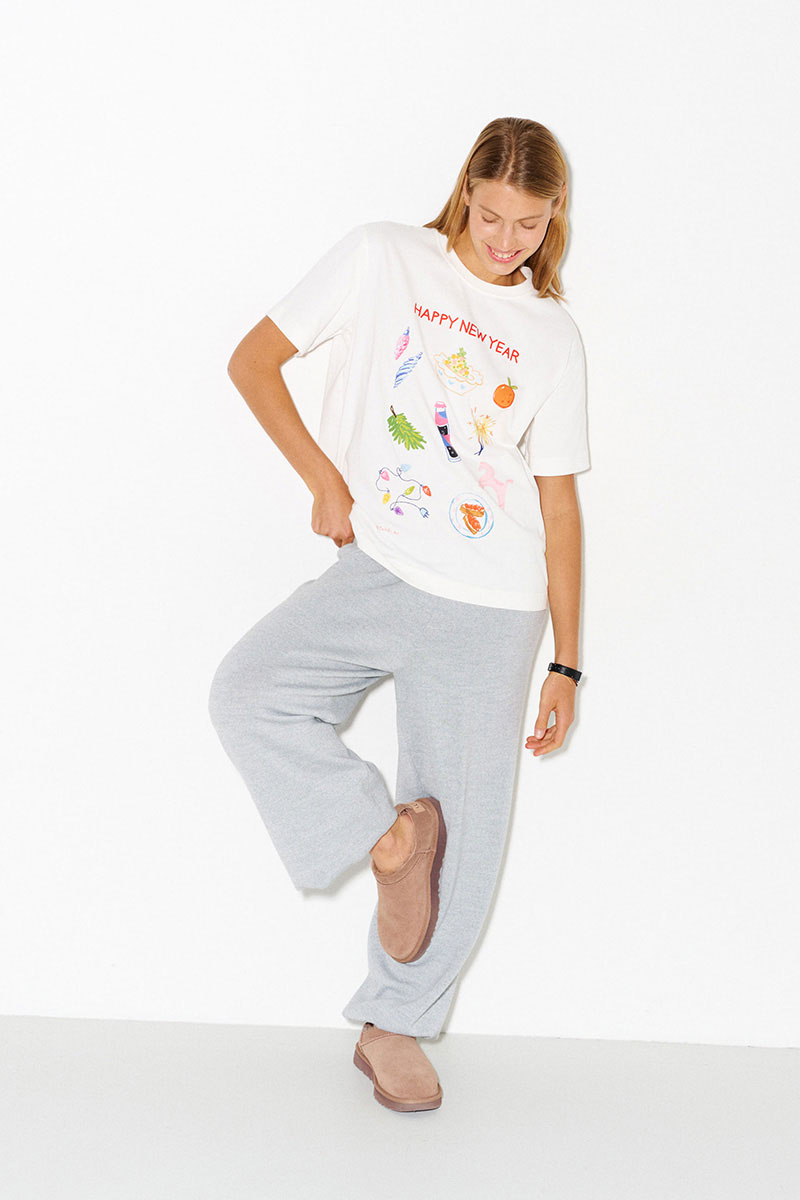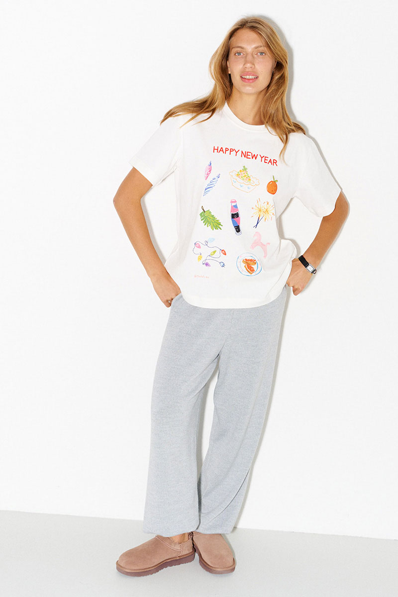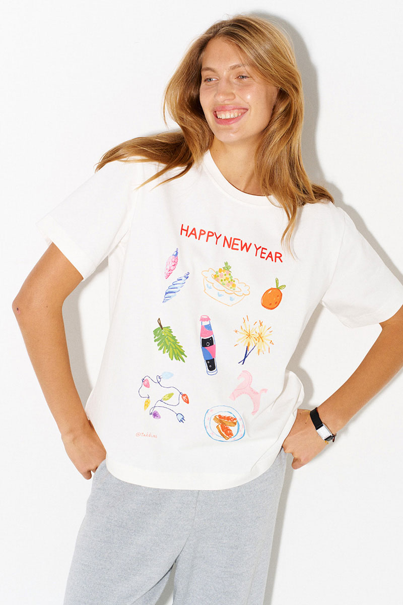 Футболка с новогодним принтом и надписью «Happy New Year». Создаст настроение и дополнит уютные образы в сезон праздников.