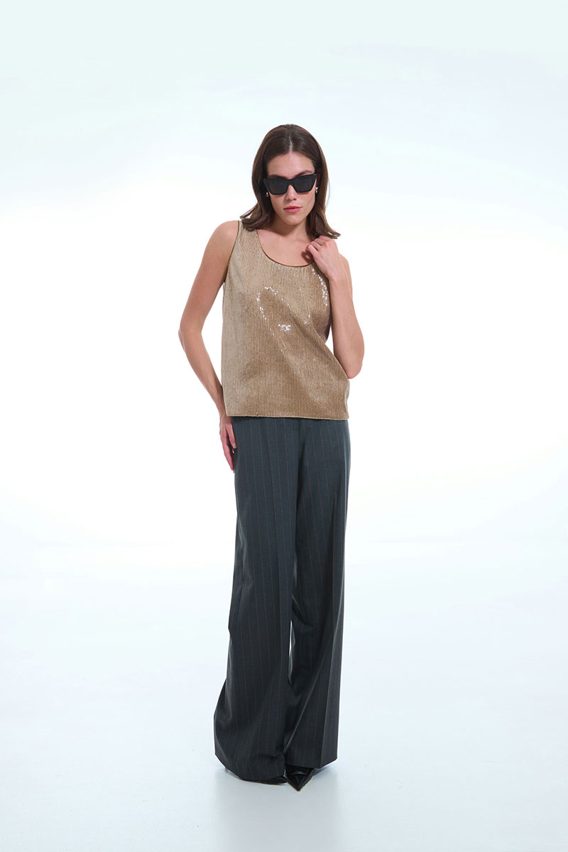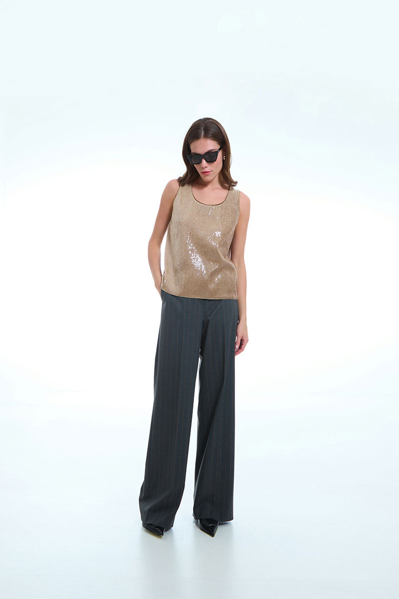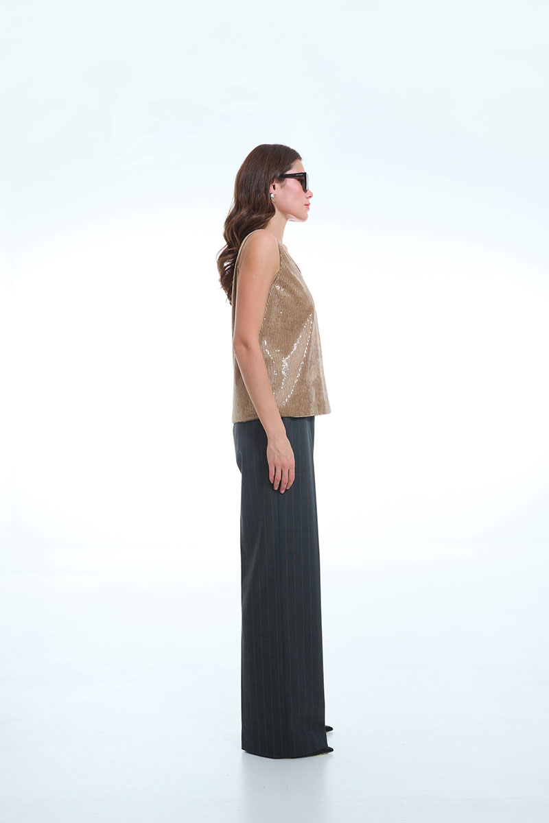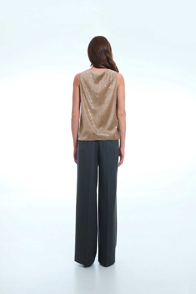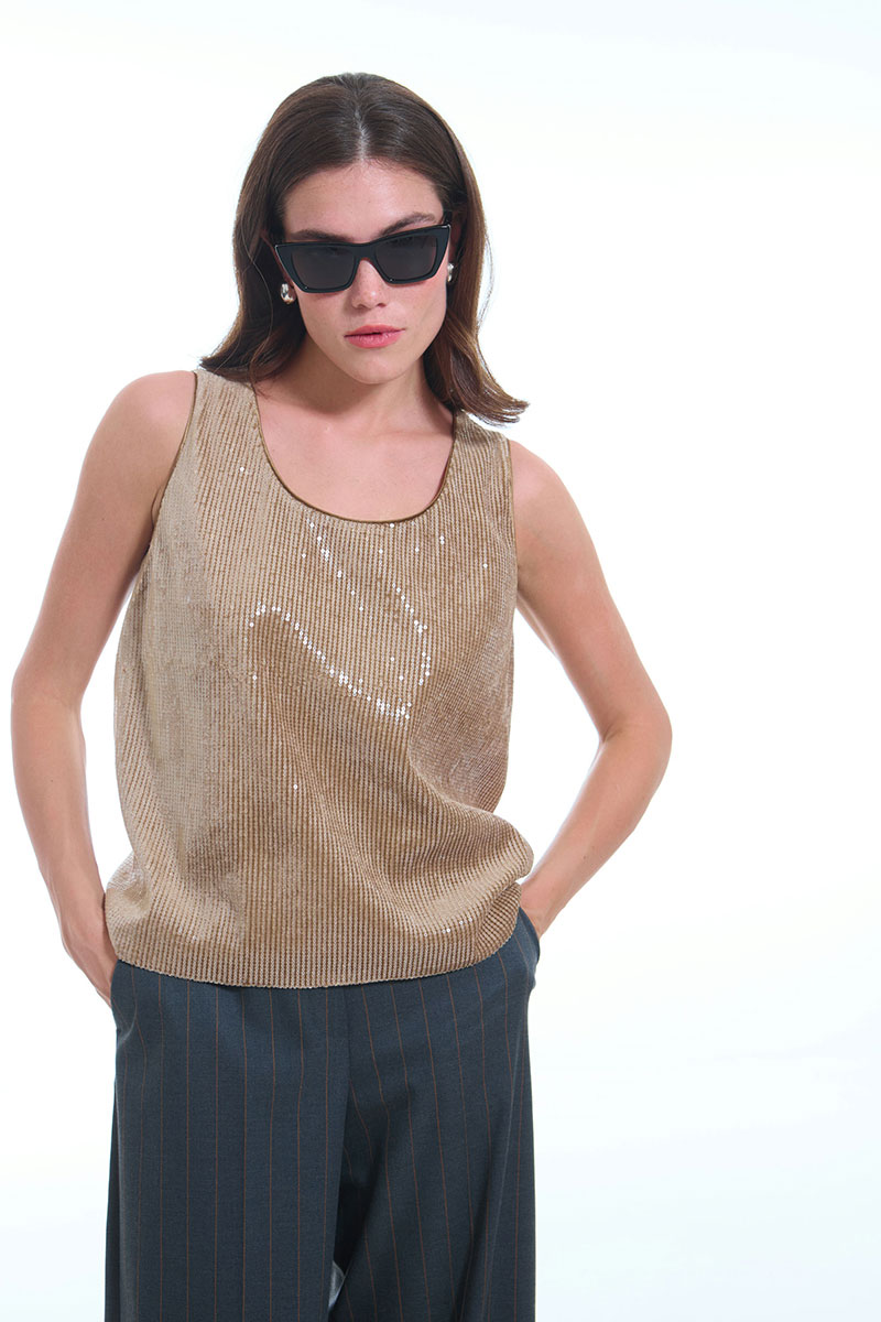 Блузка женская, прямого силуэта из трикотажного полотна с пайетками, на подкладке. Спинка со средним швом.