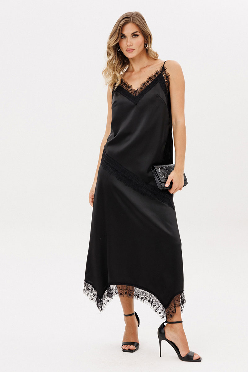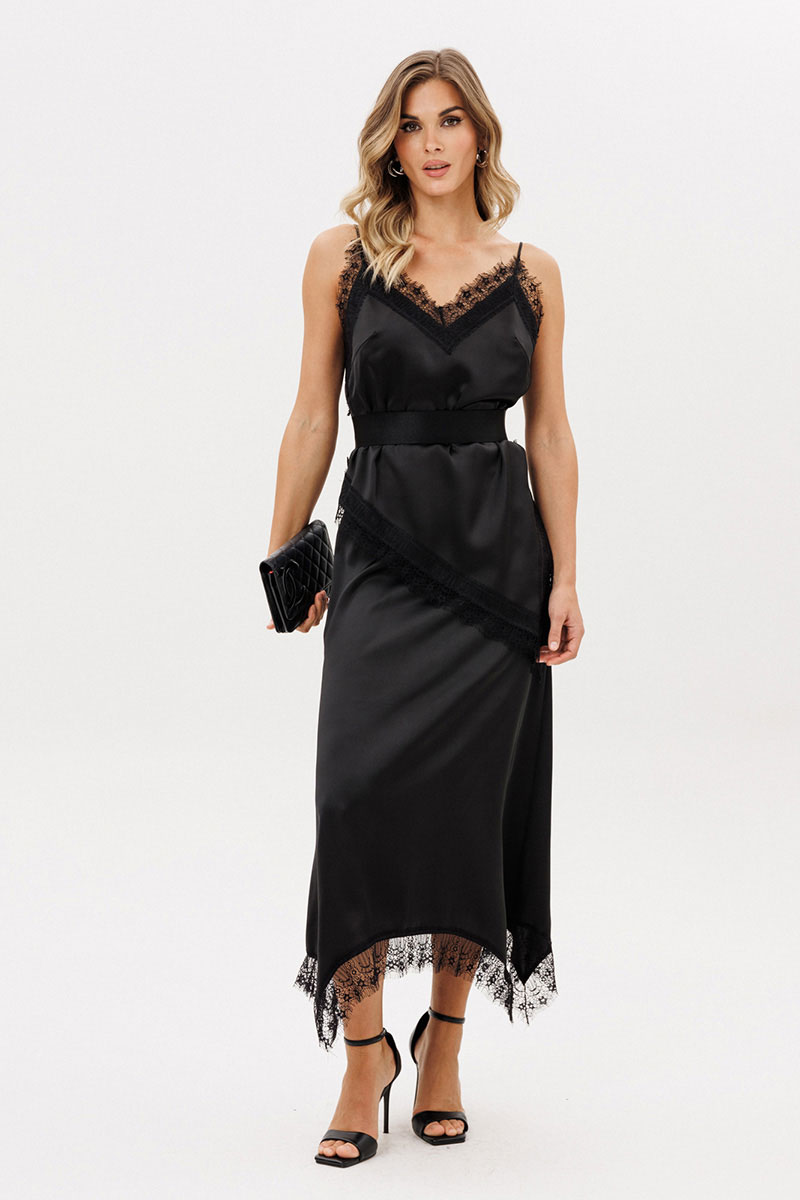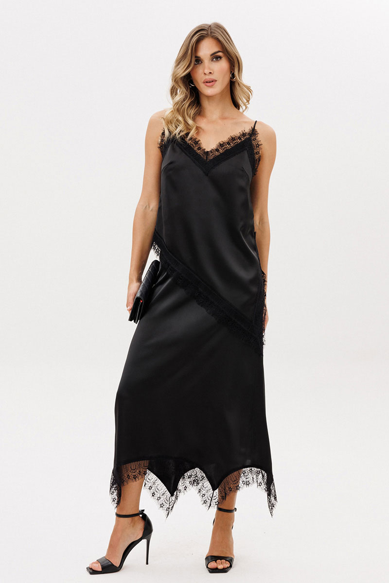 Топ выполнен из плотного атласа. Топ прямого силуэта длиной до линии бедер. Вырез V-образной формы формы. Топ декорирован тесьмой-кружевом по проймам, низу и разрезу слева. Топ на нерегулируемых бретелях.
