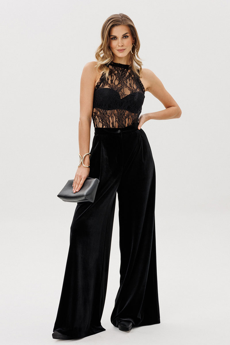 Джемпер выполнен из ажурного трикотажного полотна "гипюр". Джемпер приталенного силуэта, длиной выше линии бедер. Перед и спинка цельные. Горловина округлой формы. Плечевой шов заужен. Горловина и пройма обработаны бейками из основной ткани.