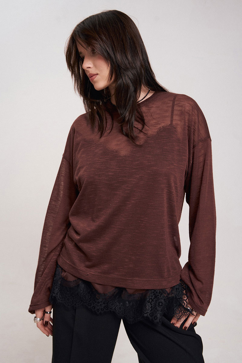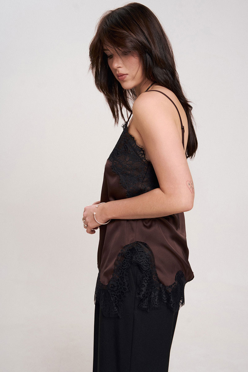 Топ женский молодежный прямого силуэта, без застежки на регулируемых бретелях из ткани шелк Армани, с отделкой кружевом по верху и по низу. Разрезы по бокам.
