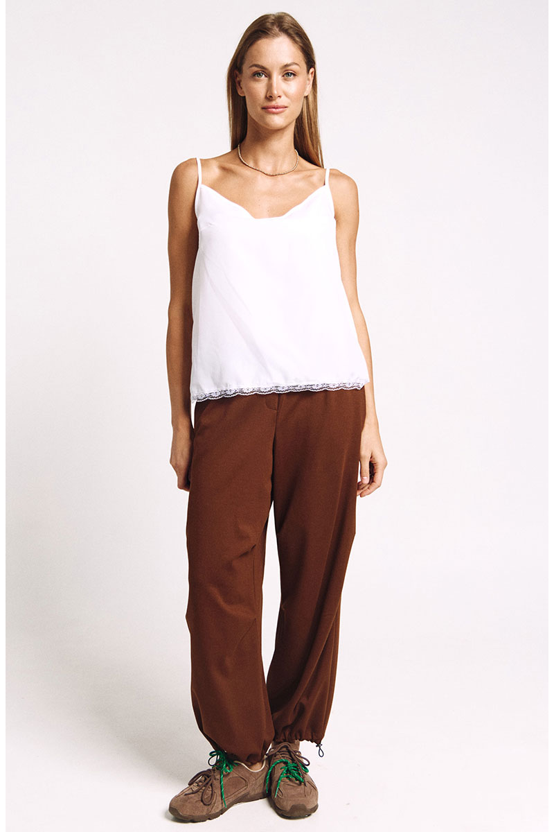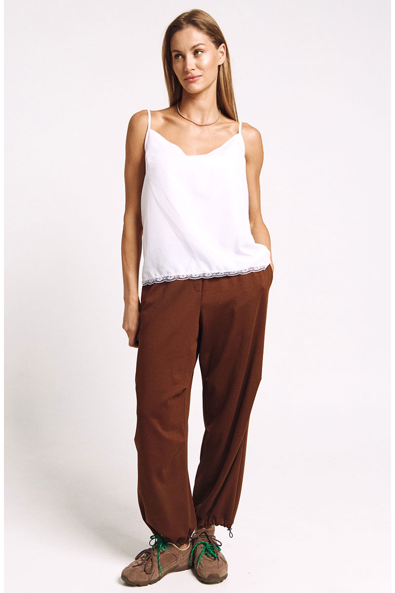 Комбинация с регулируемыми бретелями и тонким коужевом по низу. Прямой силуэт.