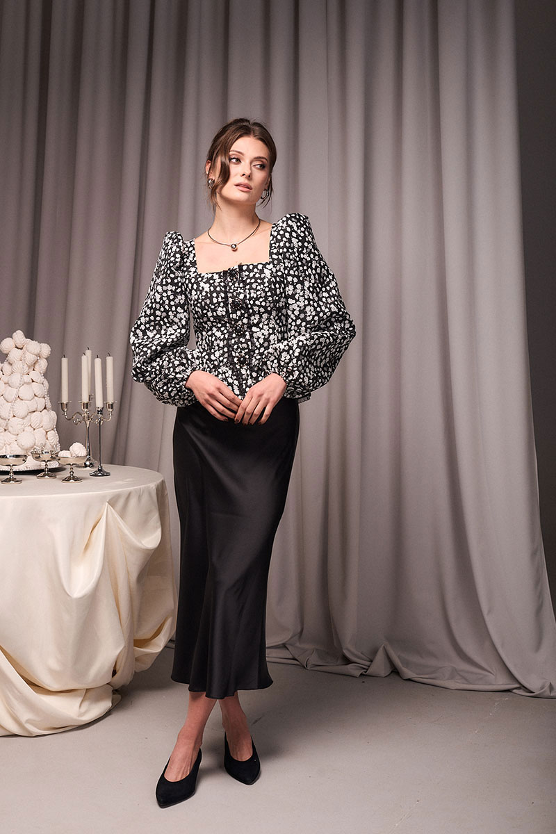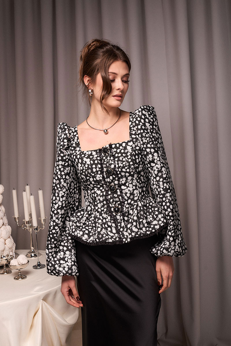 Топ из благородного жаккарда в мелкий стильзованный цветок.