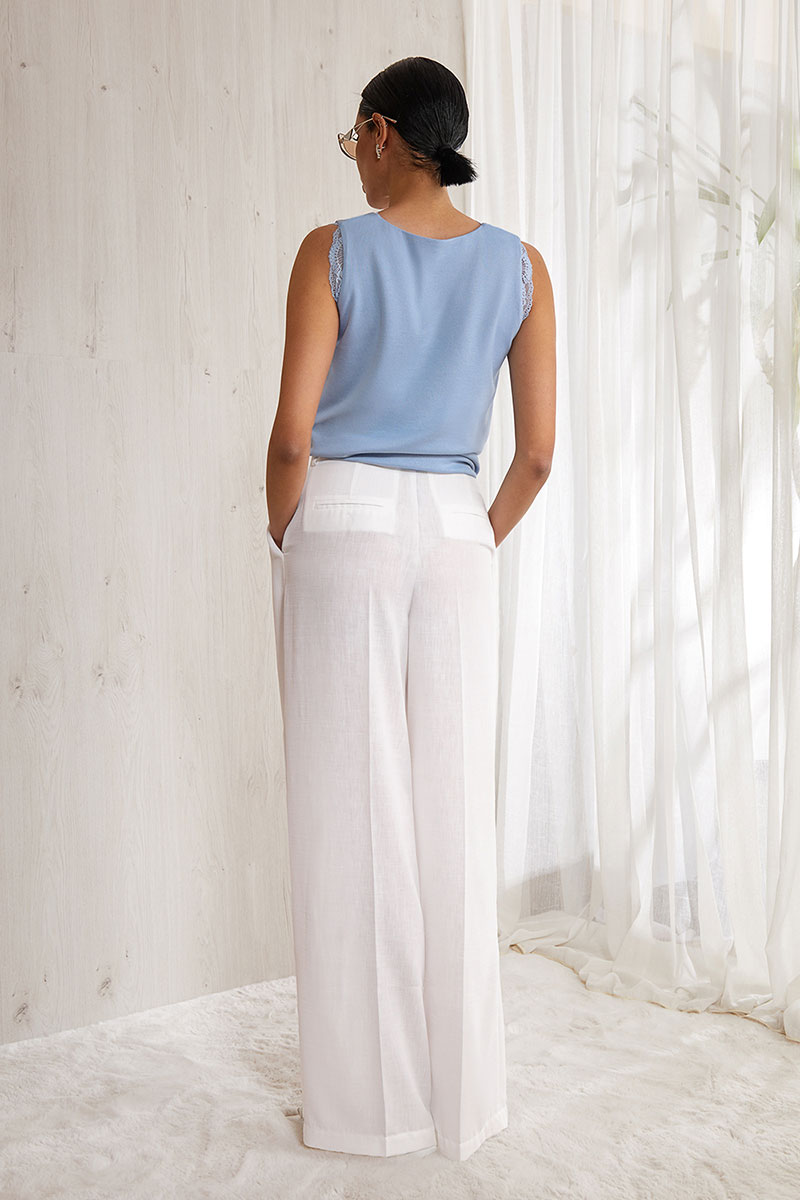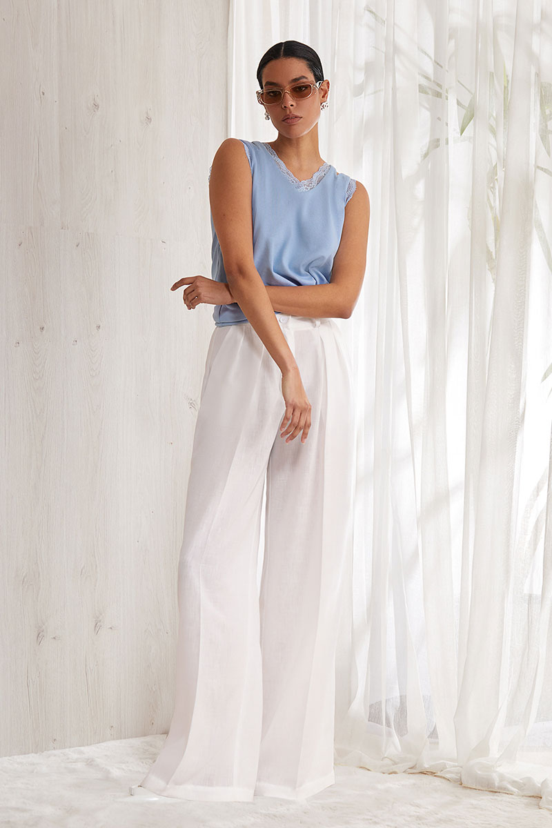 Блуза выполнена из трикотажного полотна. Прямой силуэт. V-образная горловина. Фигурные вырезы по плечевому шву. По горловине и по пройме вставлено кружево. Спинка прямая.