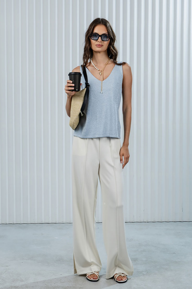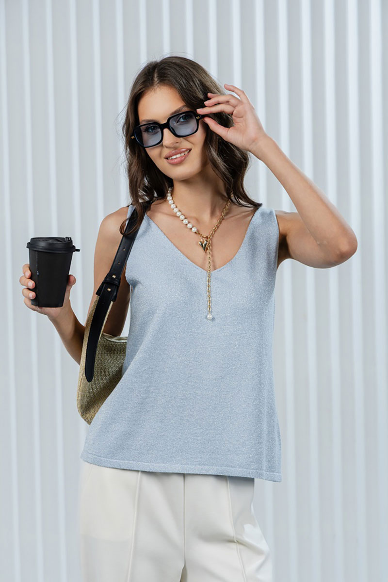Дизайн: топ без рукавов с V-образным вырезом, что придаёт изделию женственность и стиль. Простой, но изысканный крой подчёркивает фигуру;