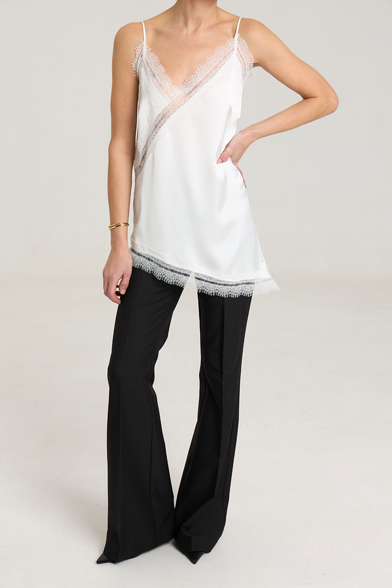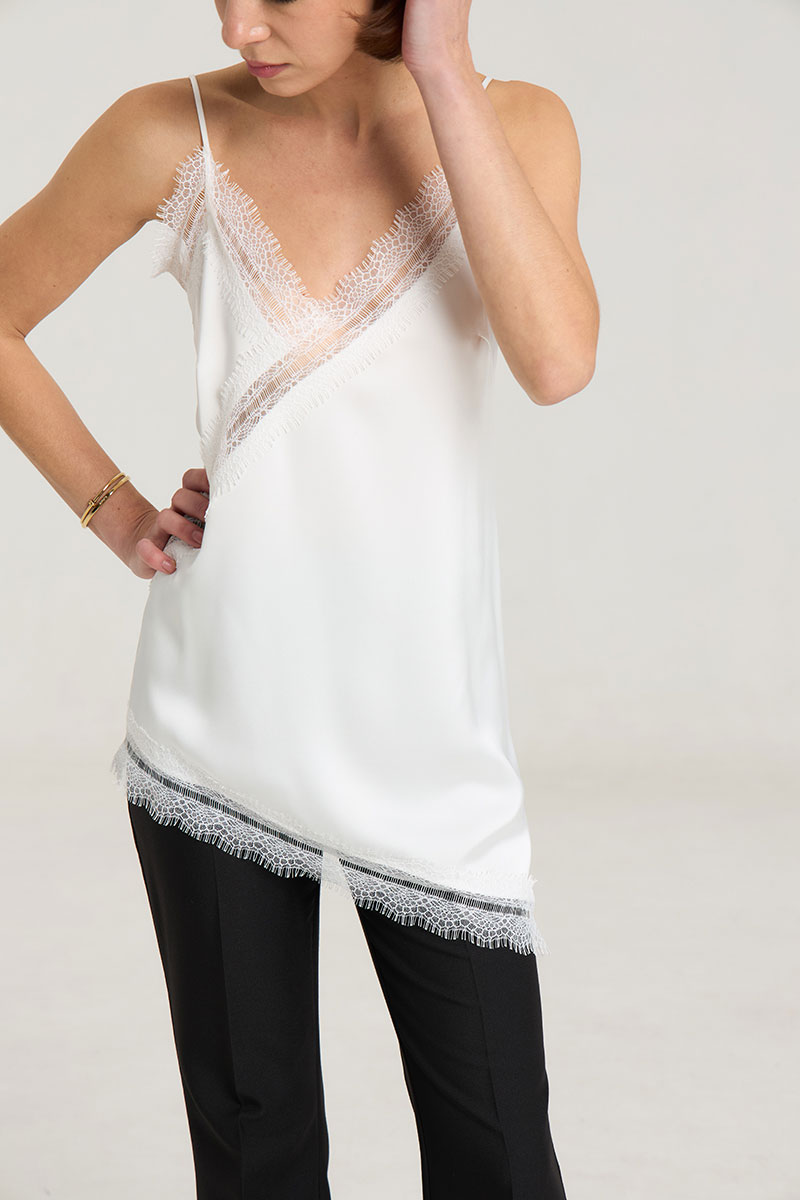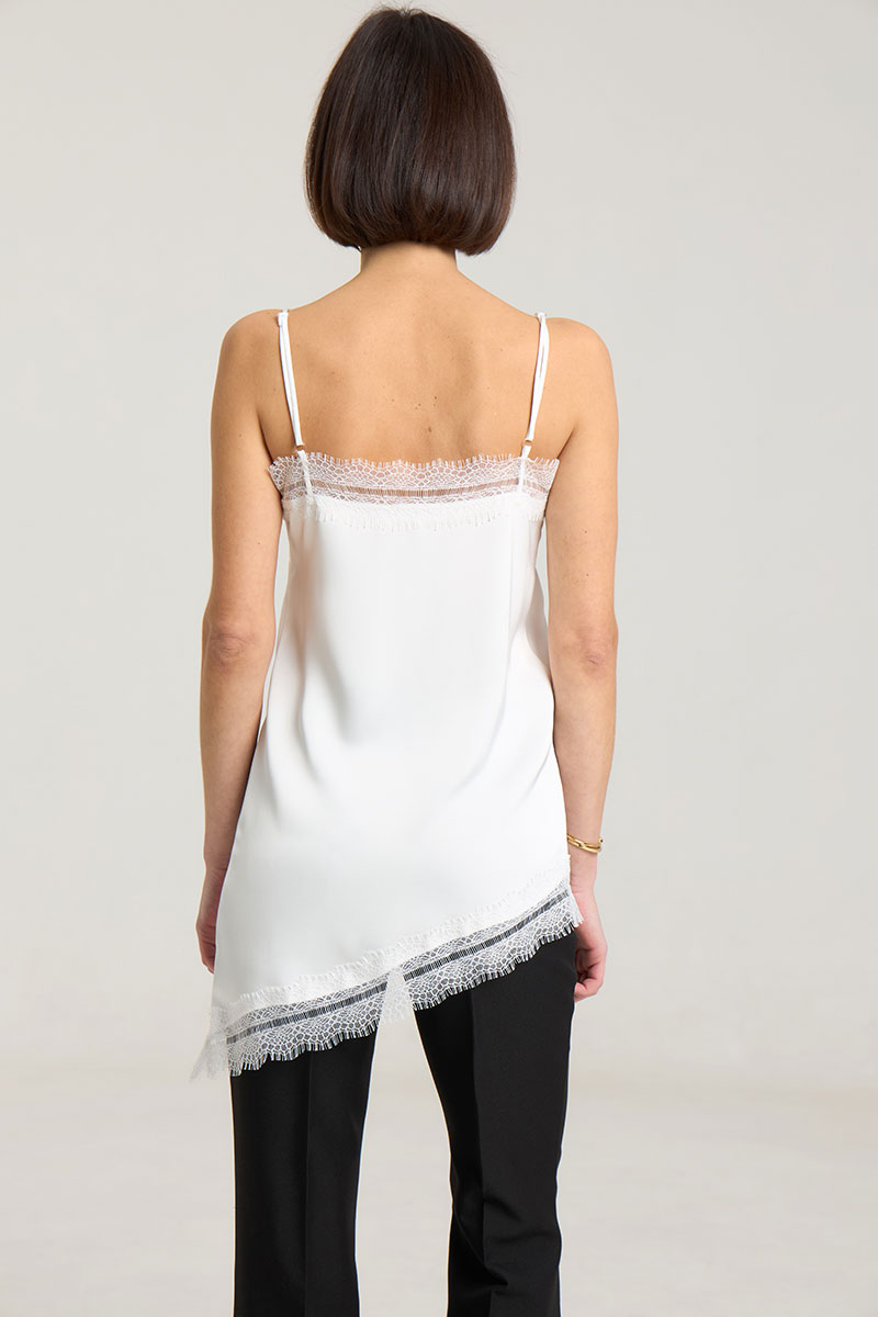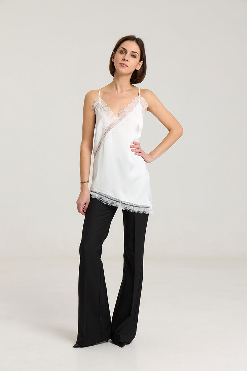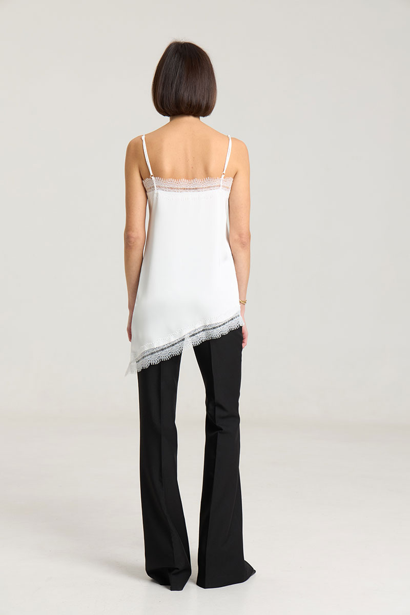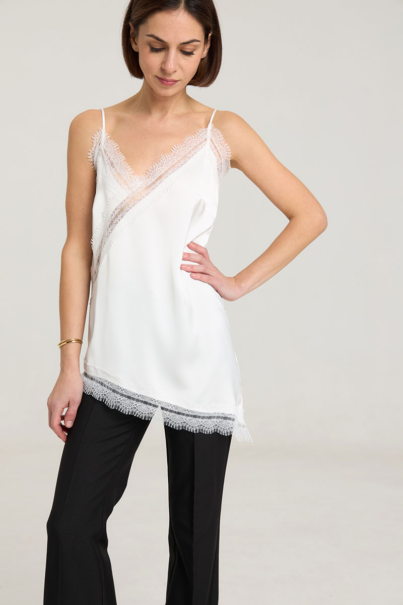 Ассиметричный топ с кружевом, топ на регулируемых бретелях, Топ станет дополнением к любому образу, будь то повседневный или нарядный. Можно сочетать с атласными черными брюками или юбкой из нашей коллекции. Атлас плотный, на груди вытачки.