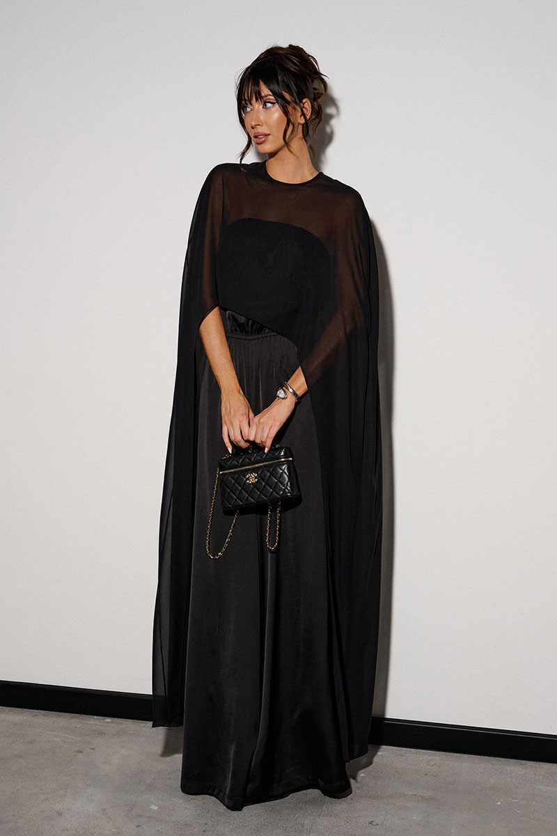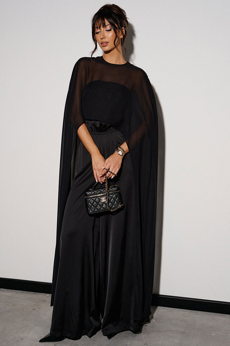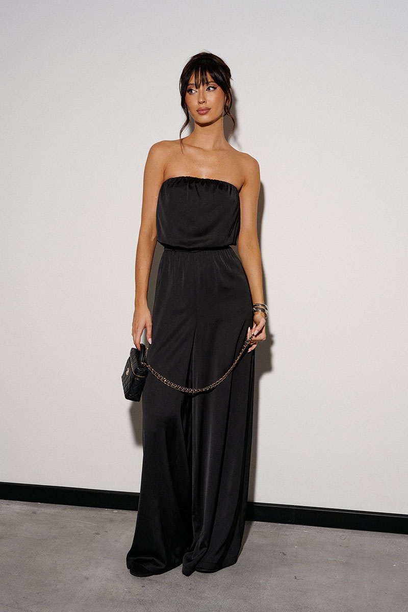 Комбинезон с открытыми плечами полуприлегающего силуэта. Выполнен из мягкой струящейся ткани чёрного цвета. Без застёжки. Линия декольте на резинке. Лиф выполнен из двойной ткани. Отрез по линии талии на резинке. В боковых швах брючин карманы.