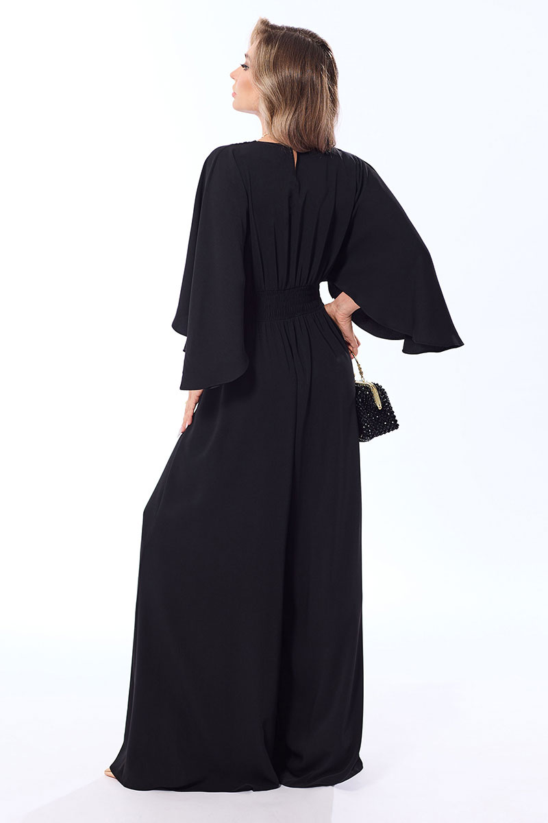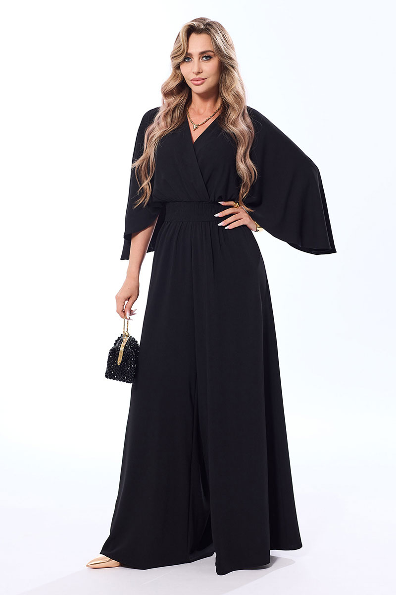 Комбинезон с застежкой на навесную петлю и пуговицу по горловине спинки, с цельнокроенным рукавом- крылышко. Лиф переда с V-образным вырезом горловины, полочки расположены на запах. Лиф спинки со средним швом. Комбинезон с втачным поясом. Пояс присборен эластичной нитью- венгеркой.