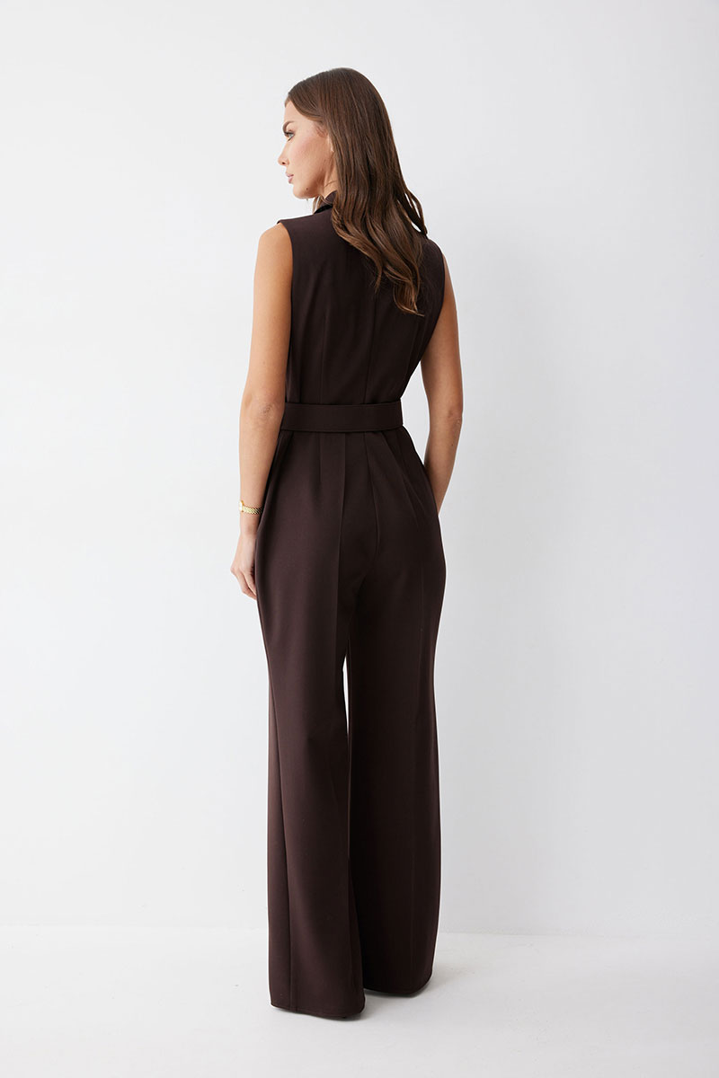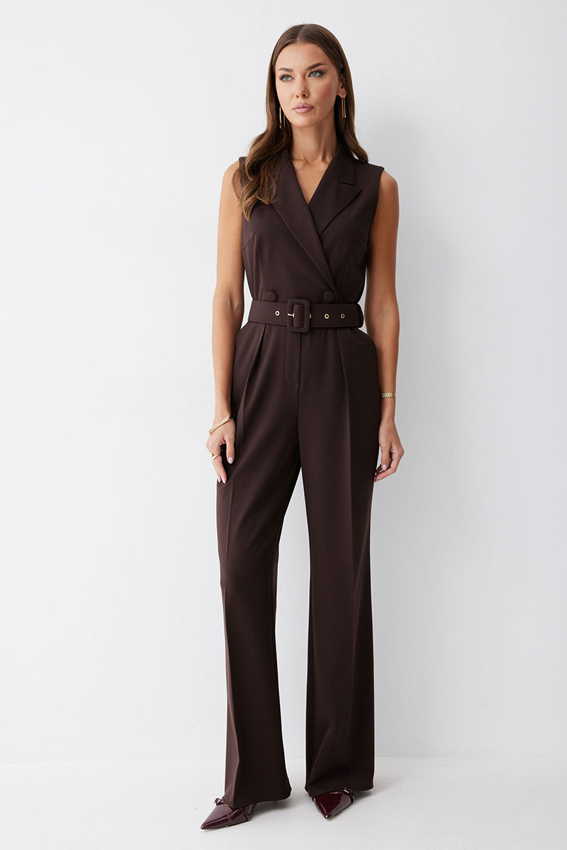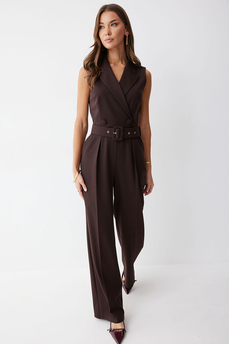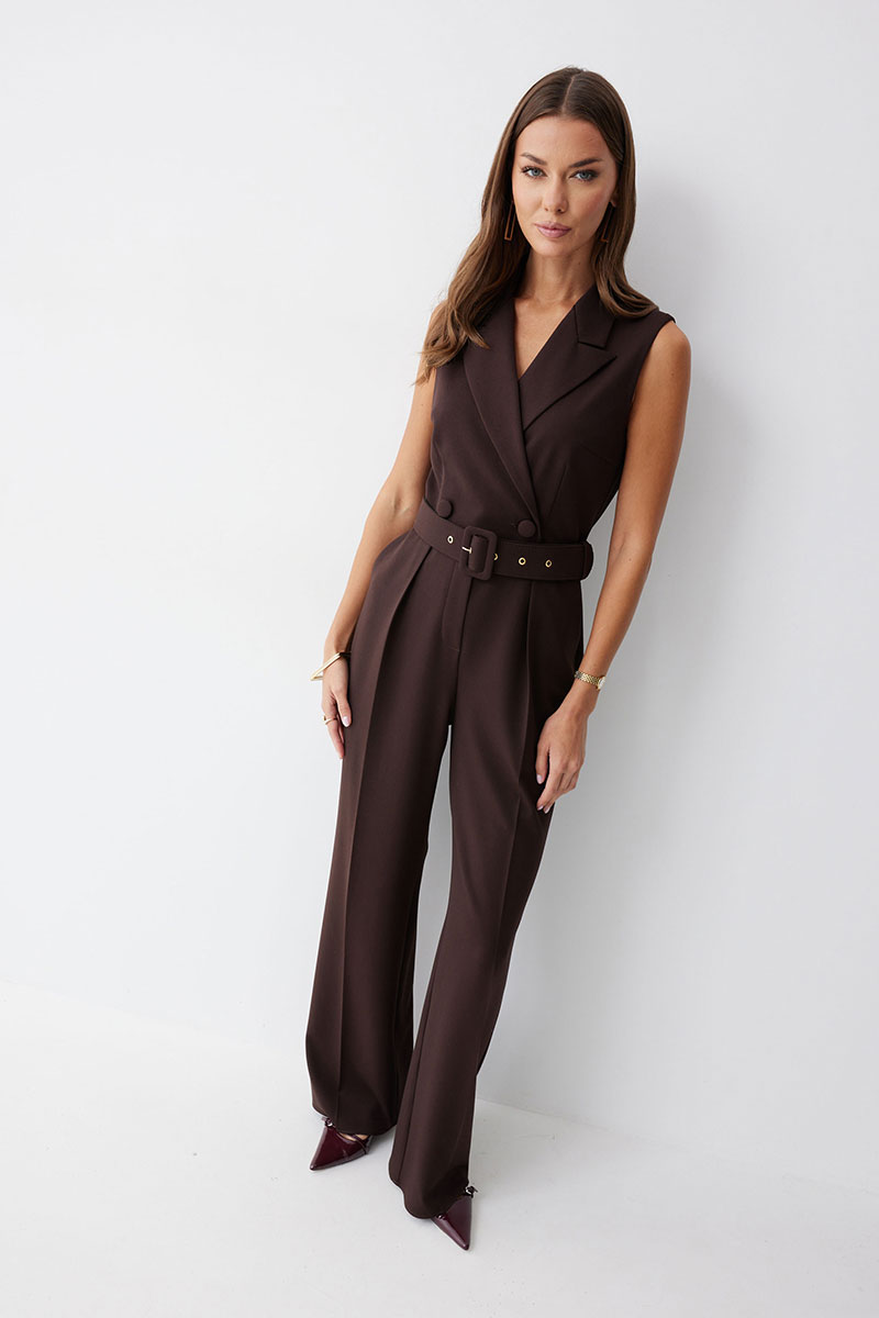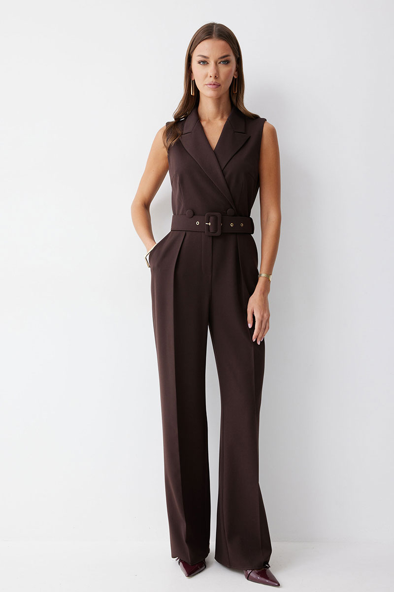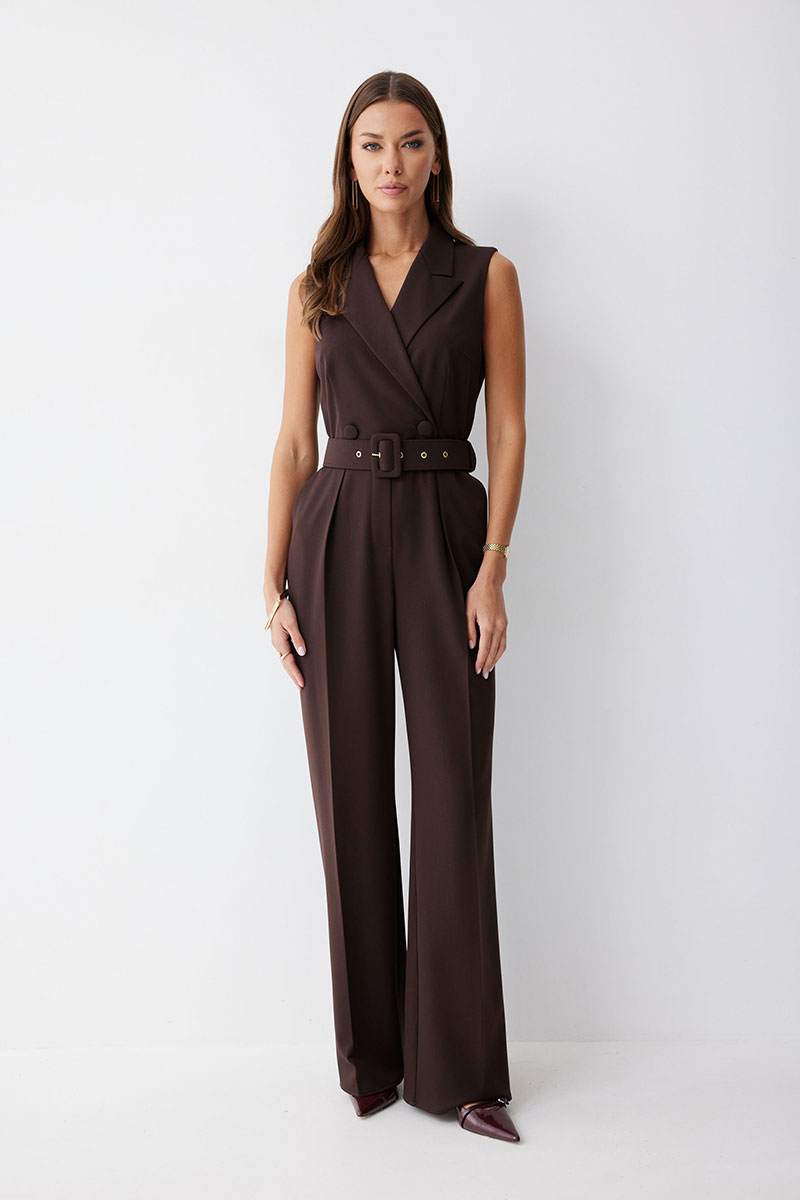 Комбинезон полуприлегающего силуэта из костюмной ткани. Воротник пиджачного типа. Комбинезон отрезной по линии талии, верхняя часть комбинезона на запах. На спинке в среднем шве застежка на потайную молнию. В боковых швах карманы. По переду на лифе талиевые и нагрудные вытачки, на брюках  декоративные складки. На спинке лифа талиевые вытачки. В комплект входит ремень. Обращаем ваше внимание, что фурнитура может отличаться от фото.