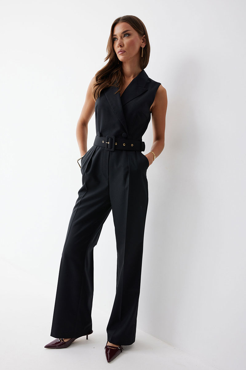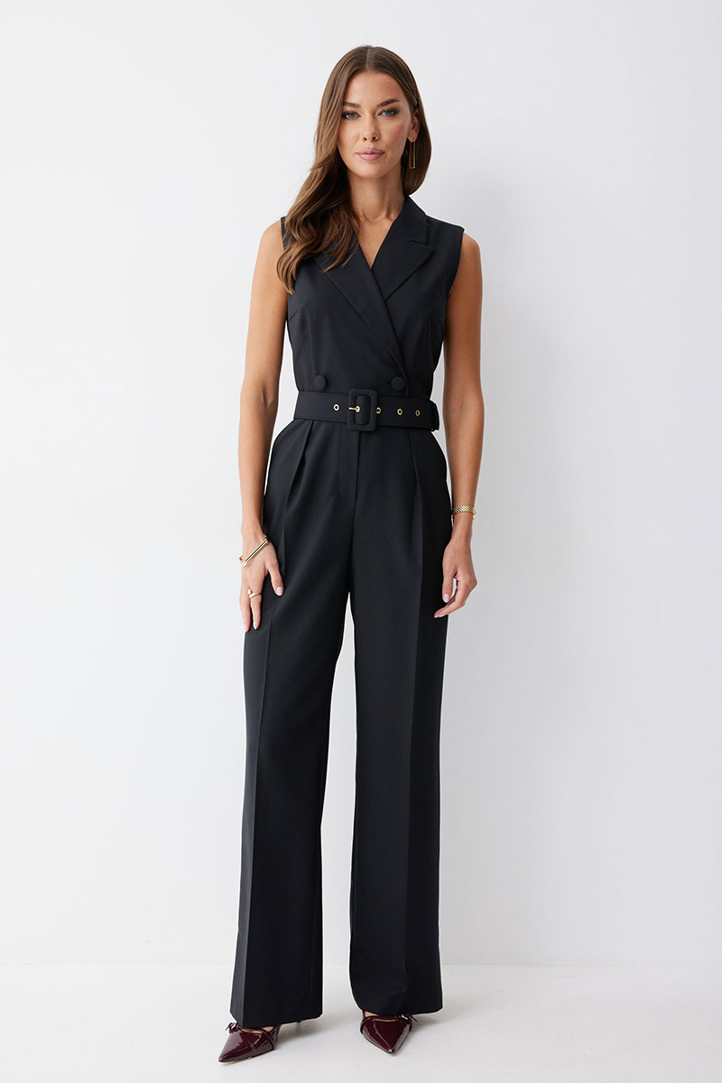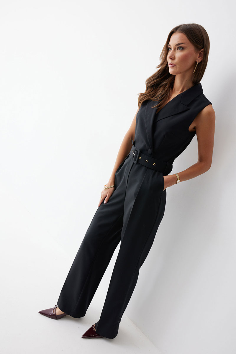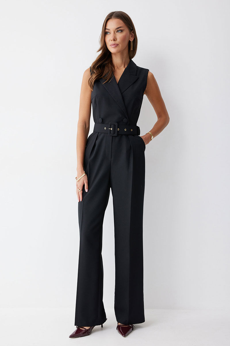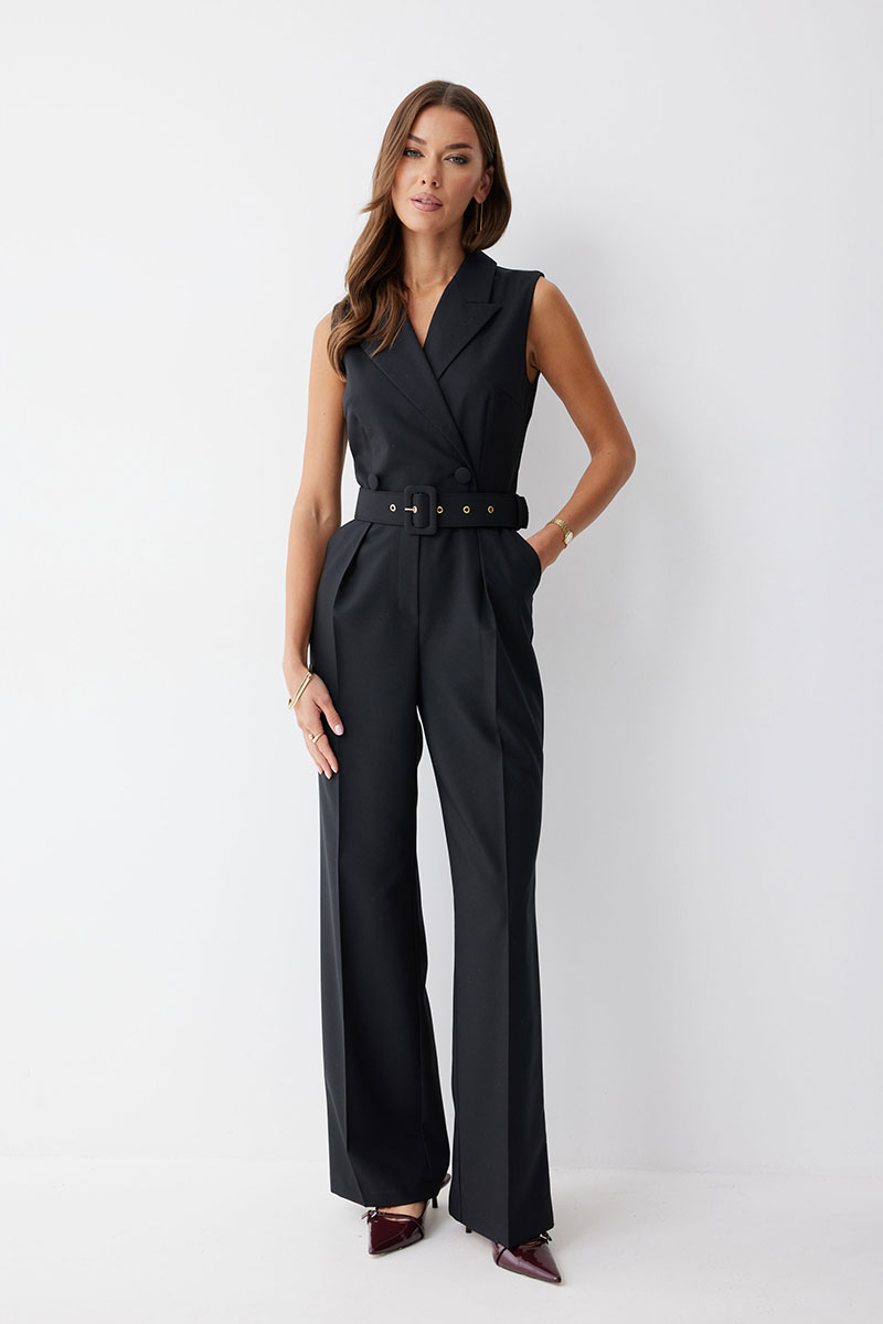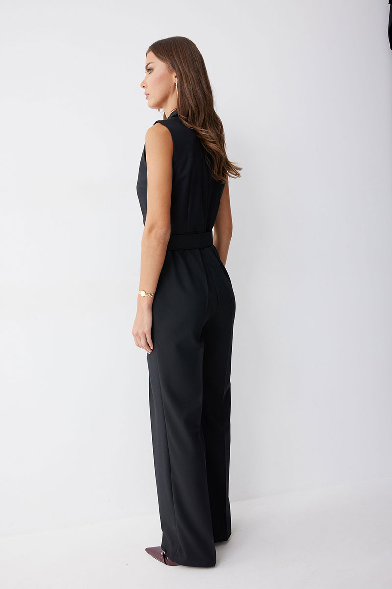 Комбинезон полуприлегающего силуэта из костюмной ткани. Воротник пиджачного типа. Комбинезон отрезной по линии талии, верхняя часть комбинезона на запах. На спинке в среднем шве застежка на потайную молнию. В боковых швах карманы. По переду на лифе талиевые и нагрудные вытачки, на брюках декоративные складки. На спинке лифа талиевые вытачки. В комплект входит ремень. Обращаем ваше внимание, что фурнитура может отличаться от фото.