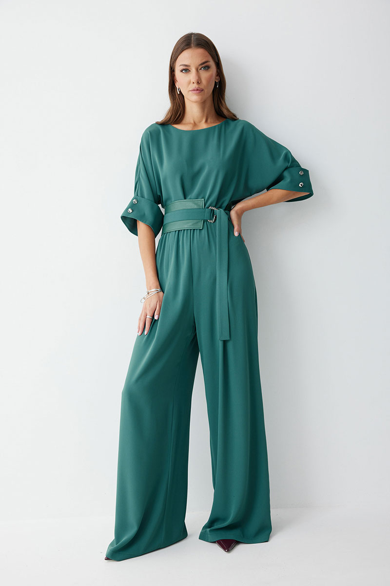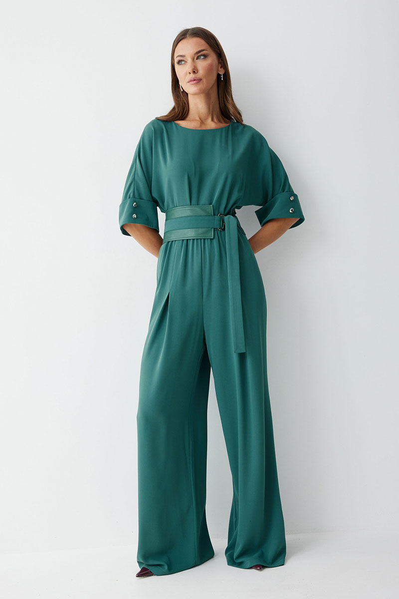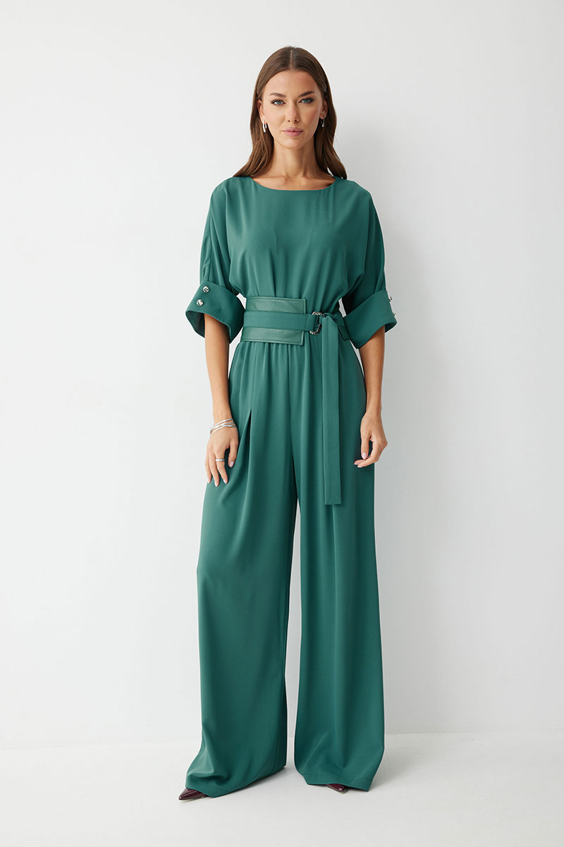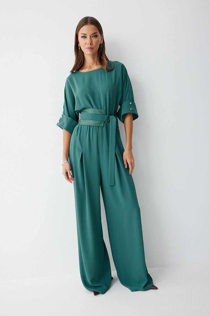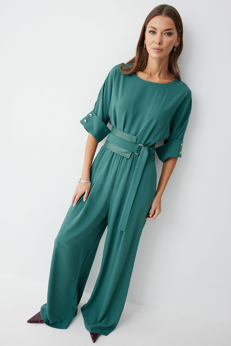 Комбинезон полуприлегающего силуэта, из струящейся ткани. Брюки прямого силуэта, со складками по переду. Комбинезон отрезной, по линии талии на резинке. Рукав цельнокроеный на манжете, длиной до локтя. Горловина округлая. В комплект входит пояс скомбинированный из экокожи и основной ткани. Обращаем ваше внимание, что фурнитура может незначительно отличаться от фото.