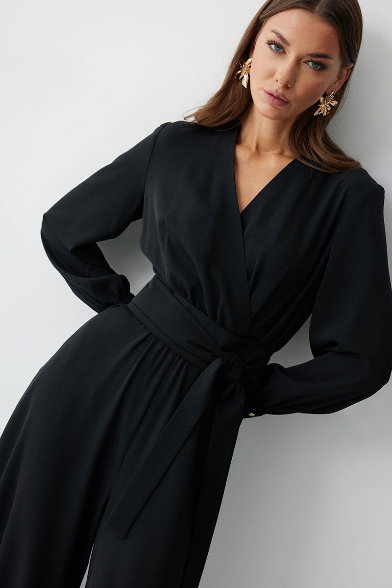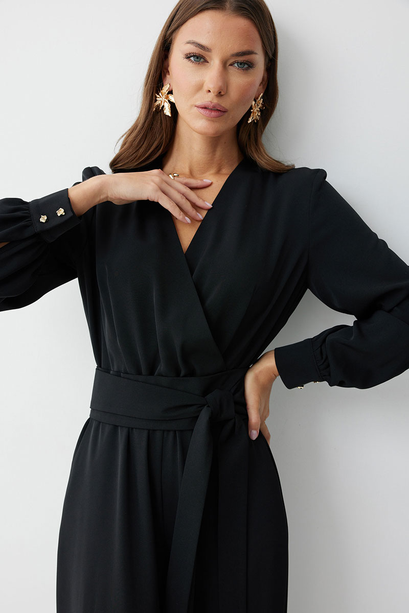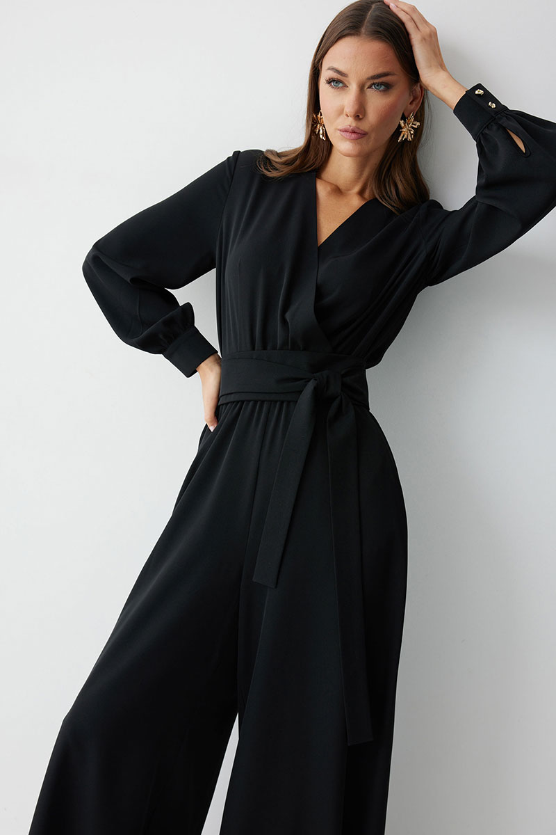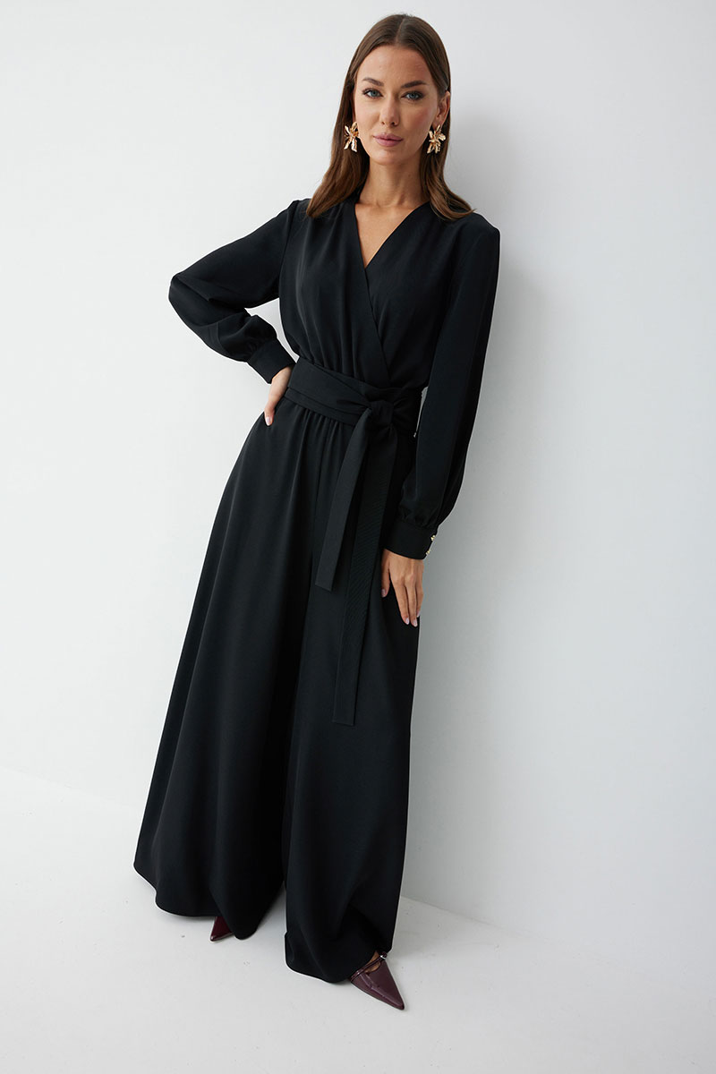 Комбинезон полуприлегающего силуэта с расширенными книзу брюками из струящейся ткани. Комбинезон отрезной по линии талии на резинке, верхняя часть комбинезона на запах. Рукав втачной, длинный, по низу манжета с застежкой на петлю и пуговицу. На спинке в среднем шве застежка на потайную молнию. В боковых швах карманы. В комплект входит пояс. Обращаем ваше внимание, что фурнитура может отличаться от фото.