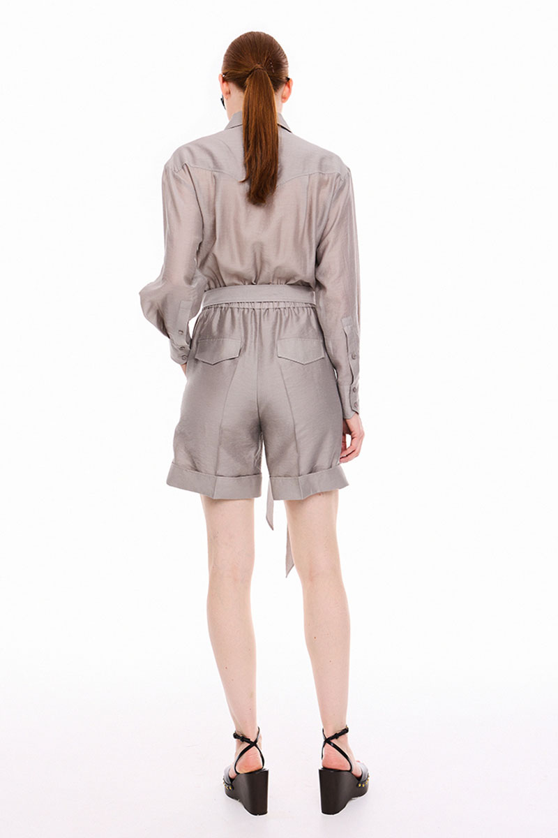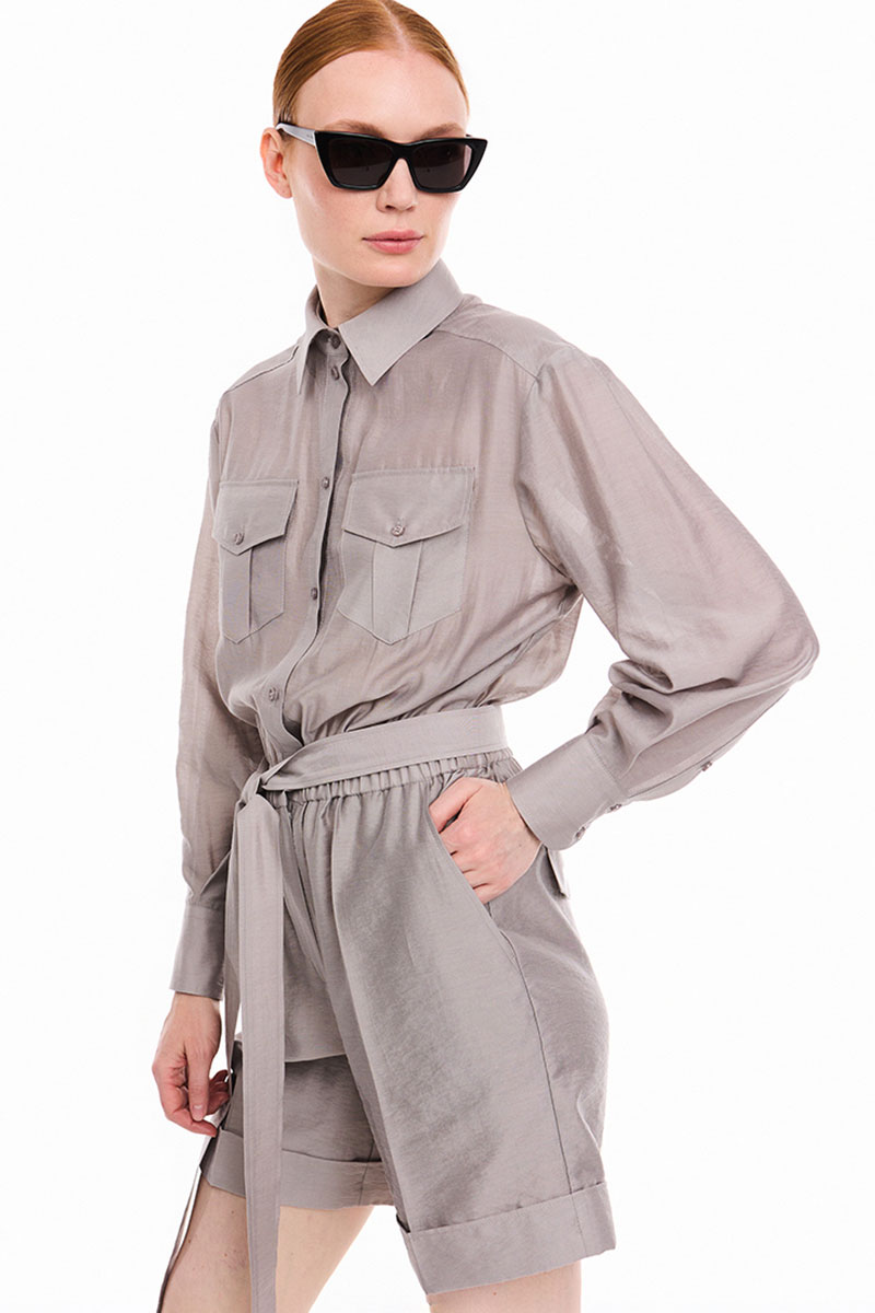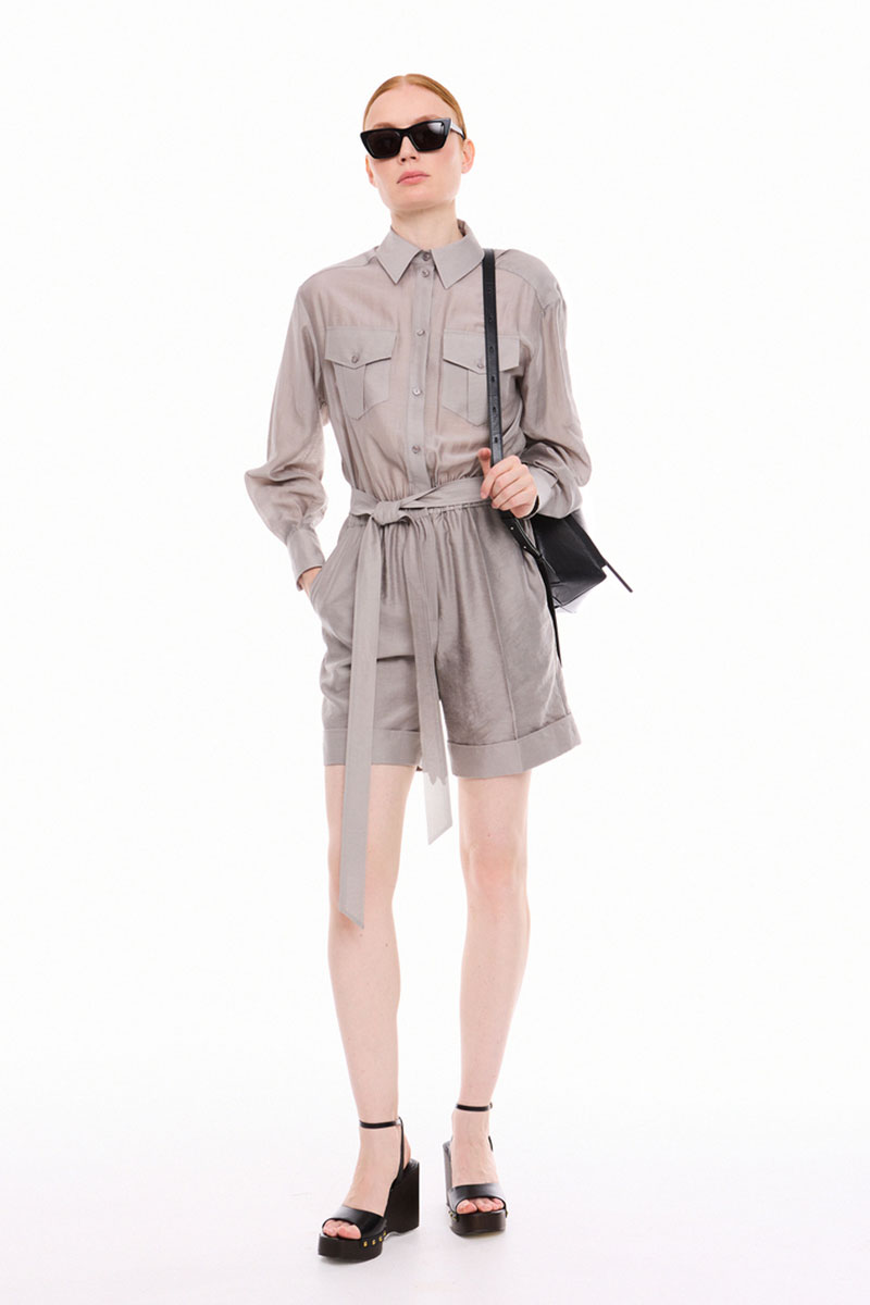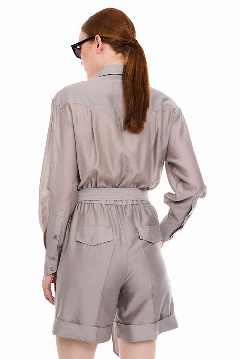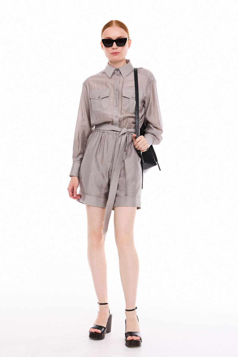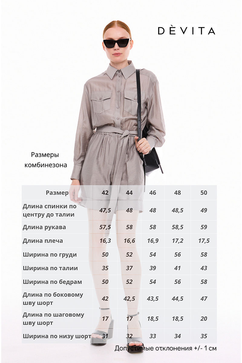 Комбинезон из легкой, полупрозрачной ткани, отрезной по линии талии, со съёмным поясом. По талии кулиска с эластичной тесьмой. Верхняя часть комбинезона с центральной застёжкой на петли и пуговицы, с накладными карманами с клапанами, застёгивающимся на петлю и пуговицу. По спинке двойная кокетка фигурной формы и две складочки. Воротник сорочечный с отрезной стойкой. Рукава рубашечные одношовные, с манжетами фигурной формы, застёгивающимися на две петли и пуговицы. Разрезы рукавов обработаны английской планкой, с застёжкой на петлю и пуговицу. Нижняя часть комбинезона двойная, длиной выше линии колен, с притачными манжетами и заутюженными линиями «стрелки», манжет закреплён по боковым и шаговым швам. По переду шорт застёжка на тесьму- молнию и боковыми карманами с отрезными «бочками». По спинке шорт накладные отделочные клапаны фигурной формы. Измерения готового изделия расположены в табличке с фотографиями.