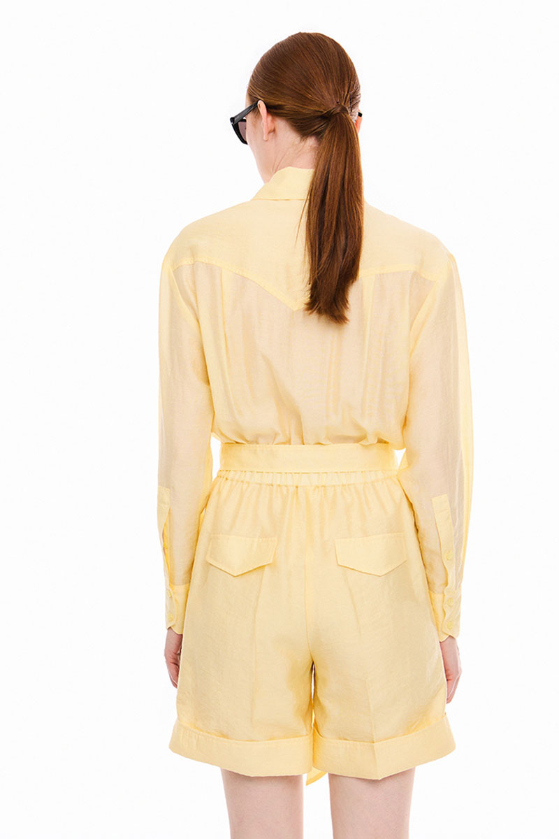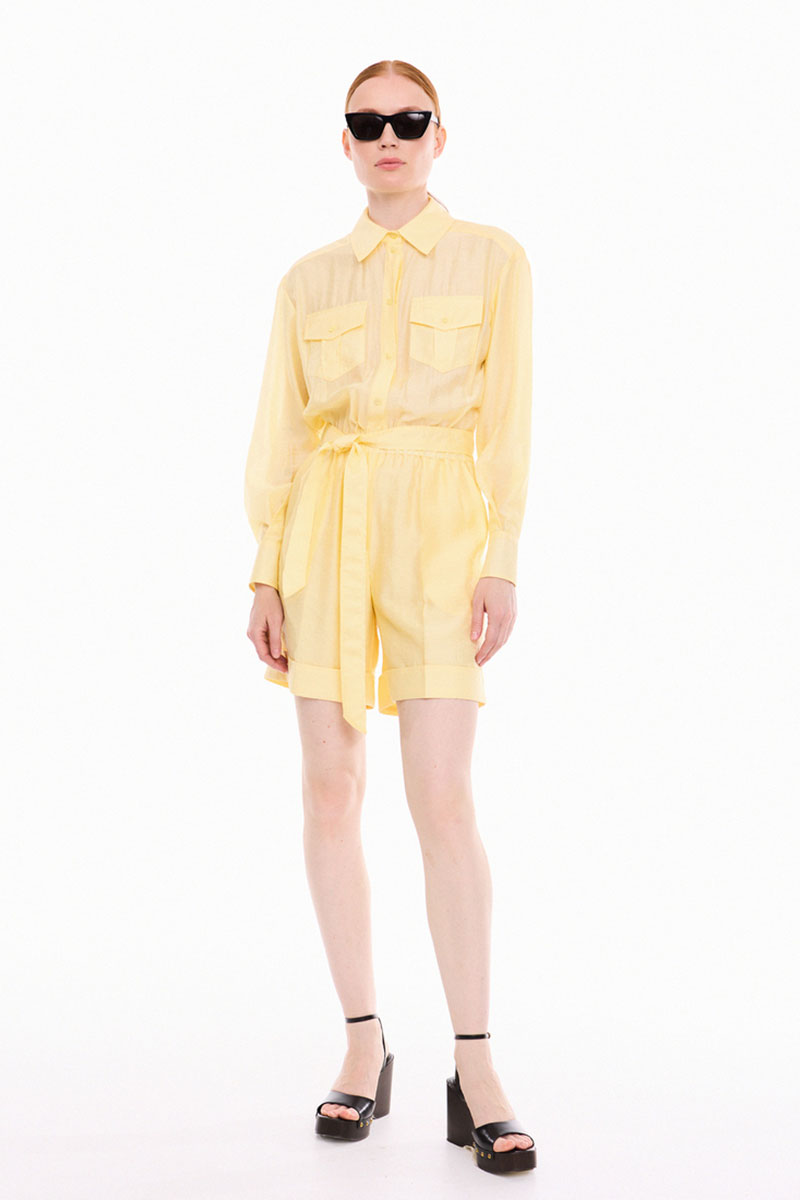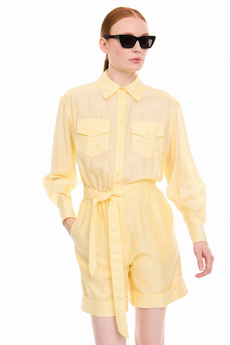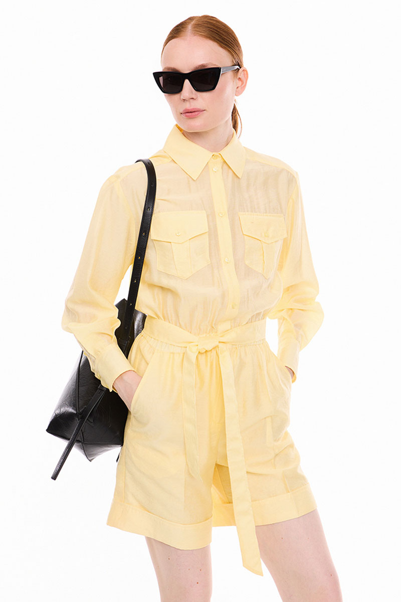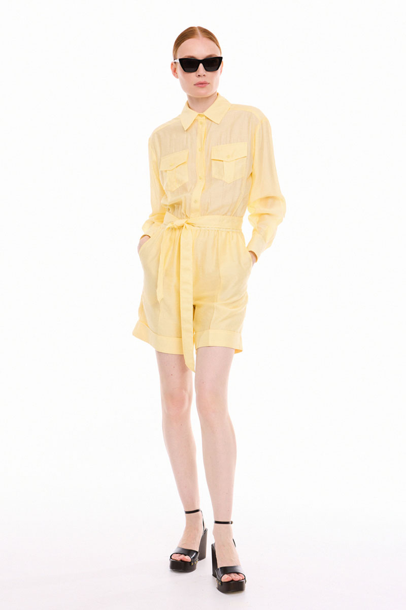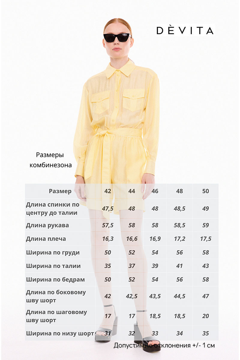 Комбинезон из легкой, полупрозрачной ткани, отрезной по линии талии, со съёмным поясом. По талии кулиска с эластичной тесьмой. Верхняя часть комбинезона с центральной застёжкой на петли и пуговицы, с накладными карманами с клапанами, застёгивающимся на петлю и пуговицу. По спинке двойная кокетка фигурной формы и две складочки. Воротник сорочечный с отрезной стойкой. Рукава рубашечные одношовные, с манжетами фигурной формы, застёгивающимися на две петли и пуговицы. Разрезы рукавов обработаны английской планкой, с застёжкой на петлю и пуговицу. Нижняя часть комбинезона двойная, длиной выше линии колен, с притачными манжетами и заутюженными линиями «стрелки», манжет закреплён по боковым и шаговым швам. По переду шорт застёжка на тесьму- молнию и боковыми карманами с отрезными «бочками». По спинке шорт накладные отделочные клапаны фигурной формы. Измерения готового изделия расположены в табличке с фотографиями.