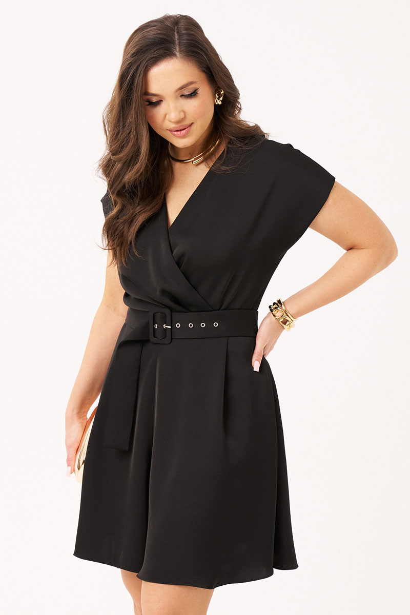 Боковые прорезные карманы добавляют практичности, а V-образная горловина придает образу изысканность. Короткие цельнокроеные рукава делают модель легкой и свежей. Для еще большего облегания в области талии предусмотрен пояс.