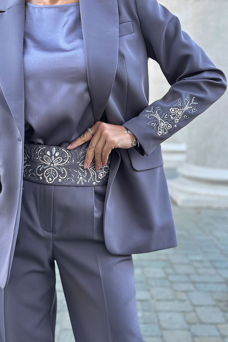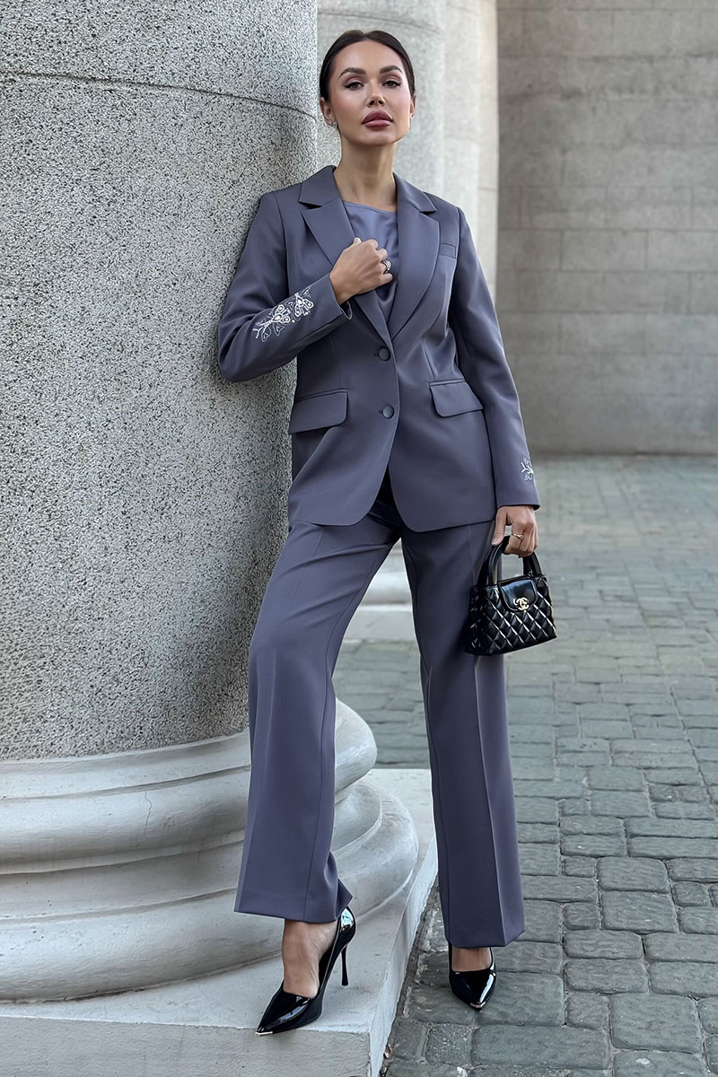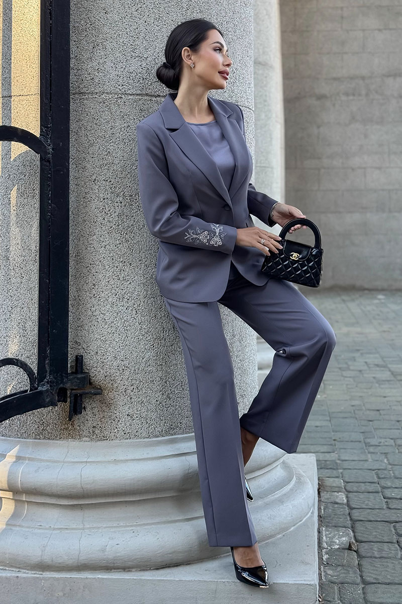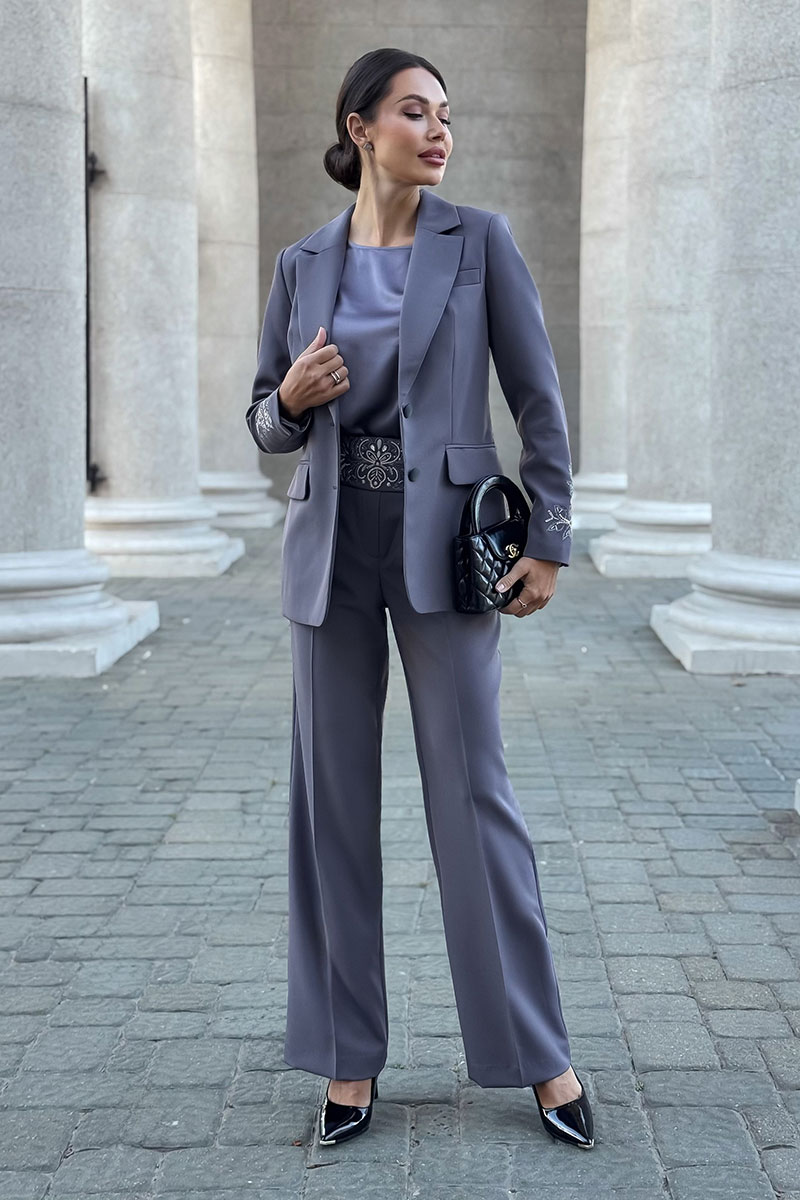 Особый акцент в костюме сделан на вышивке – изящный цветочный узор на поясе и манжетах жакета создаёт роскошный контраст, добавляя нотку утончённого блеска. Атласный топ с лёгким переливом гармонично дополняет образ, придавая ему мягкость и женственность. Костюм женский трёхпредметный состоит из удлиненного жакета полуприлегающего силуэта с вышивкой на рукаве, брюк и блузы. В комплект к брюкам идет съемный пояс с вышивкой расшитой декоративными камнями.