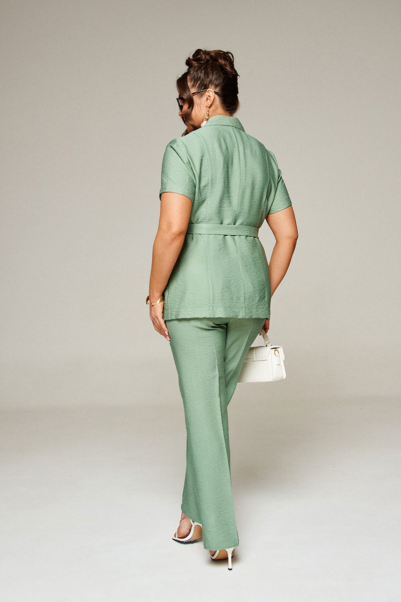 Костюм с прямыми брюками и облегающим жакетом идеально подойдет для создания лаконичных офисных луков, а также для повседневного использования. Модель смотрится необыкновенно женственно и эффектно.