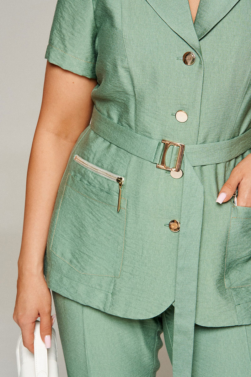Передняя часть жакета с двумя вертикальными рельефами от плеча. На нижней части переда предусмотрены накладные, функциональные карманы и декоративные элементы в виде молнии.