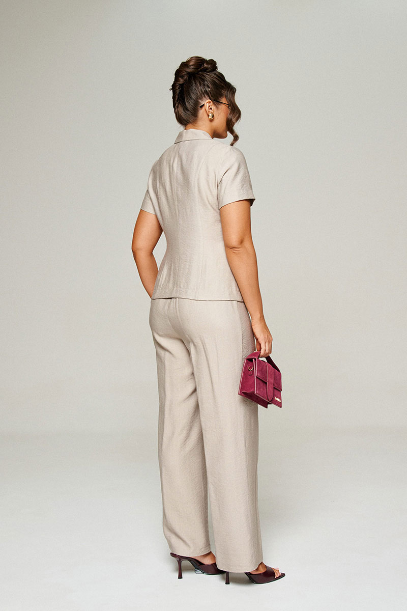 Классический с деловым акцентом женский костюм из жакета и брюк, выполнен из смесовой ткани с добавлением натуральных волокон.