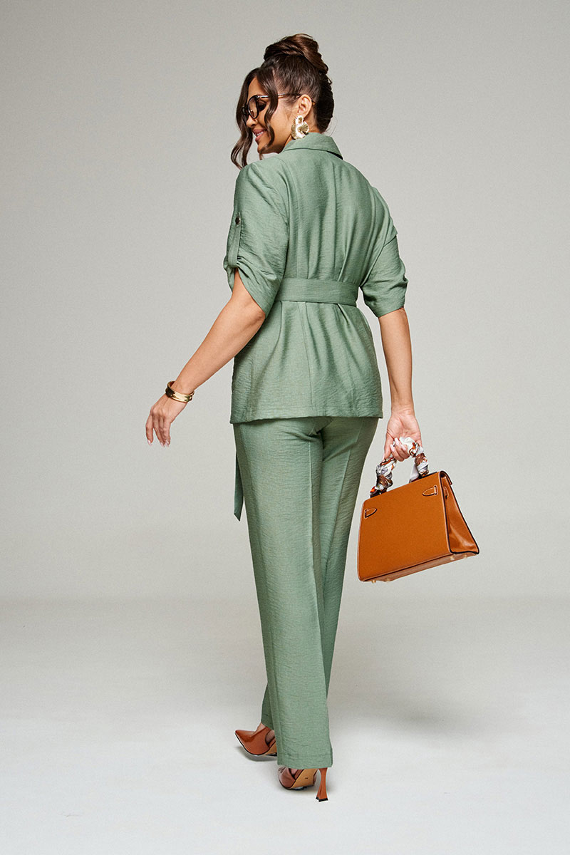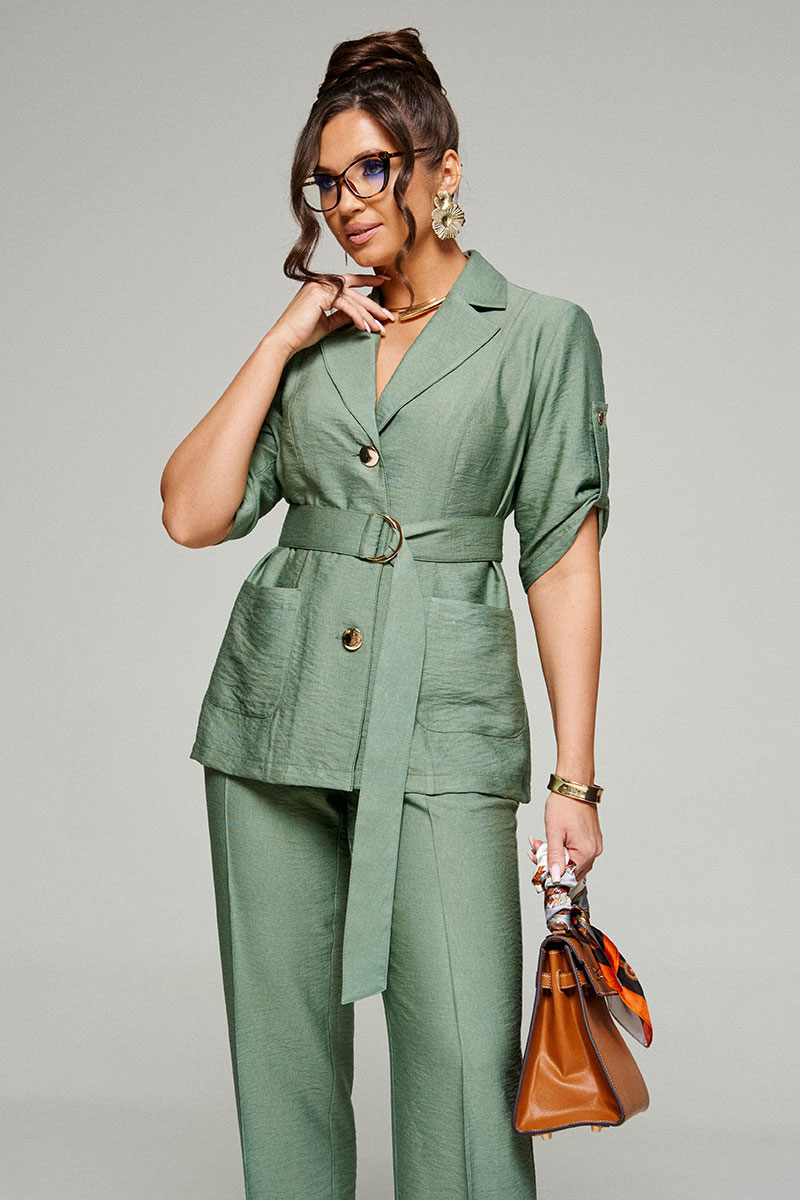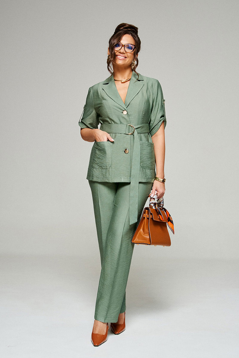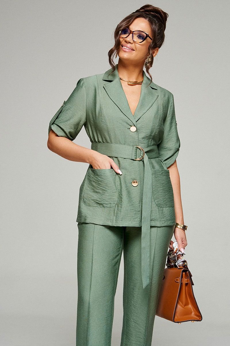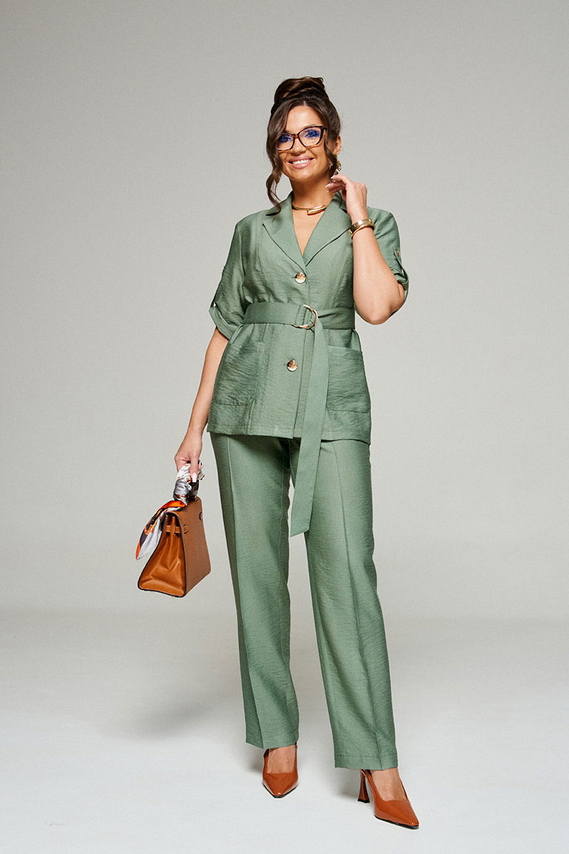 Эффектный костюм состоит из жакета и брюк, выполнен из мягкой смесовой ткани с органическими льном и вискозой, практичен в носке.