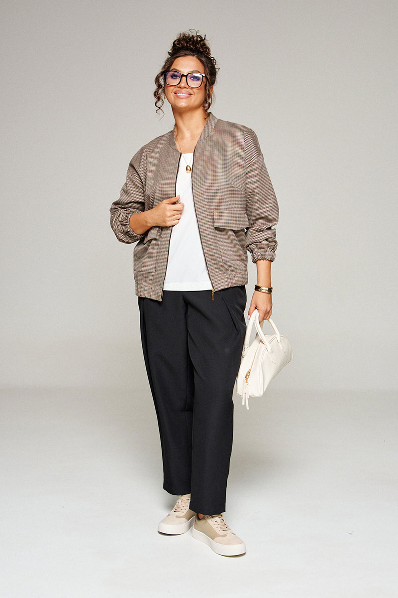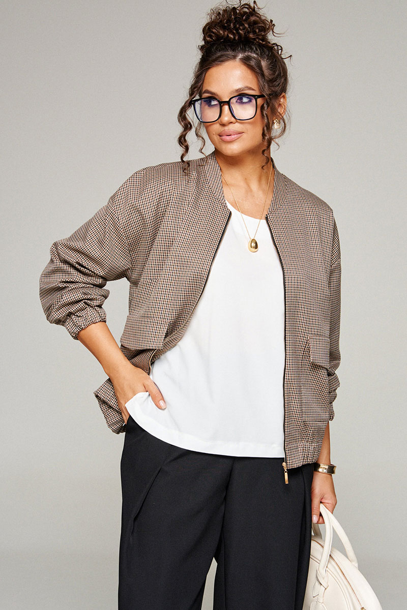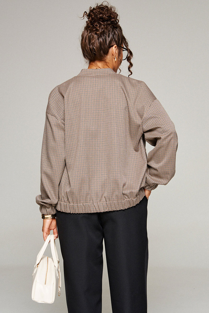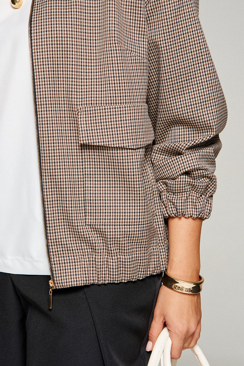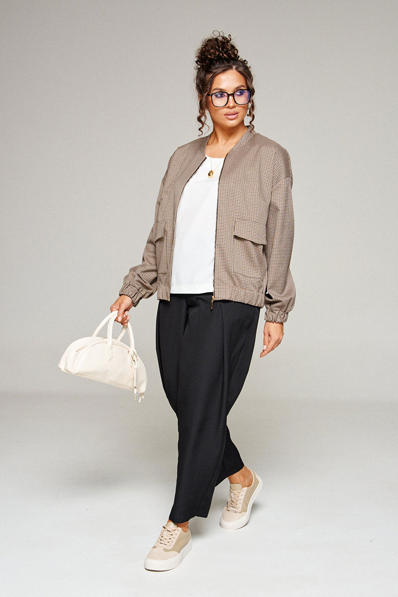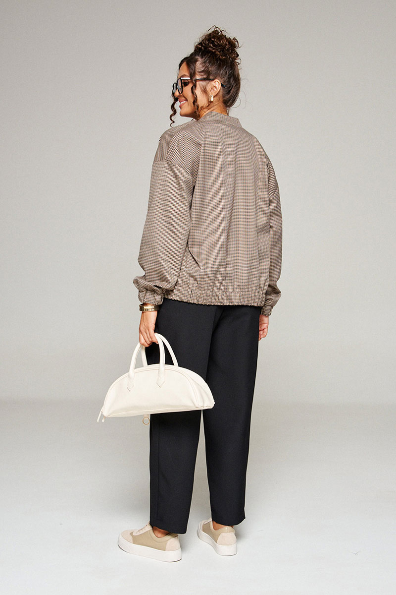 Горловина округлой формы с плосколежащей стойкой. Застежка центральная на декоративную разъёмную молнию. Нижняя часть жакета обработана планкой с резинкой шириной 5 см.