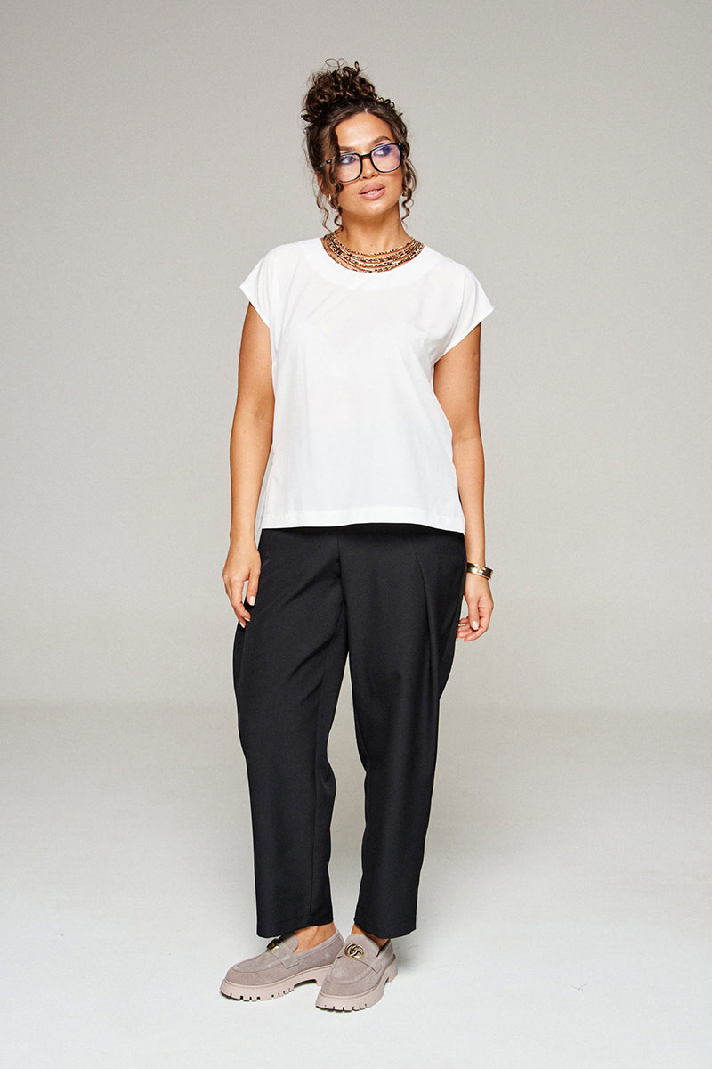 Брюки прямого силуэта свободные вверху и слегка зауженные к низу, длиной до щиколотки, с двумя верхними боковыми карманами и двумя заложенными глубокими складками от пояса.