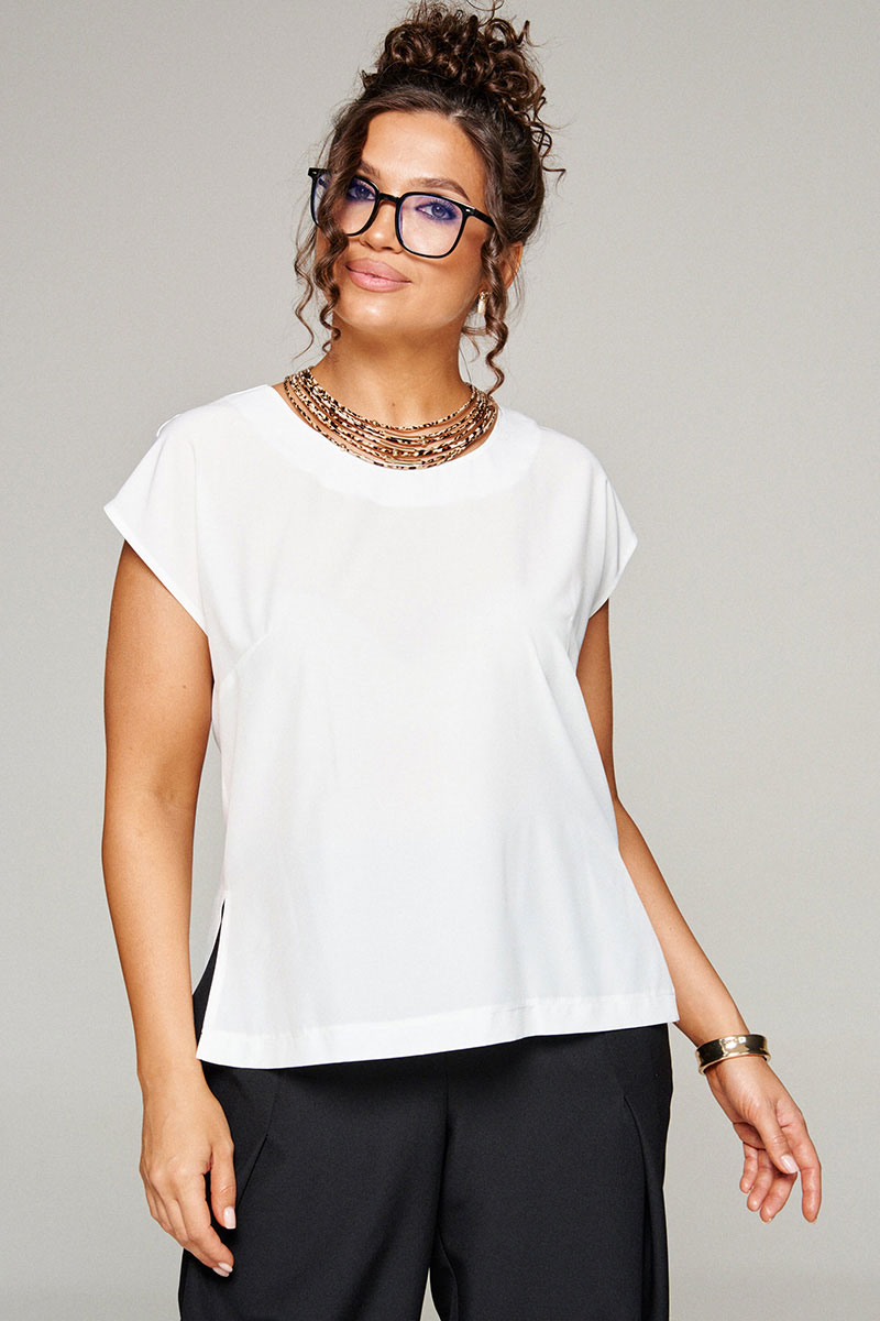 Блузка полуприлегающего силуэта. Горловина округлой формы. В боковых швах снизу разрезы.