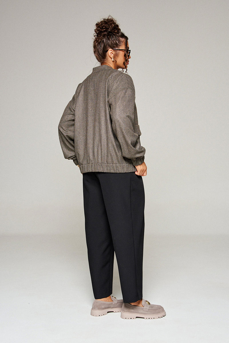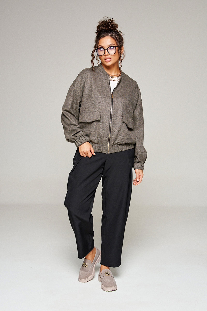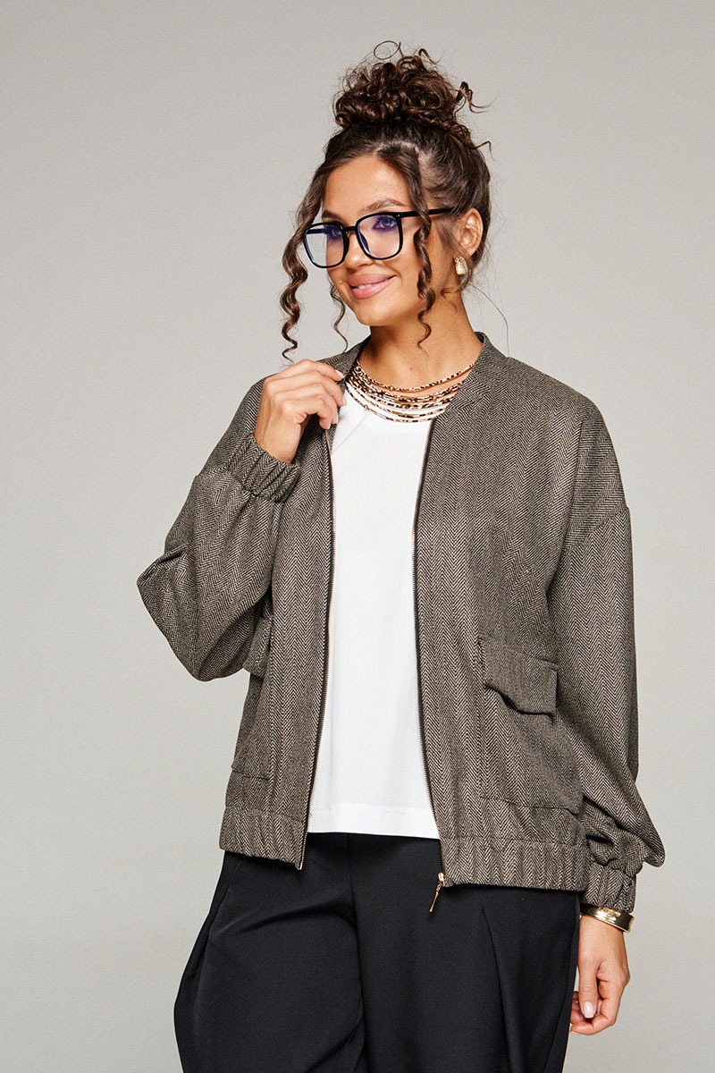 Горловина округлой формы с плосколежащей стойкой. Застежка центральная на декоративную разъёмную молнию. Нижняя часть жакета обработана планкой с резинкой шириной 5 см.