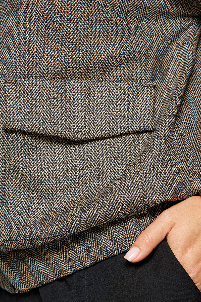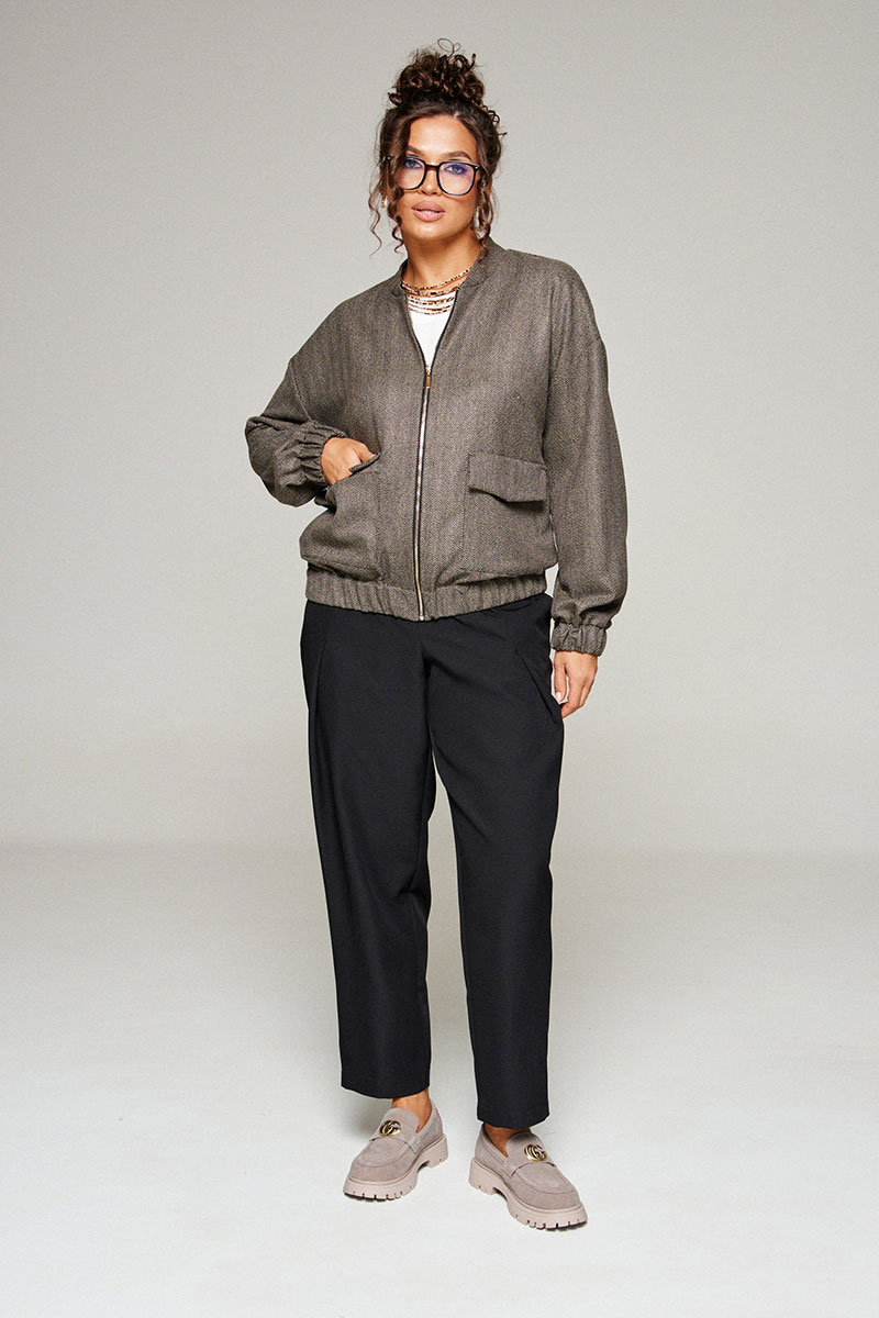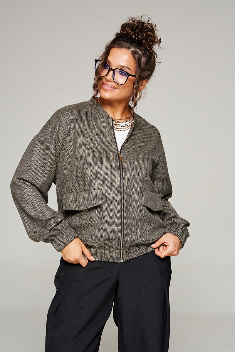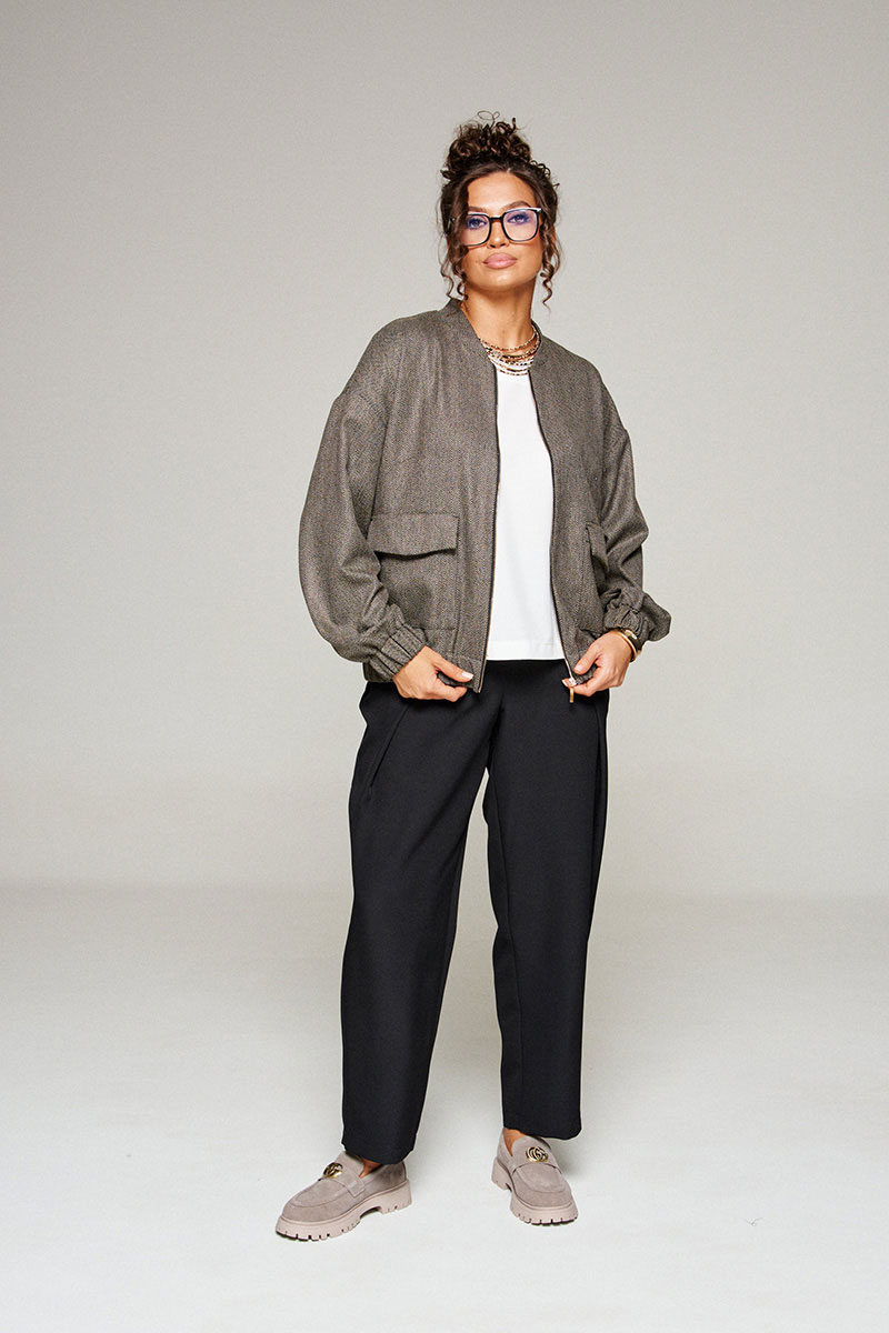 Горловина округлой формы с плосколежащей стойкой. Застежка центральная на декоративную разъёмную молнию. Нижняя часть жакета обработана планкой с резинкой шириной 5 см.