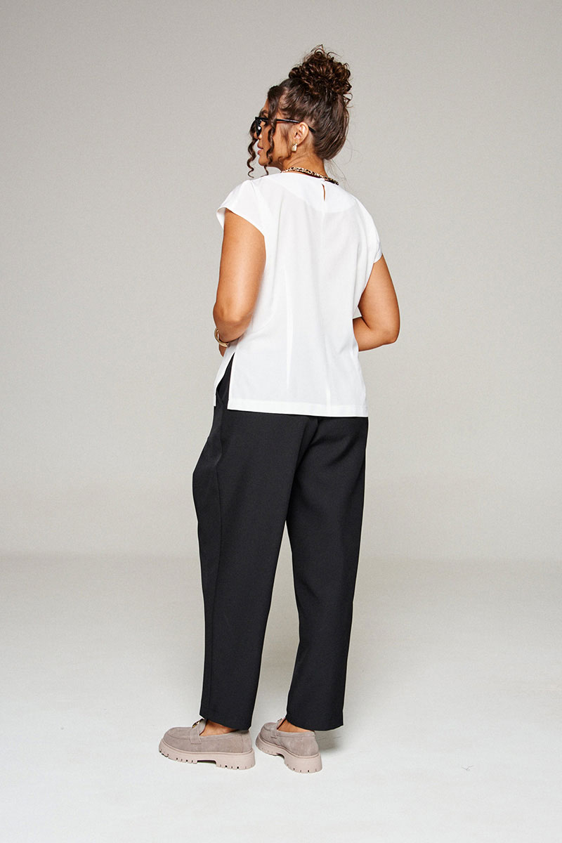 Блузка полуприлегающего силуэта. Горловина округлой формы. В боковых швах снизу разрезы.