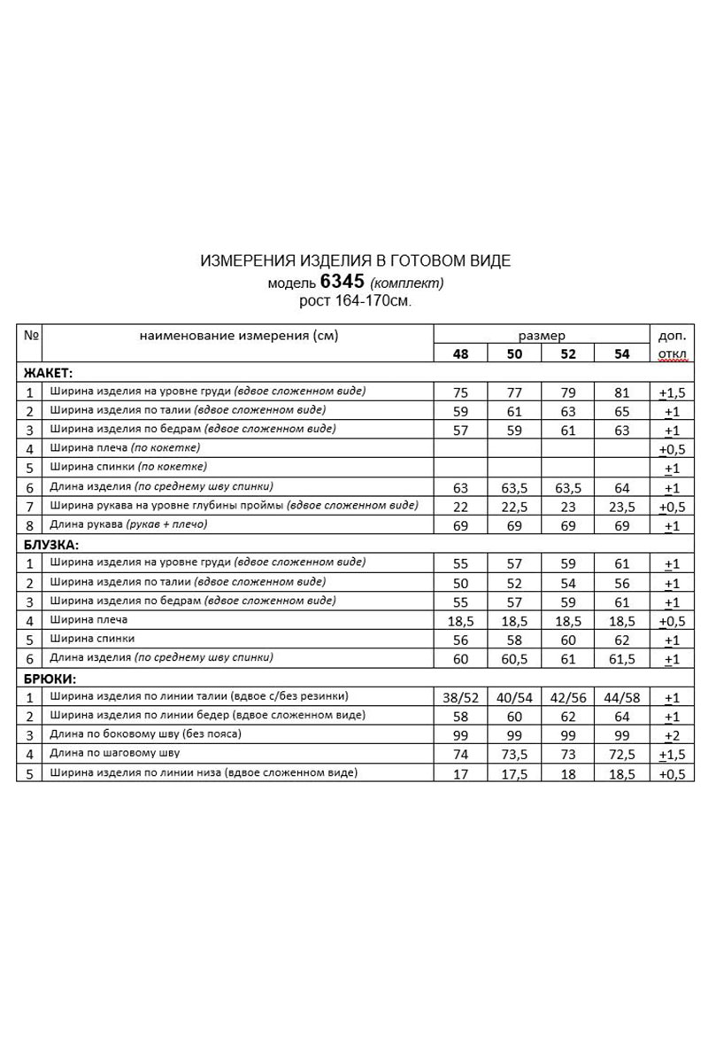 Состав: жакет: вискоза 89%, акрил 8%, эластан 3%; блуза: ПЭ 68%, вискоза 27%, спандекс 5%; брюки: вискоза 60%, ПЭ 37%, спандекс 3%