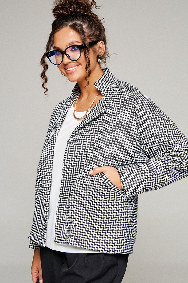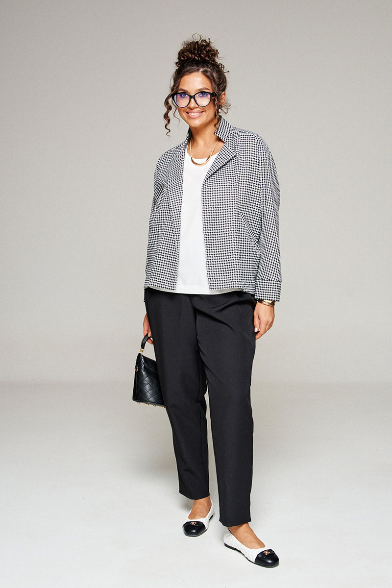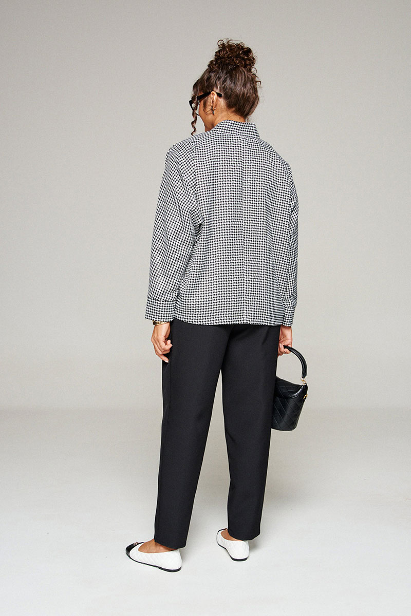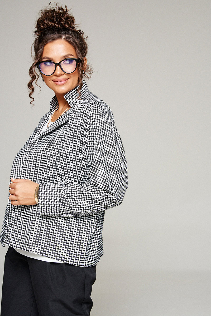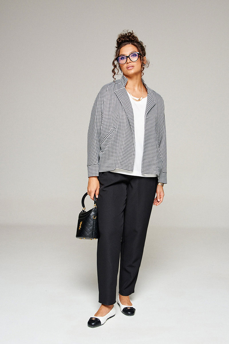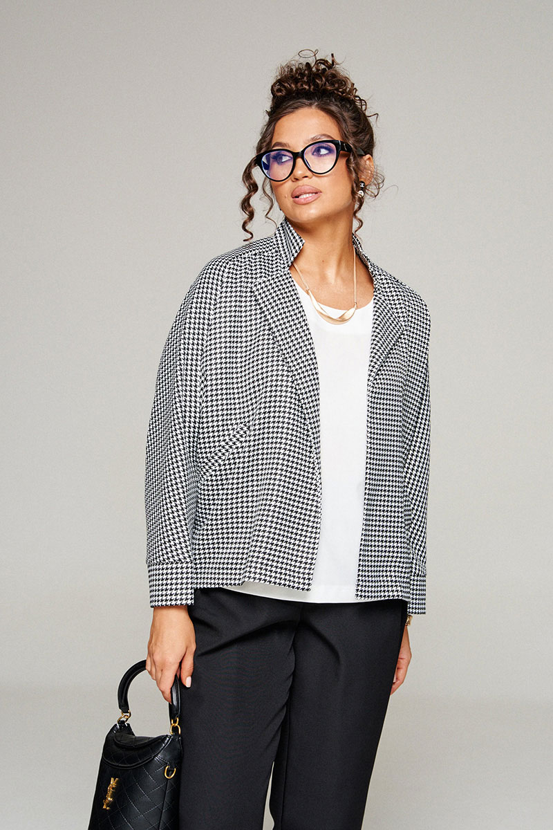 Жакет свободного силуэта выполнен из смесового костюмного полотна актуального дизайна.