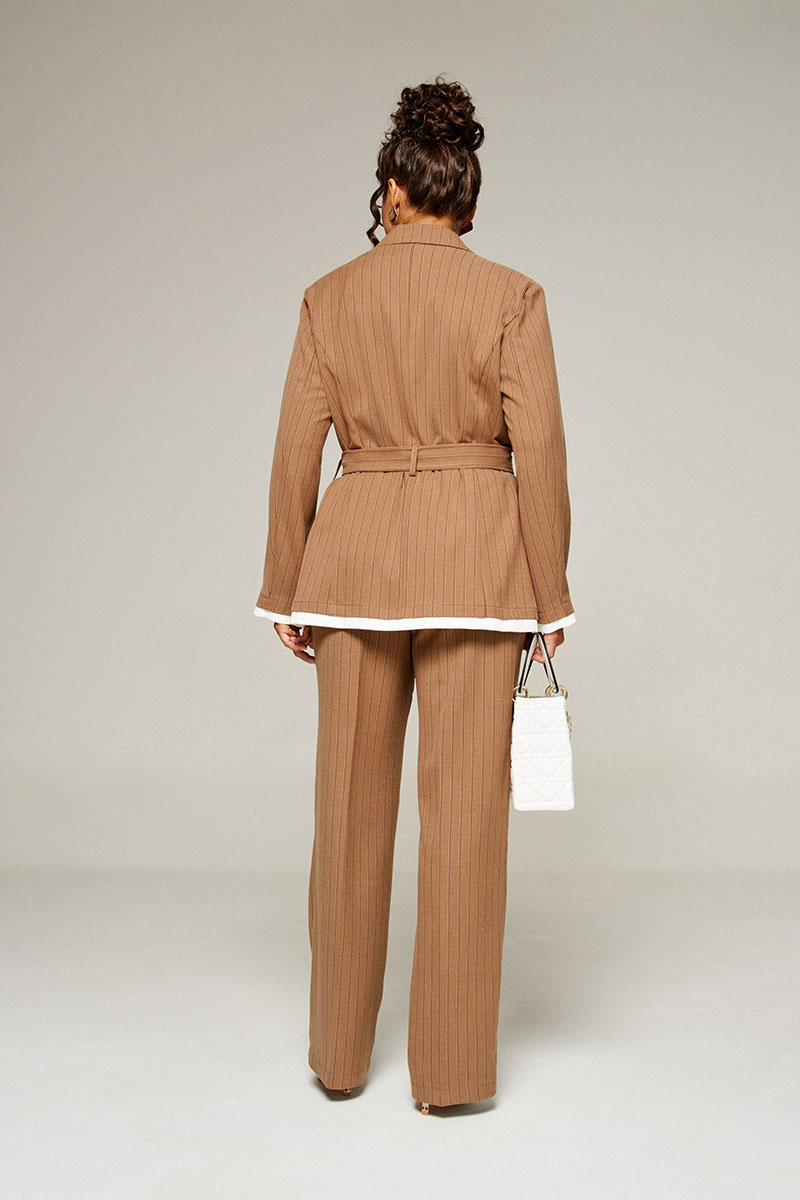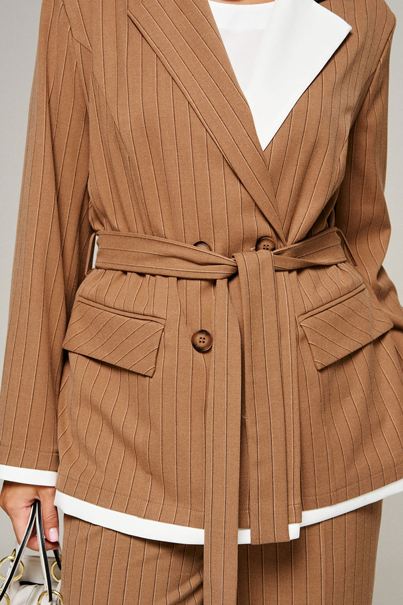 Жакет классический двубортный прямого силуэта длиной ниже бедер и с декоративными элементами в виде контрастных беек. К жакету прилагается пояс-завязка.