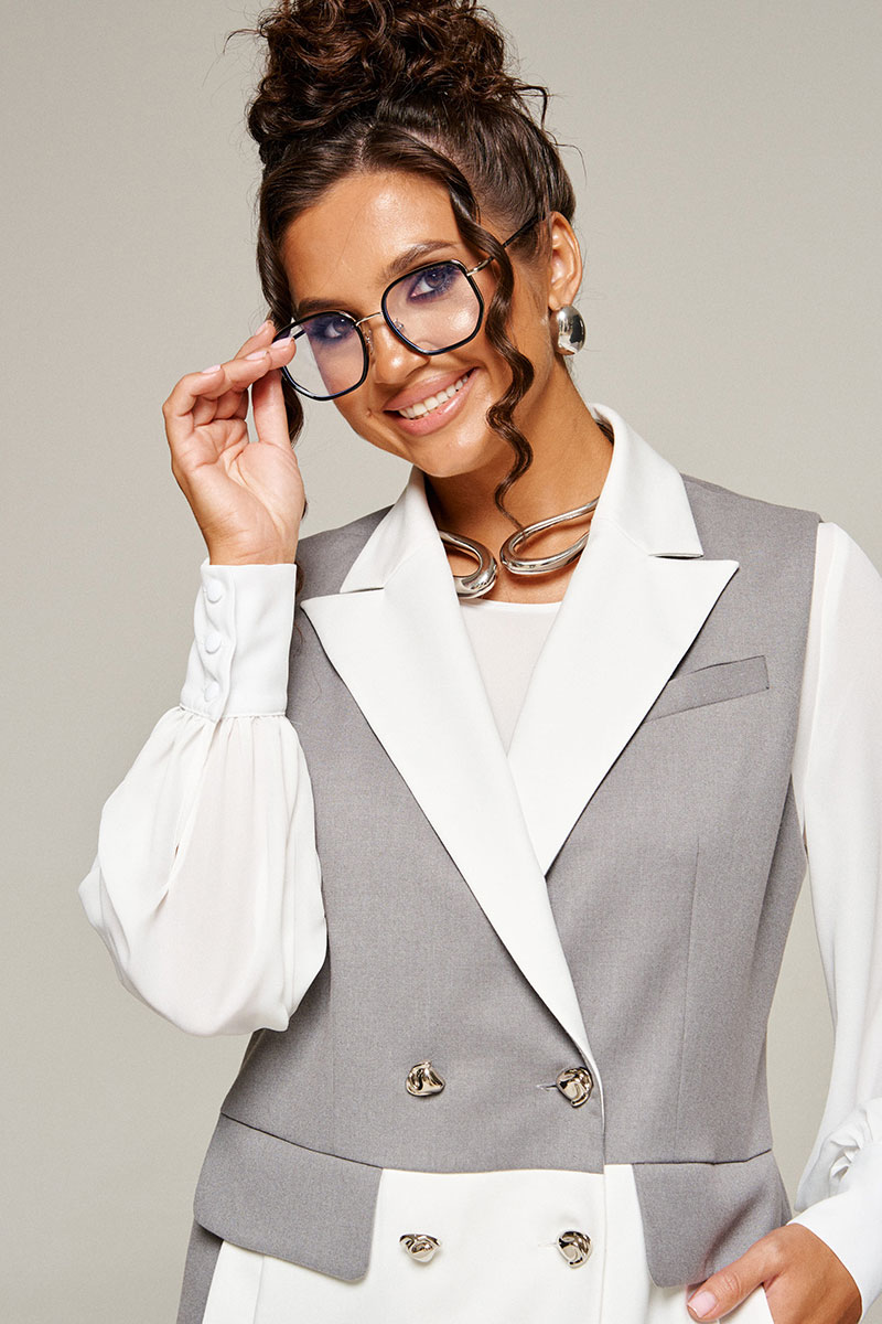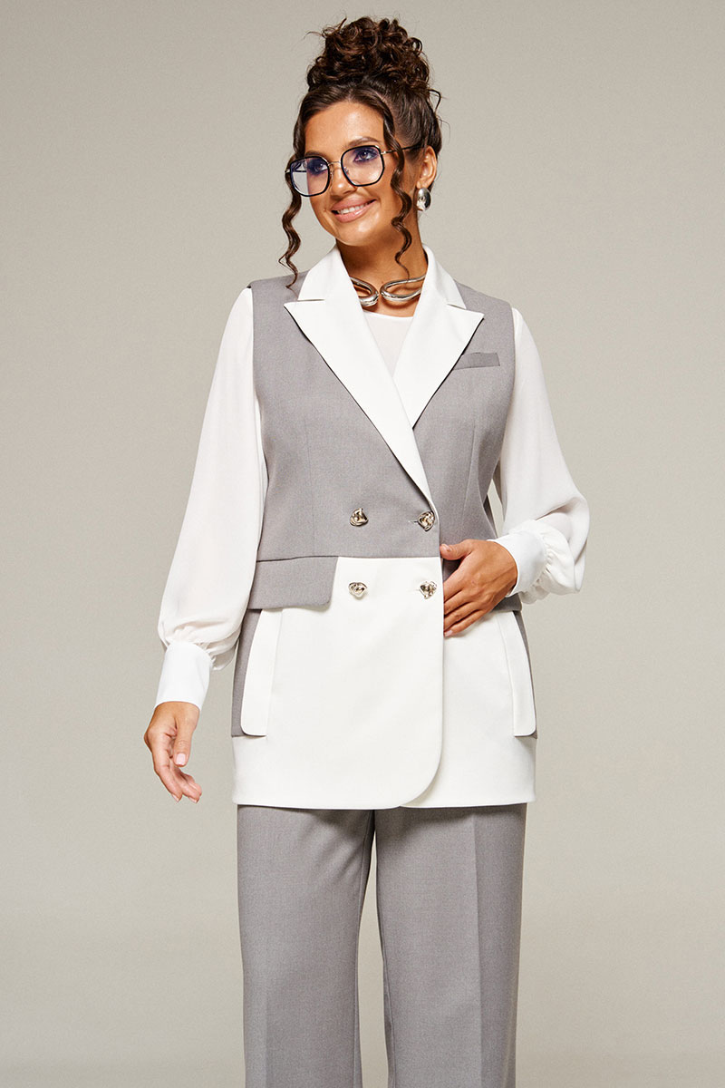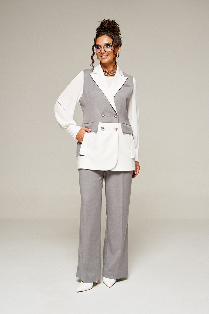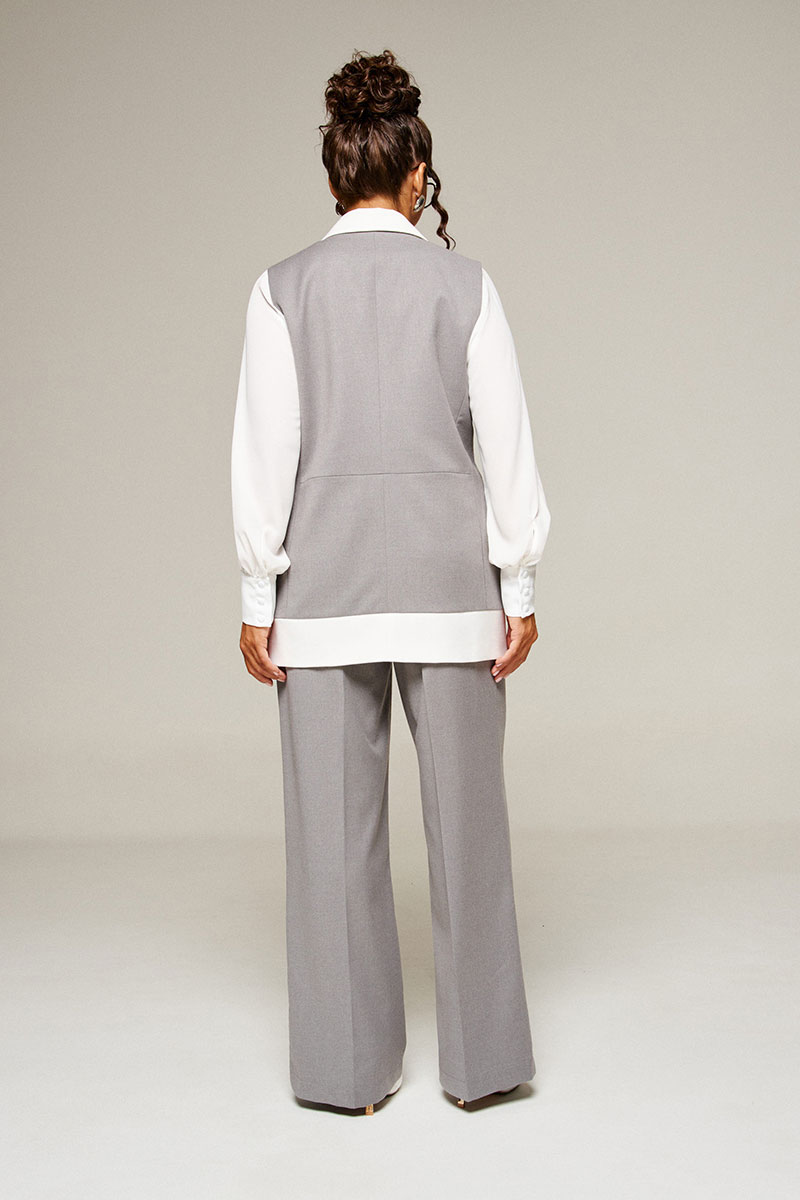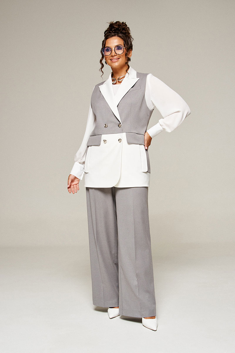 Комплект женский 3-ёх предметный: жилет, брюки, блузка в деловом стиле. Выполнен из костюмно-смесового полотна с нежной, гладко-бархатистой фактурой, приятной на ощупь и матовой поверхностью в контрастном сочетании актуальных оттенков.