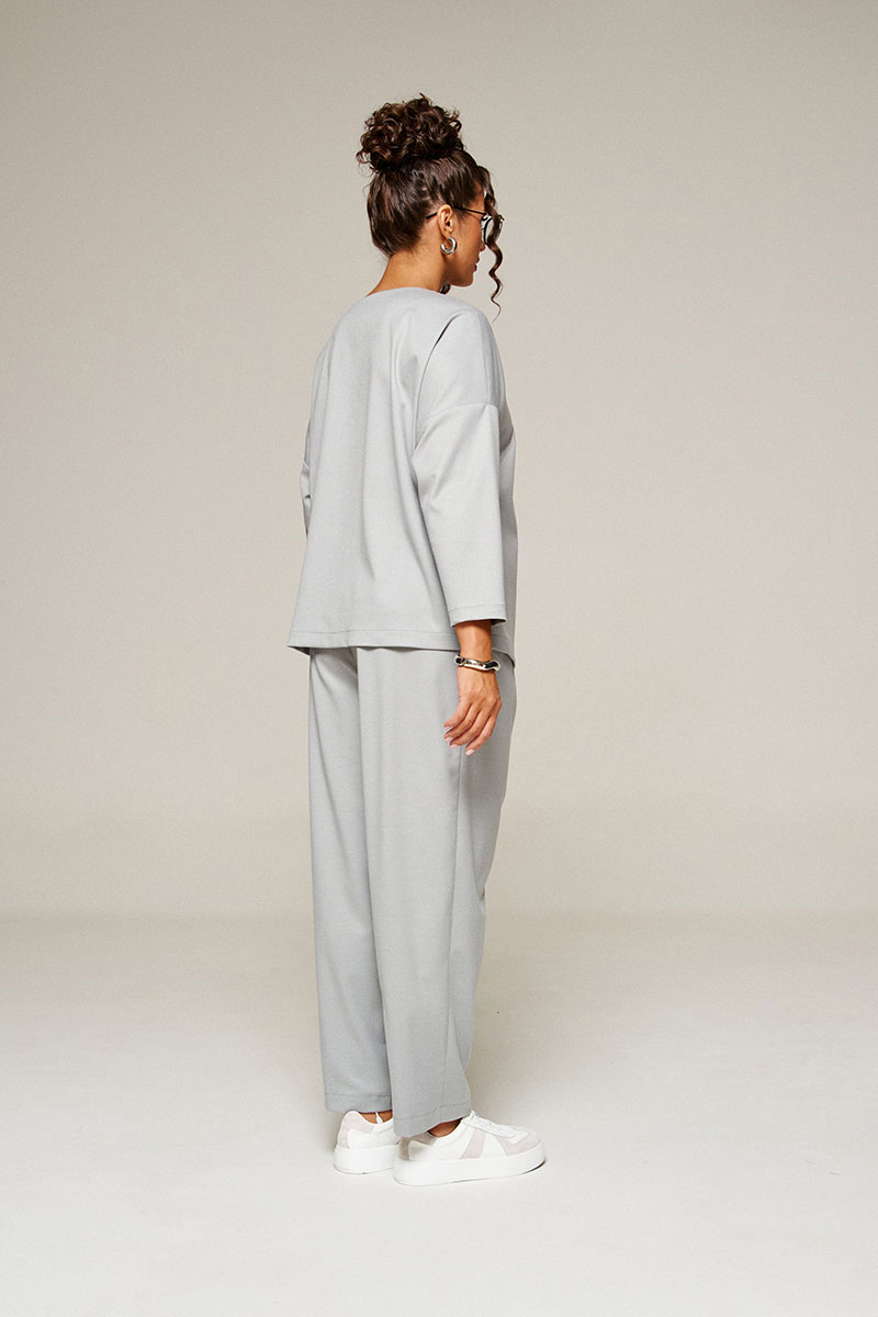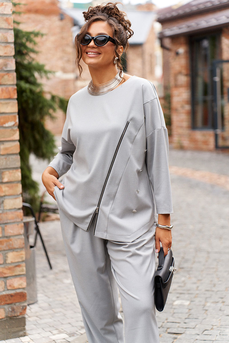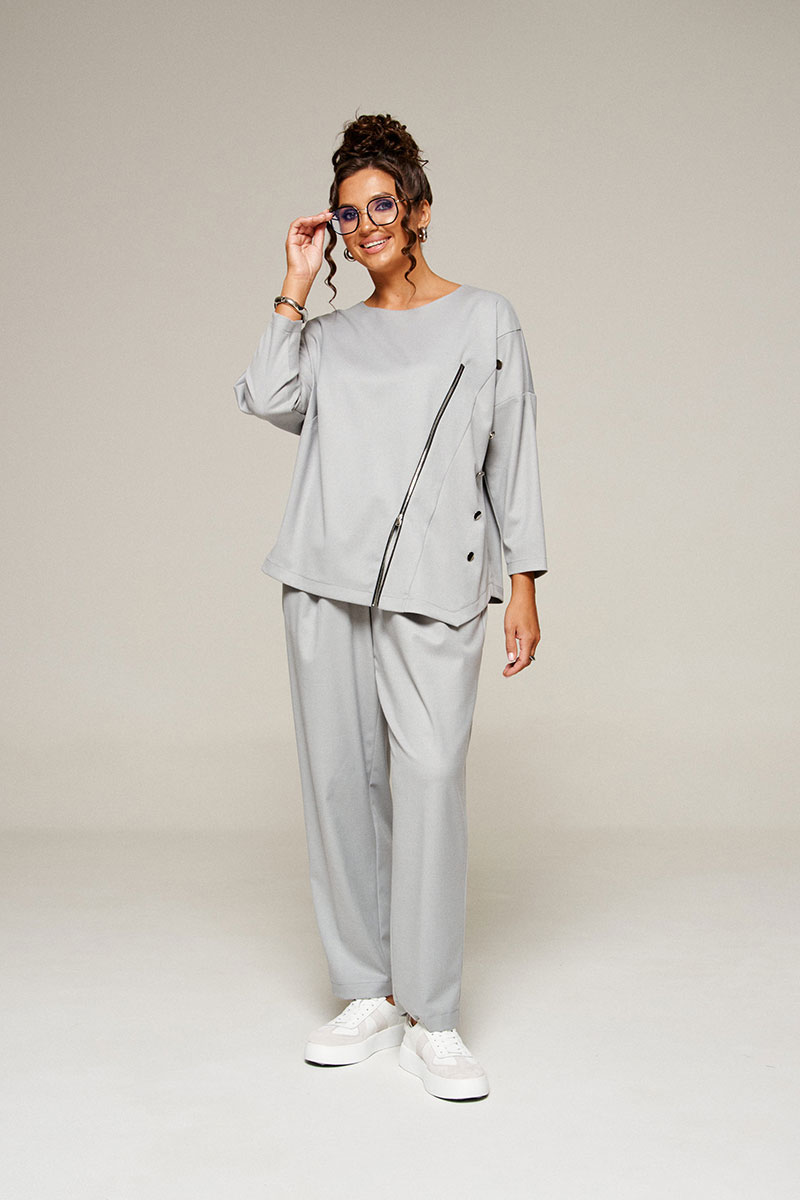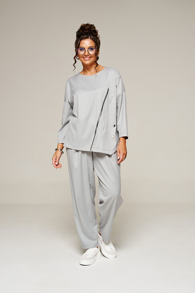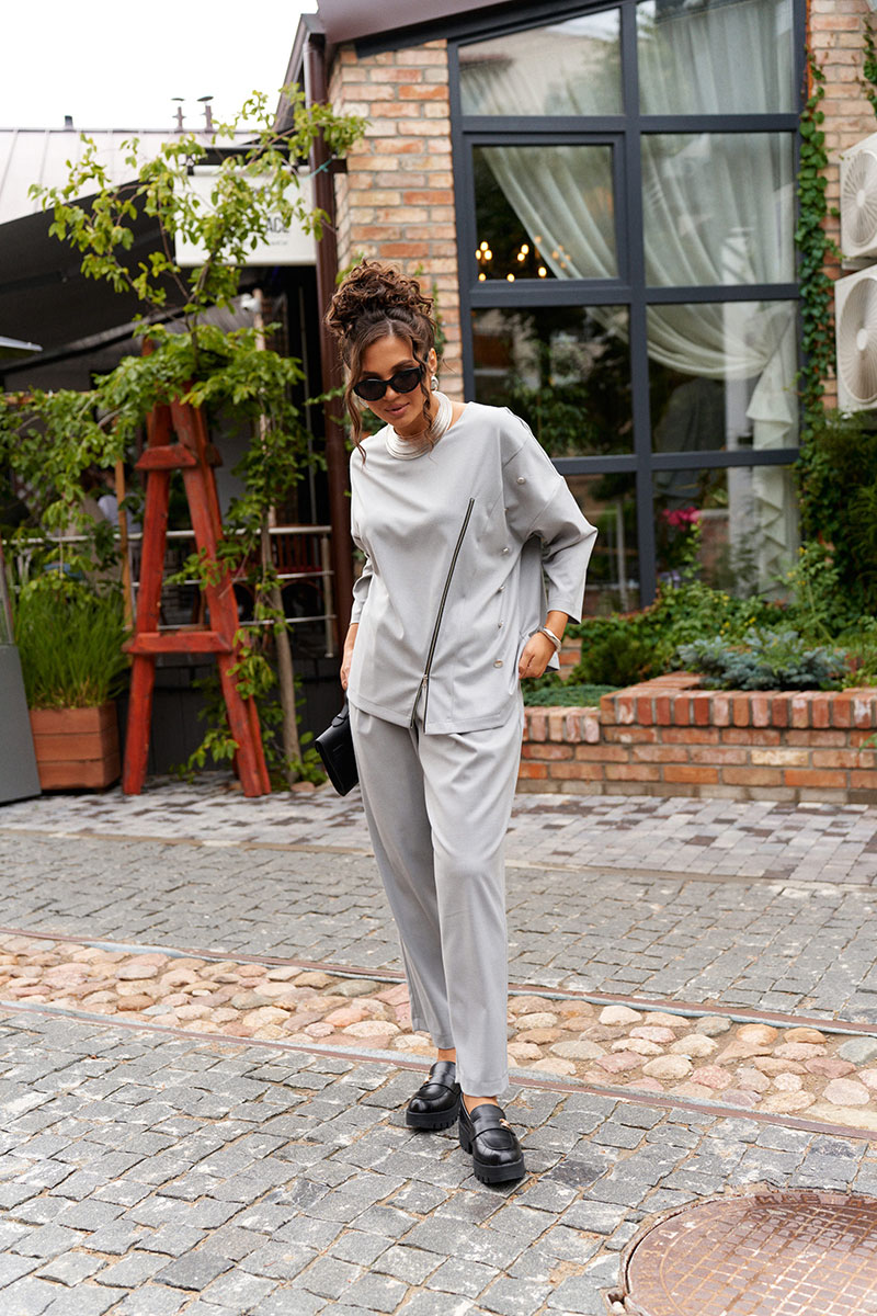 Костюм состоит из 2-х предметов одежды: блузона и брюк. Выполнен из костюмной ткани, мягкой и приятной на ощупь, актуальной расцветки.