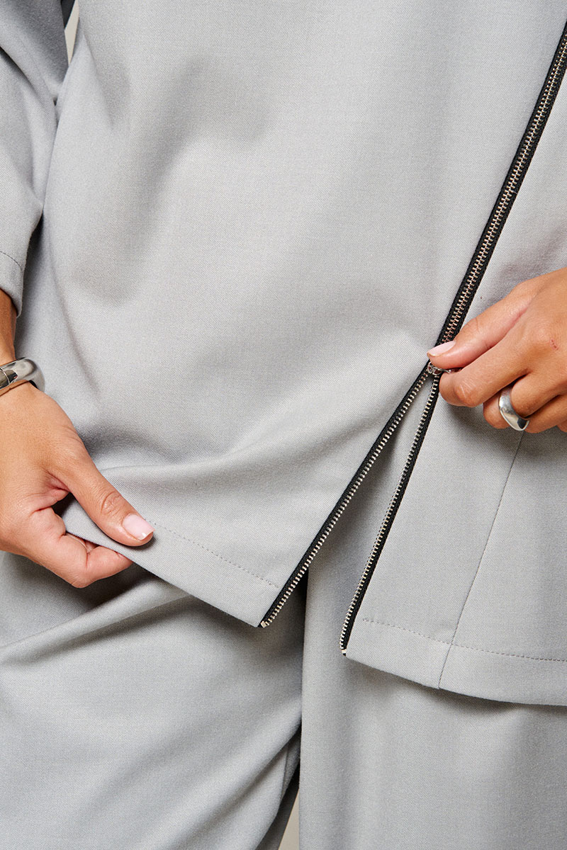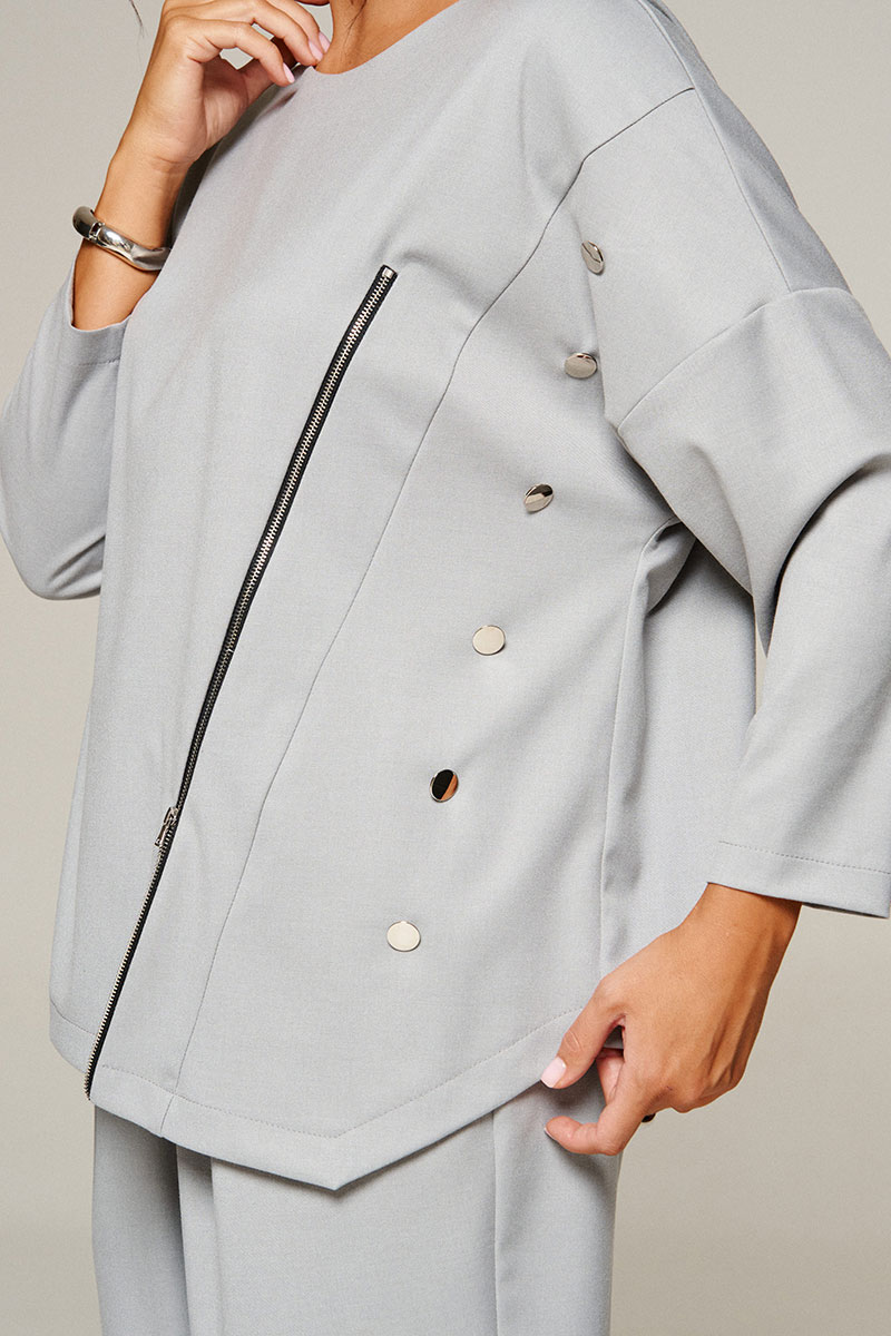 Перед из двух асимметричных деталей. Правая часть с нагрудной вытачкой от бокового шва и с отделочным элементом - молния, левая с отелочными пуговицами. Спинка цельная.