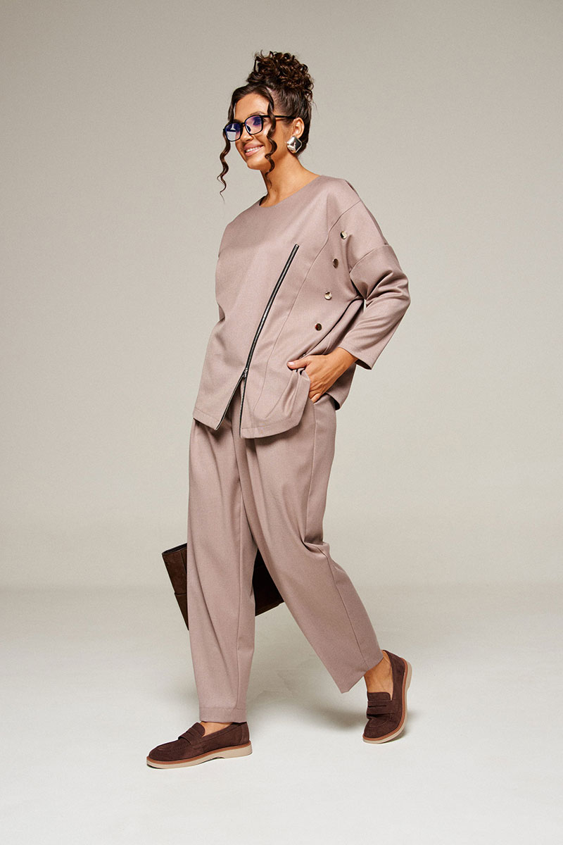 Костюм состоит из 2-х предметов одежды: блузона и брюк. Выполнен из костюмной ткани, мягкой и приятной на ощупь, актуальной расцветки.